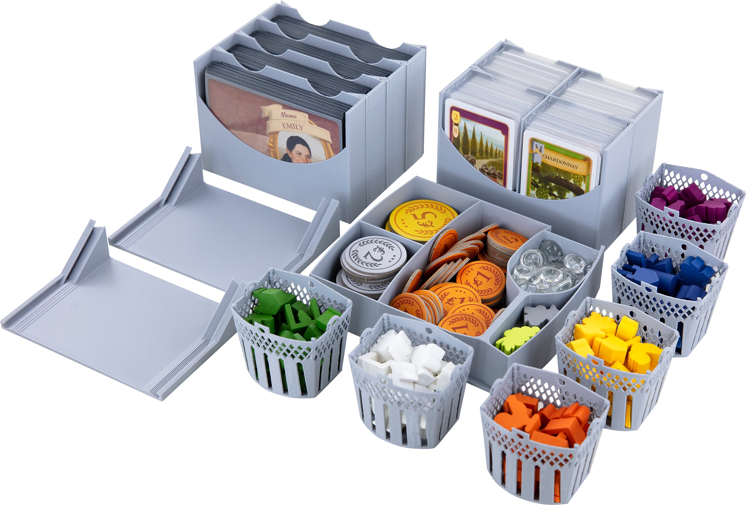 - The Organizer fits into the original core game box and offers space for the entire game material from the “Viticulture: Essential Edition”.