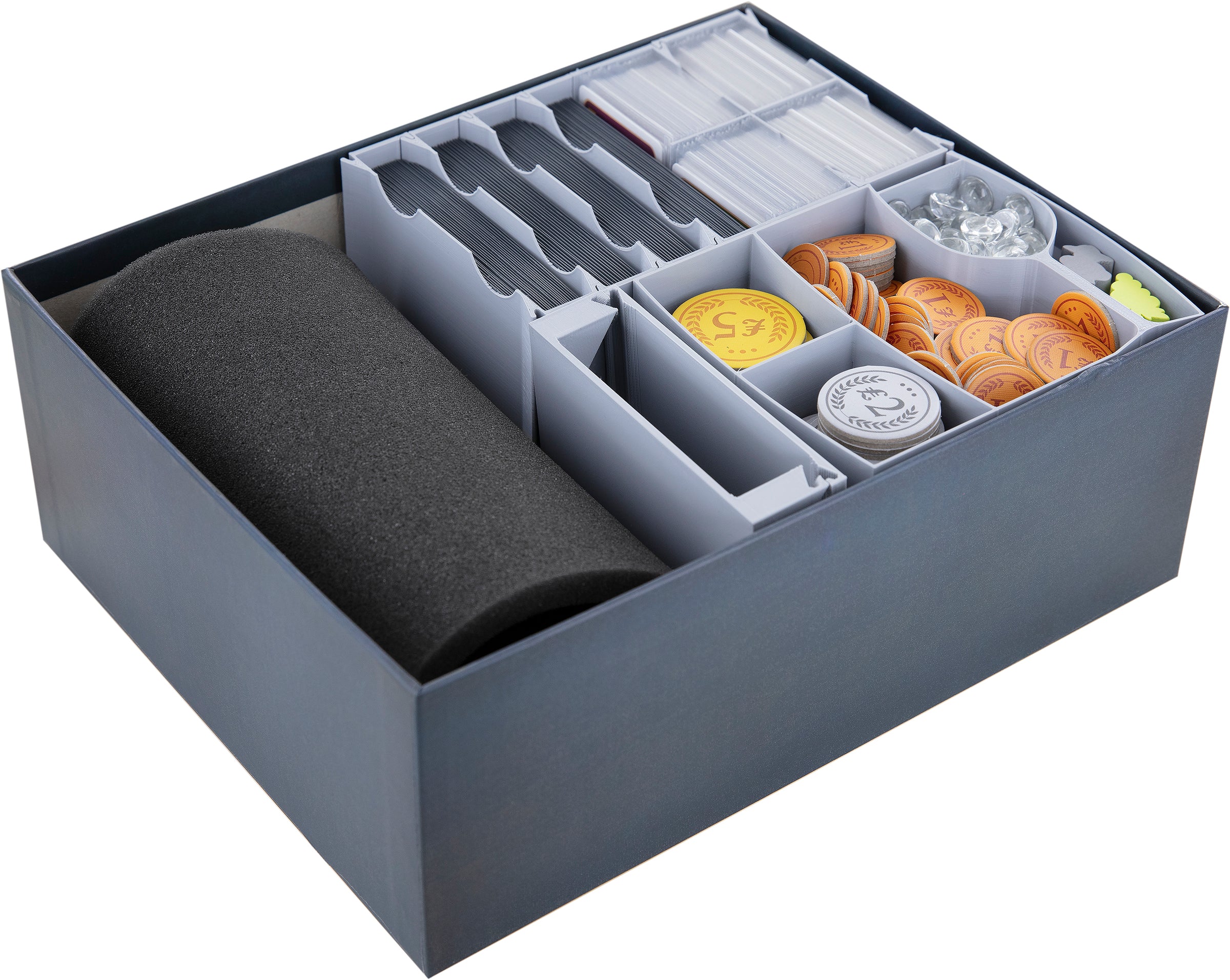 For more stability, we have included a foam mat in the set. Roll it up and place it next to the trays in the box. This gives the trays a tight fit in the board game box and prevents them from sliding around.