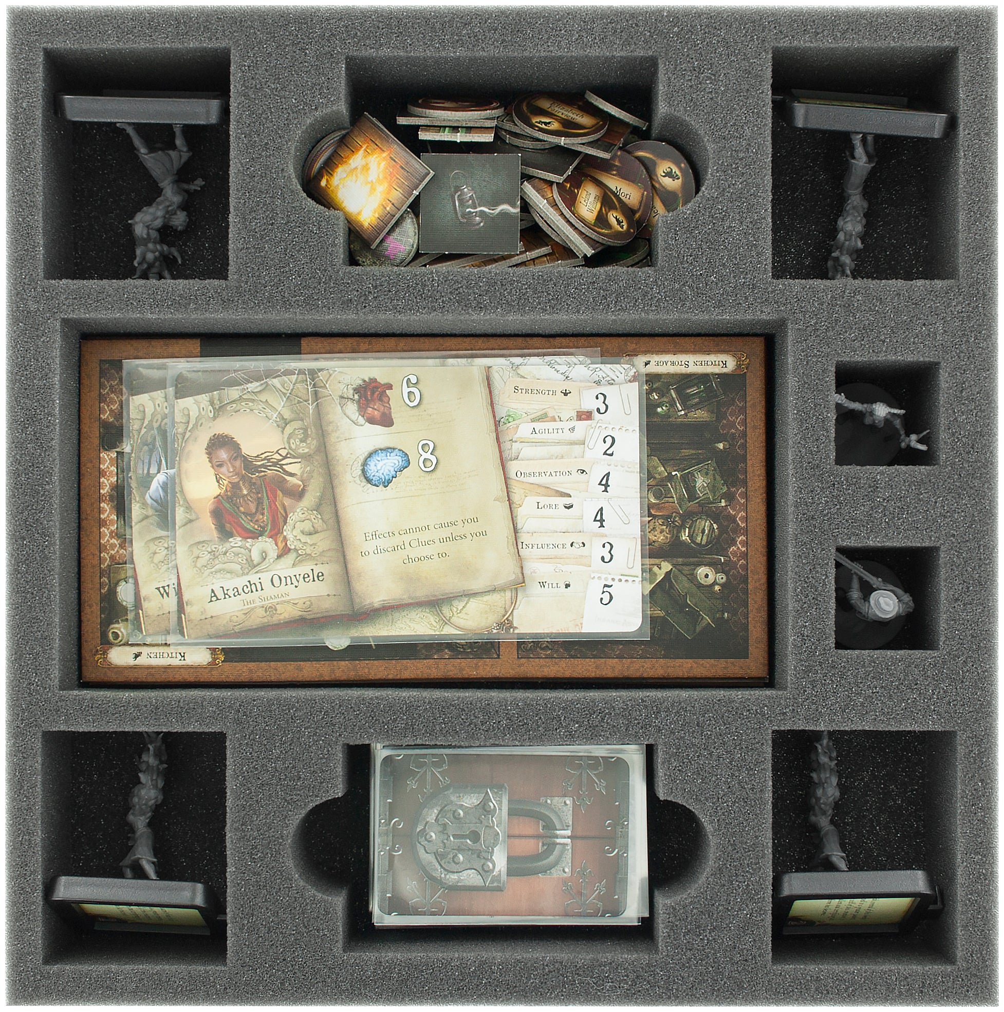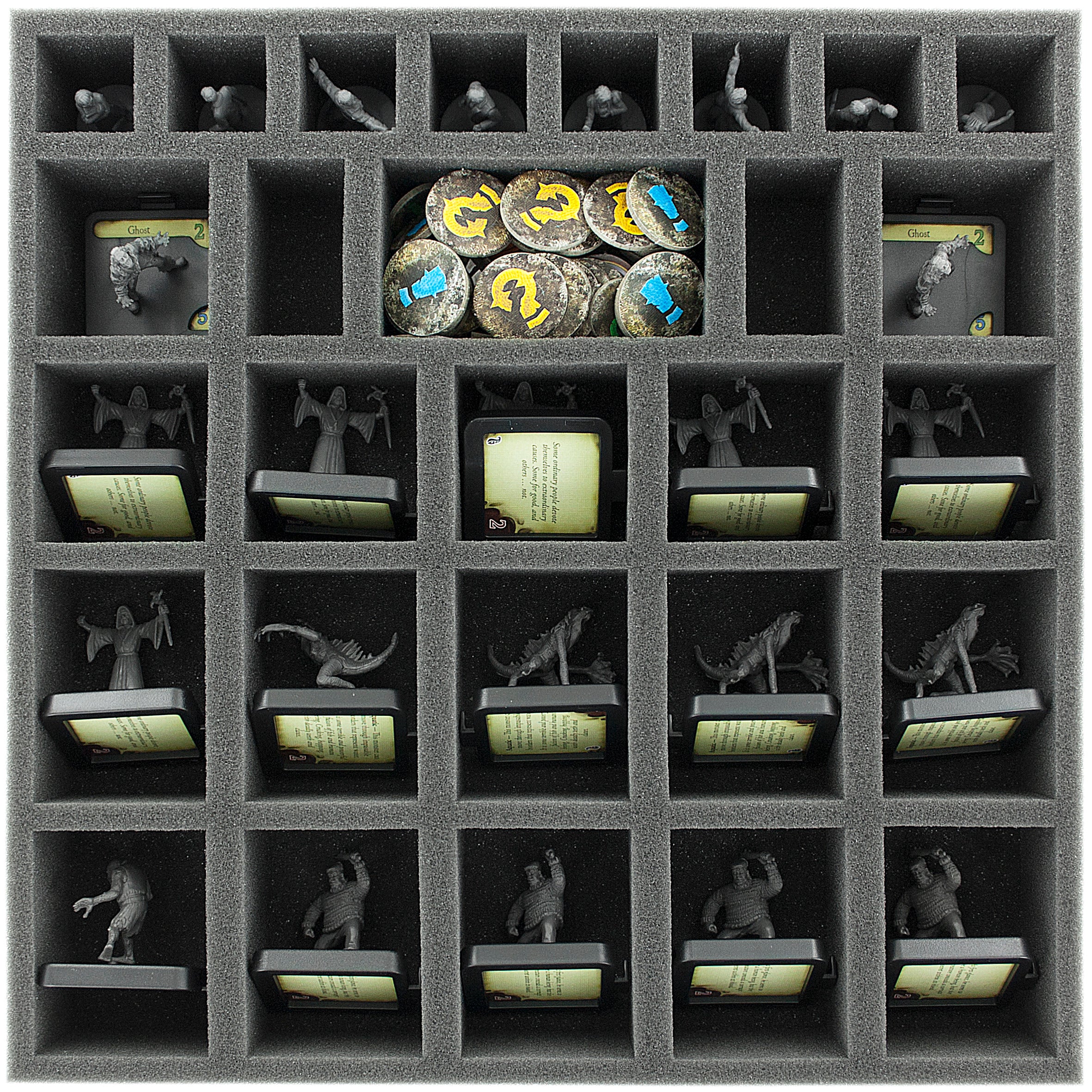 This gives you everything you need to store your collection properly. The five foam sets will help you to sort the miniatures and the game material in the original board game boxes.