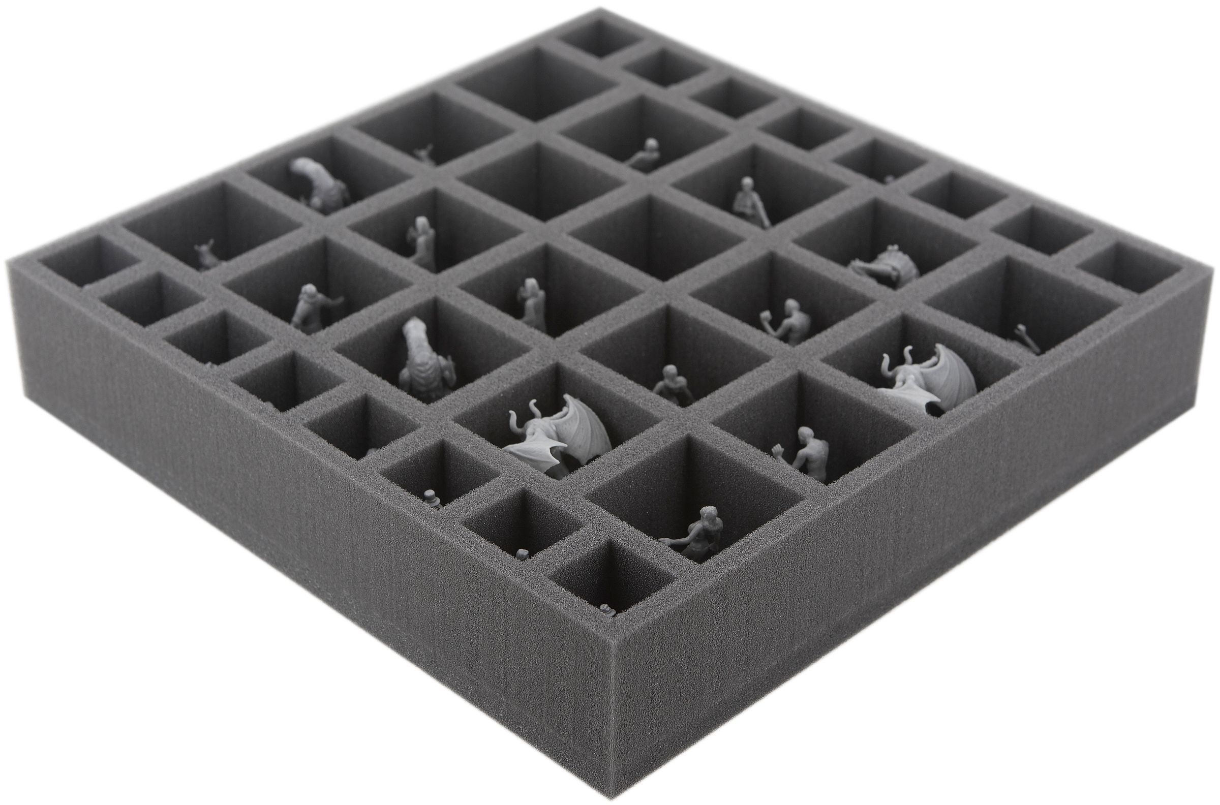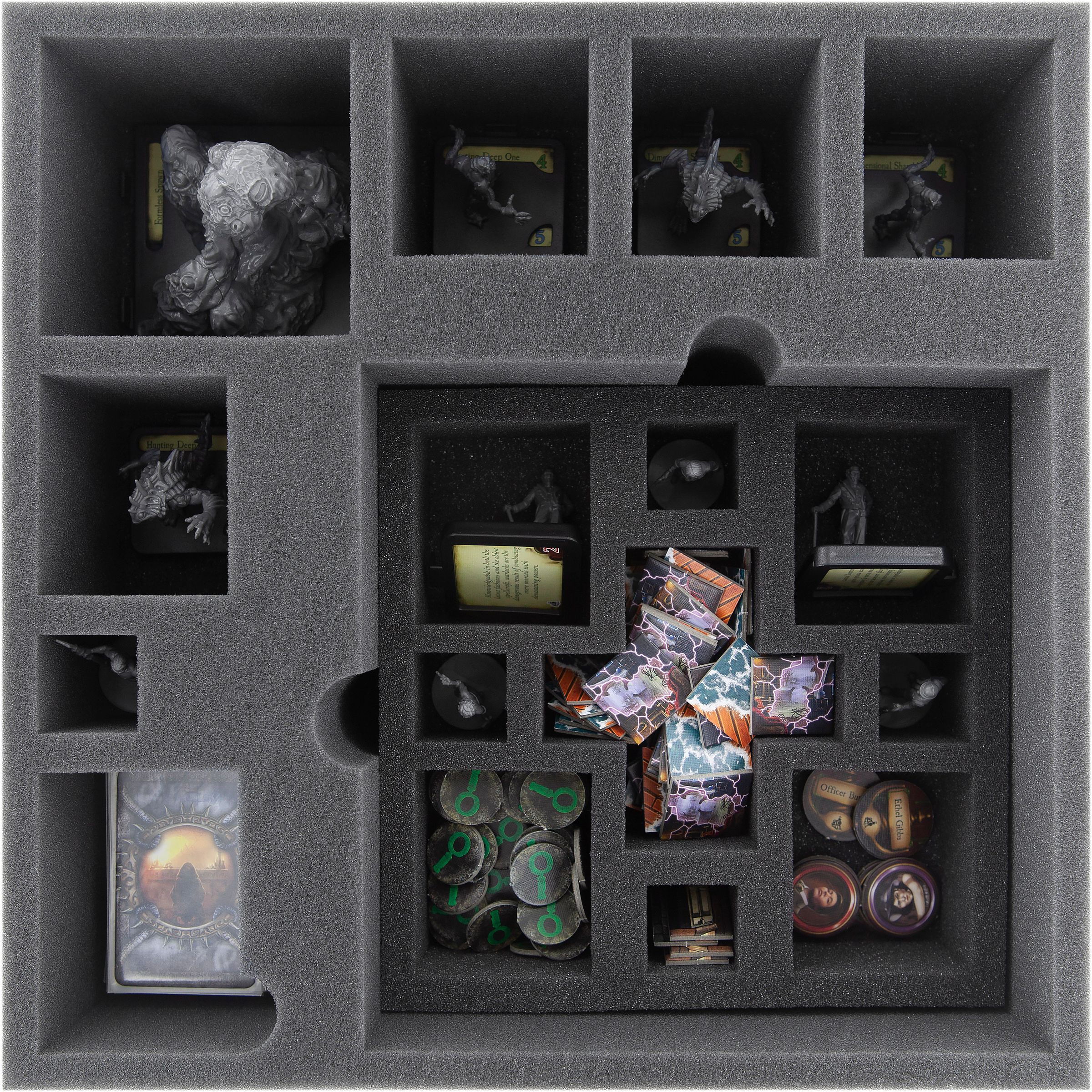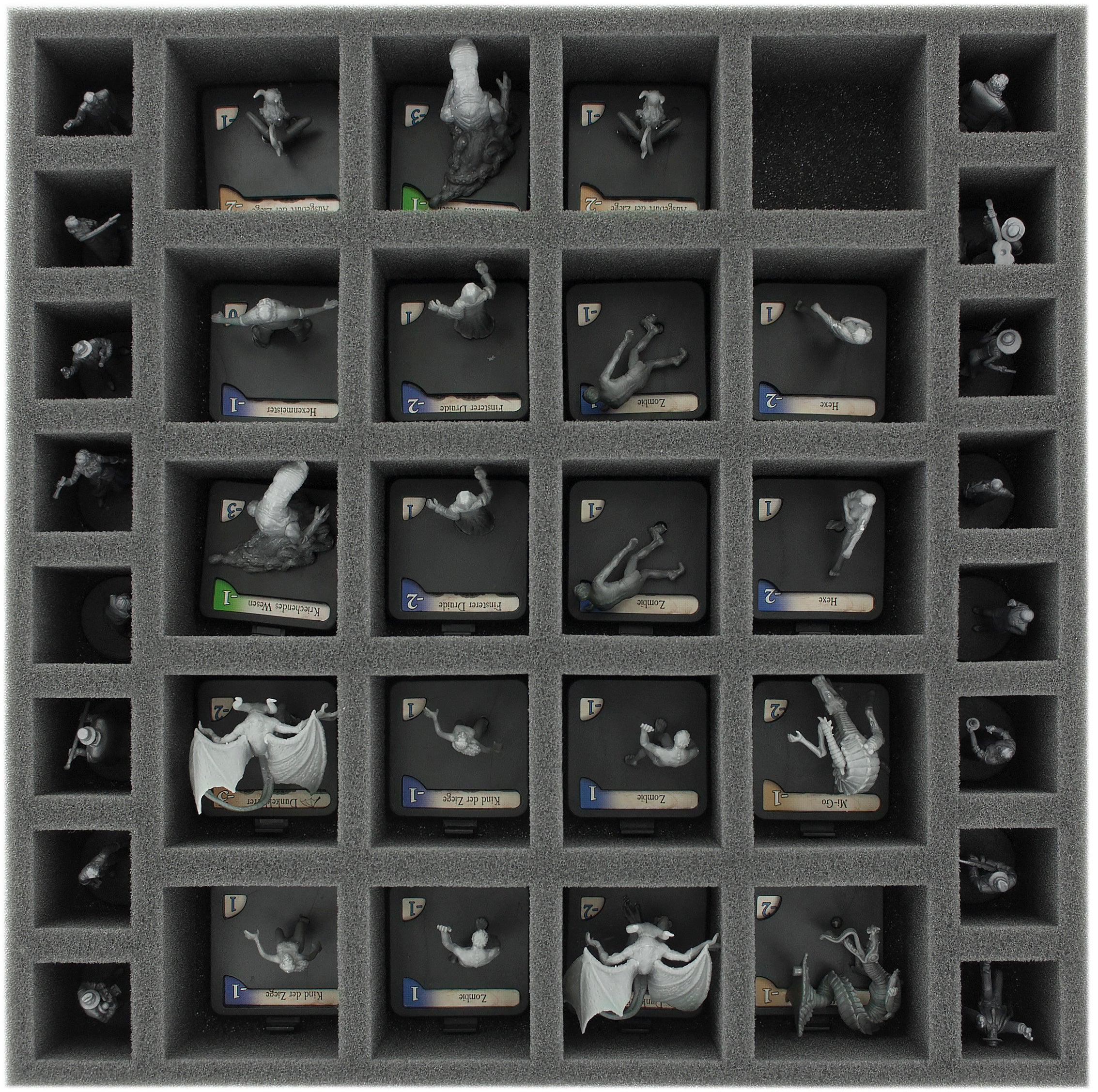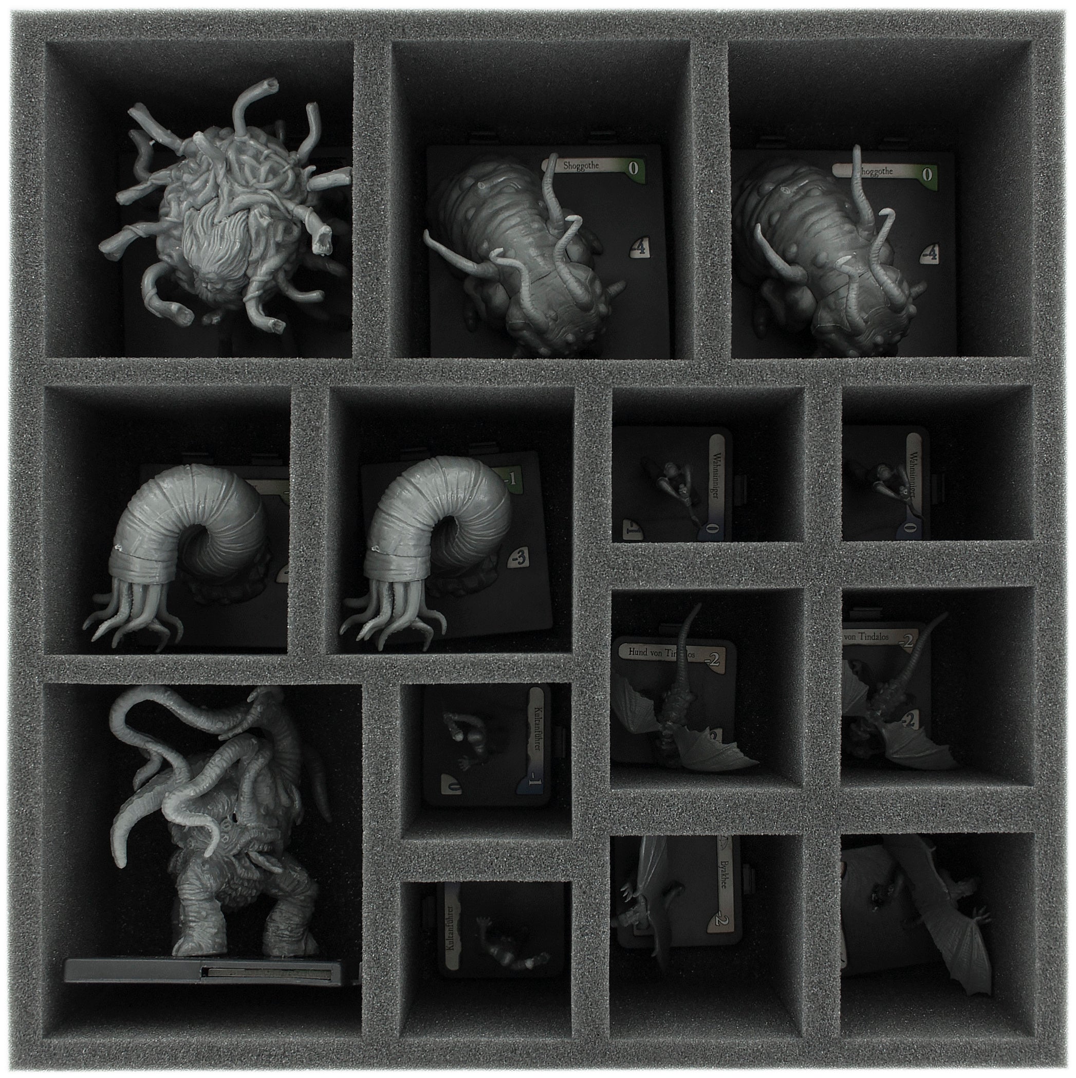 From the Shoggothe to the Chtonians to the Hounds of Tindalos and the investigators - every figure (including Base) gets a suitable compartment. Thanks to the custom-fit cut, it is ensured that the miniatures stay in place during transport. Nothing slips around and no figure has to share a compartment with another.