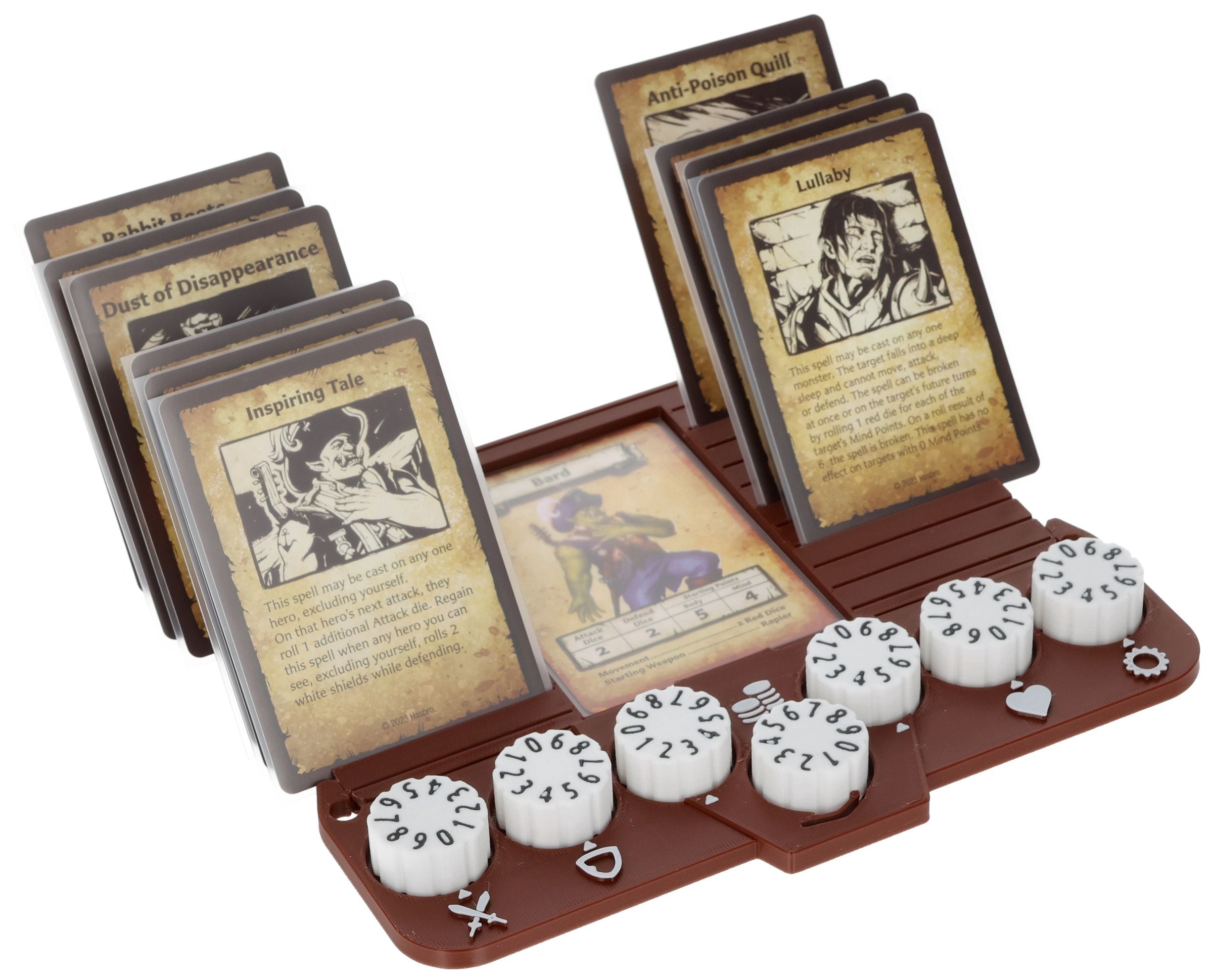- 23 slots and a storage compartment on the dashboard accommodate up to 24 game cards, such as equipment cards, treasure cards, magic cards, and rule summaries.