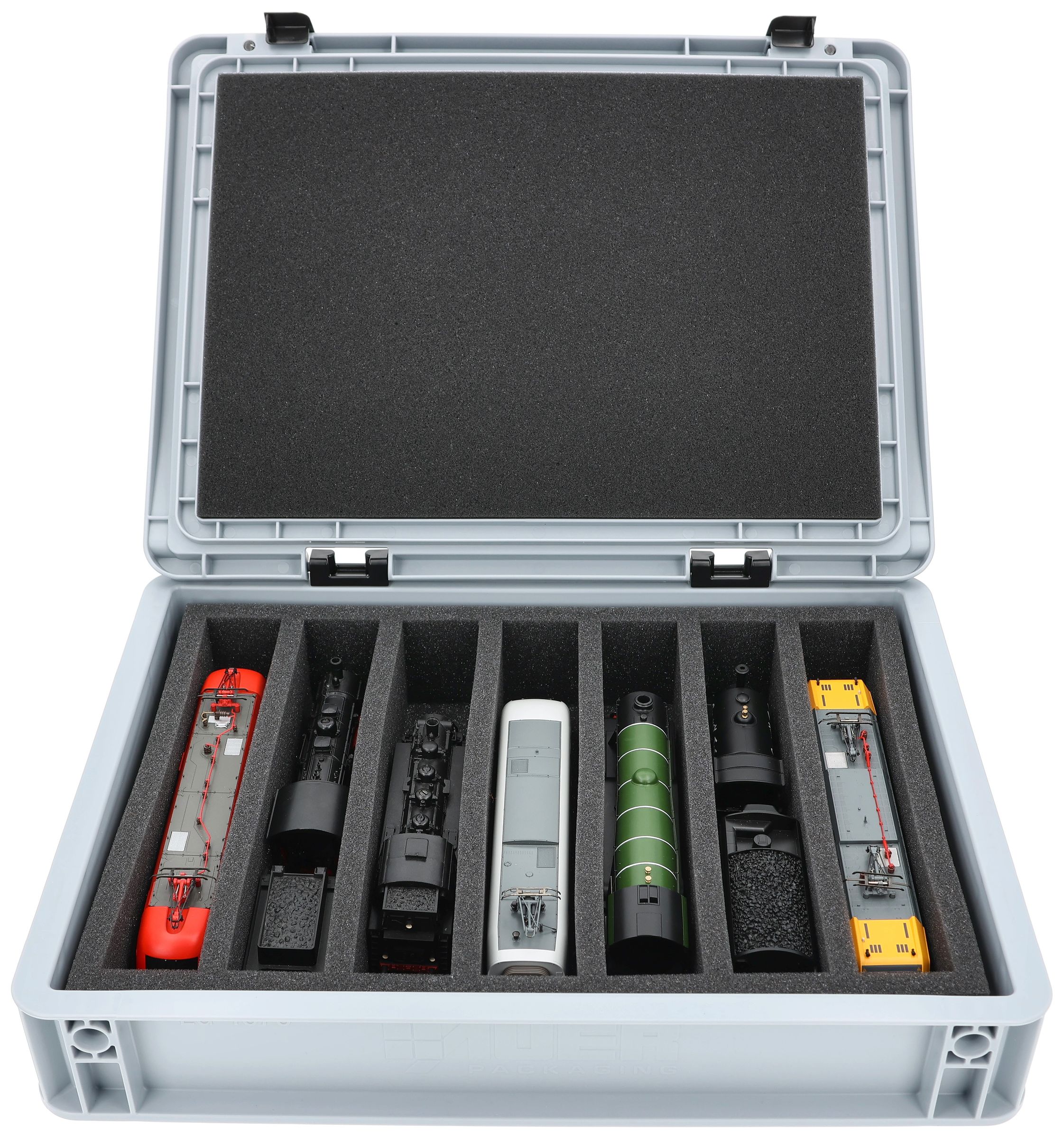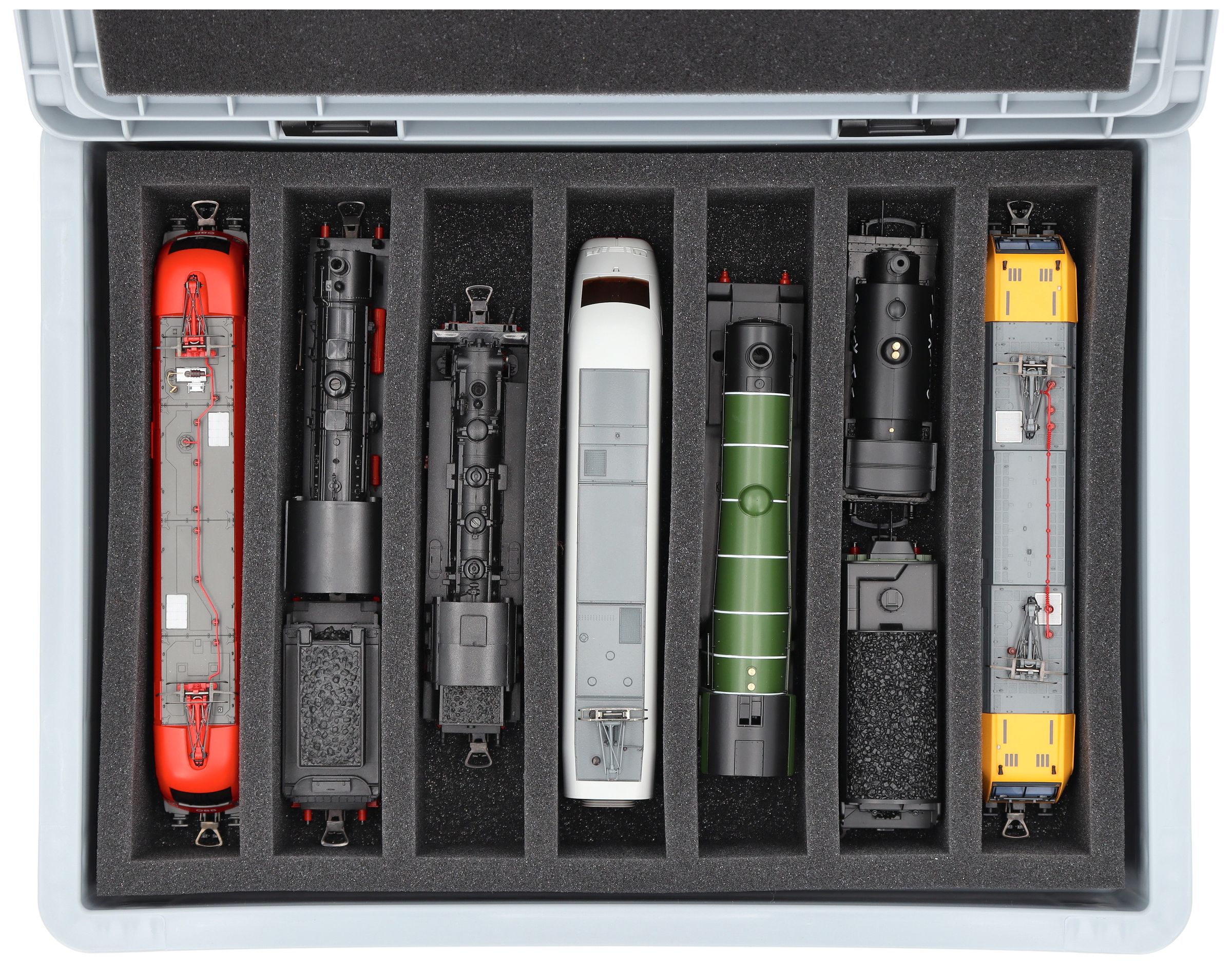 - 7 compartments - foam insert for upright storage of locomotives, wagons and vehicles