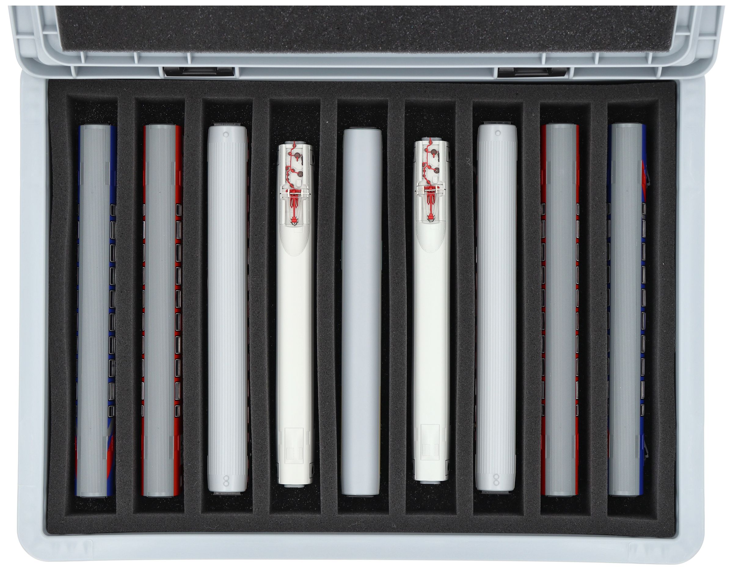 The 9 equal-sized compartments (each approx. 250 mm long x 30 mm wide x 40 mm deep) are specially designed for TT scale models. Depending on their length, several wagons or locomotives can be placed side by side. The exact fit ensures that the models are securely fixed and do not slip during transport.