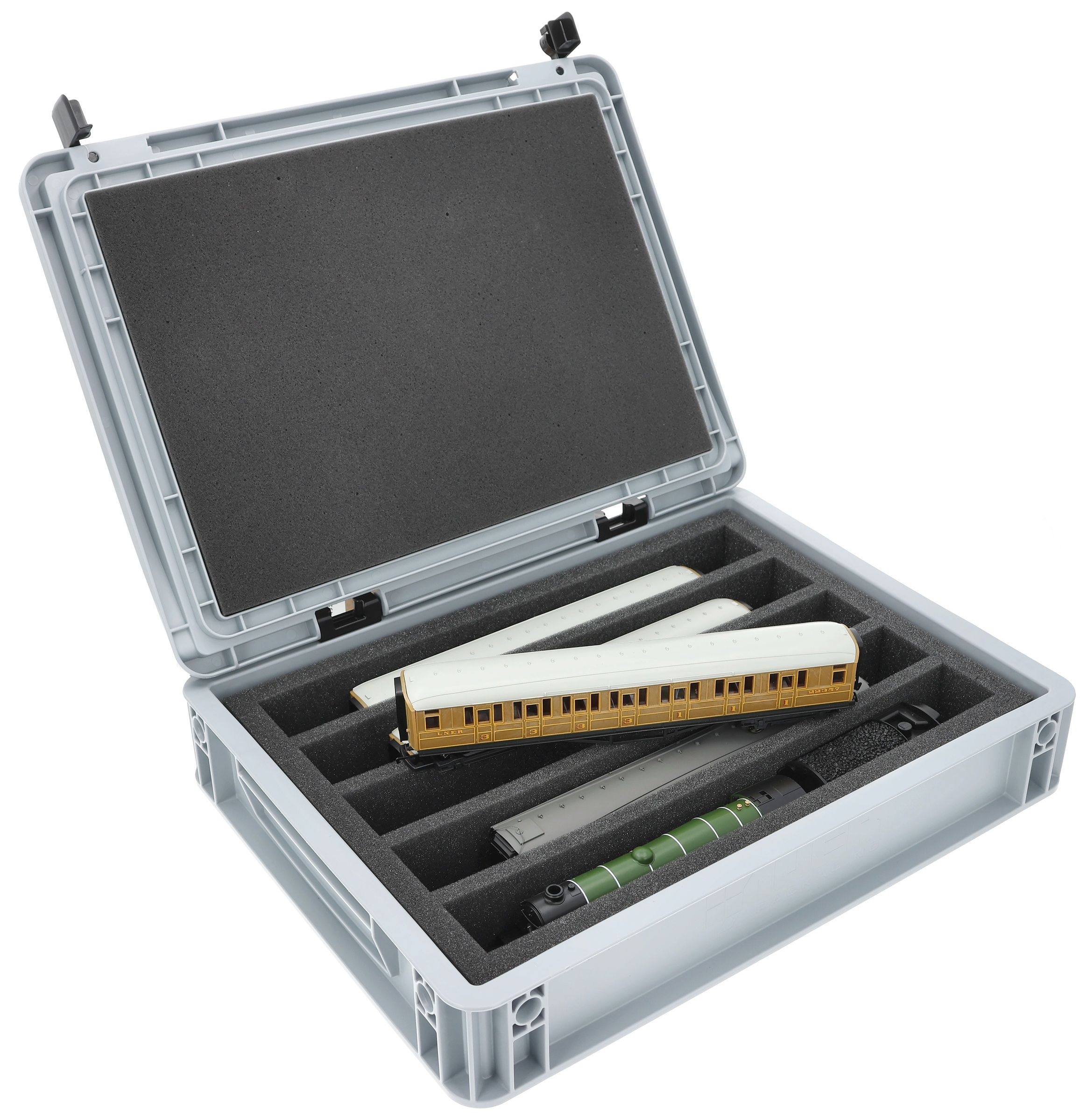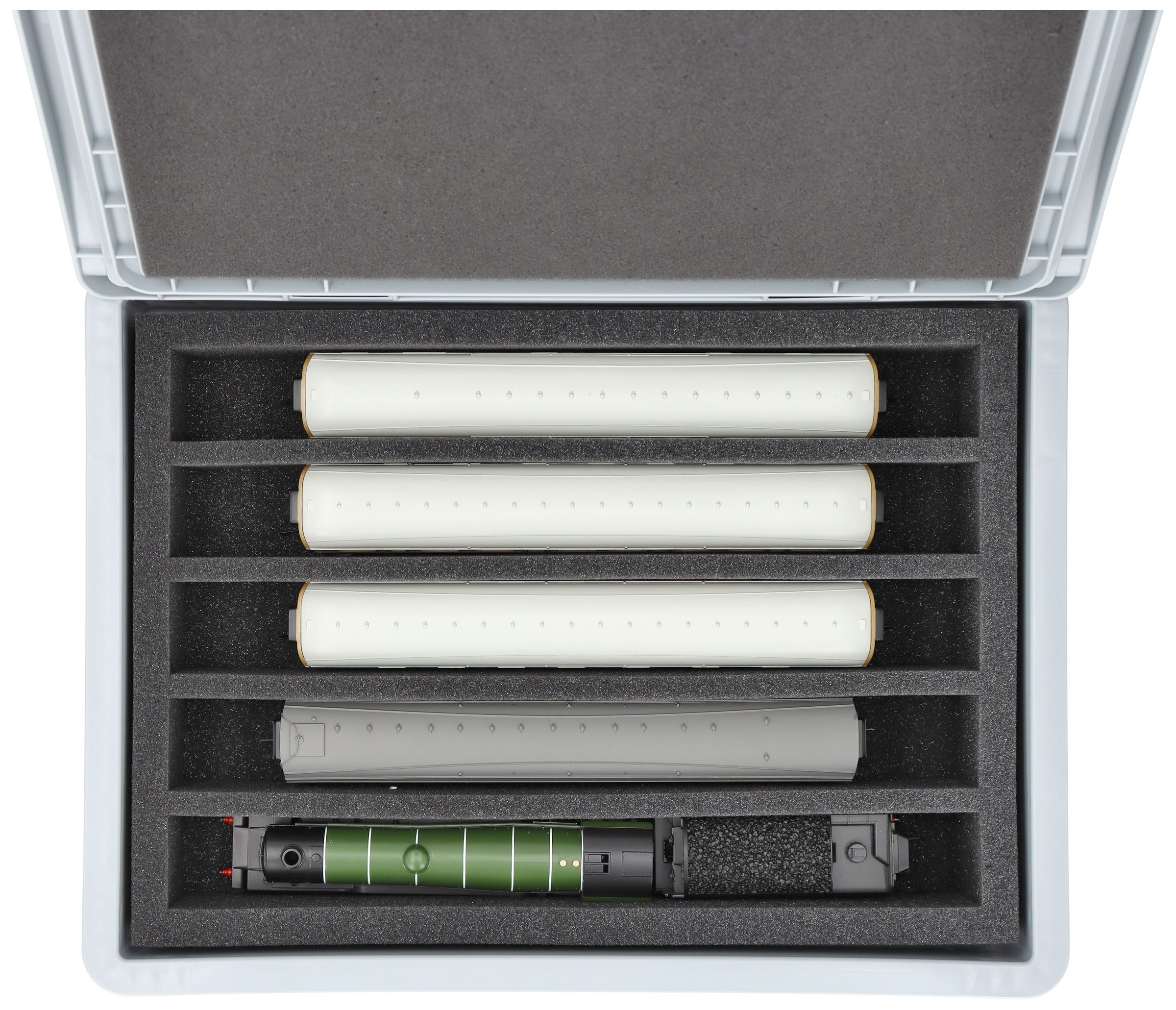 The eight compartments (each approx. 330 mm × 38 mm × 55 mm) are specially designed for 00 scale models. Depending on their length, several wagons or locomotives can be placed side by side. The exact fit ensures that the models are securely fixed and do not slip during transport.