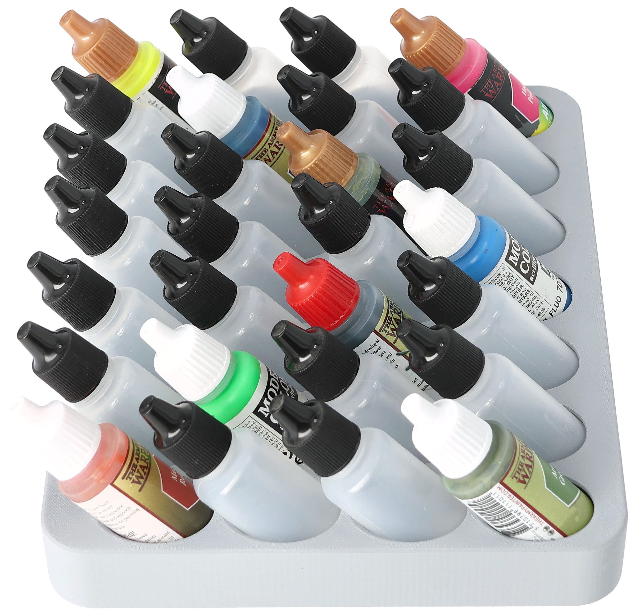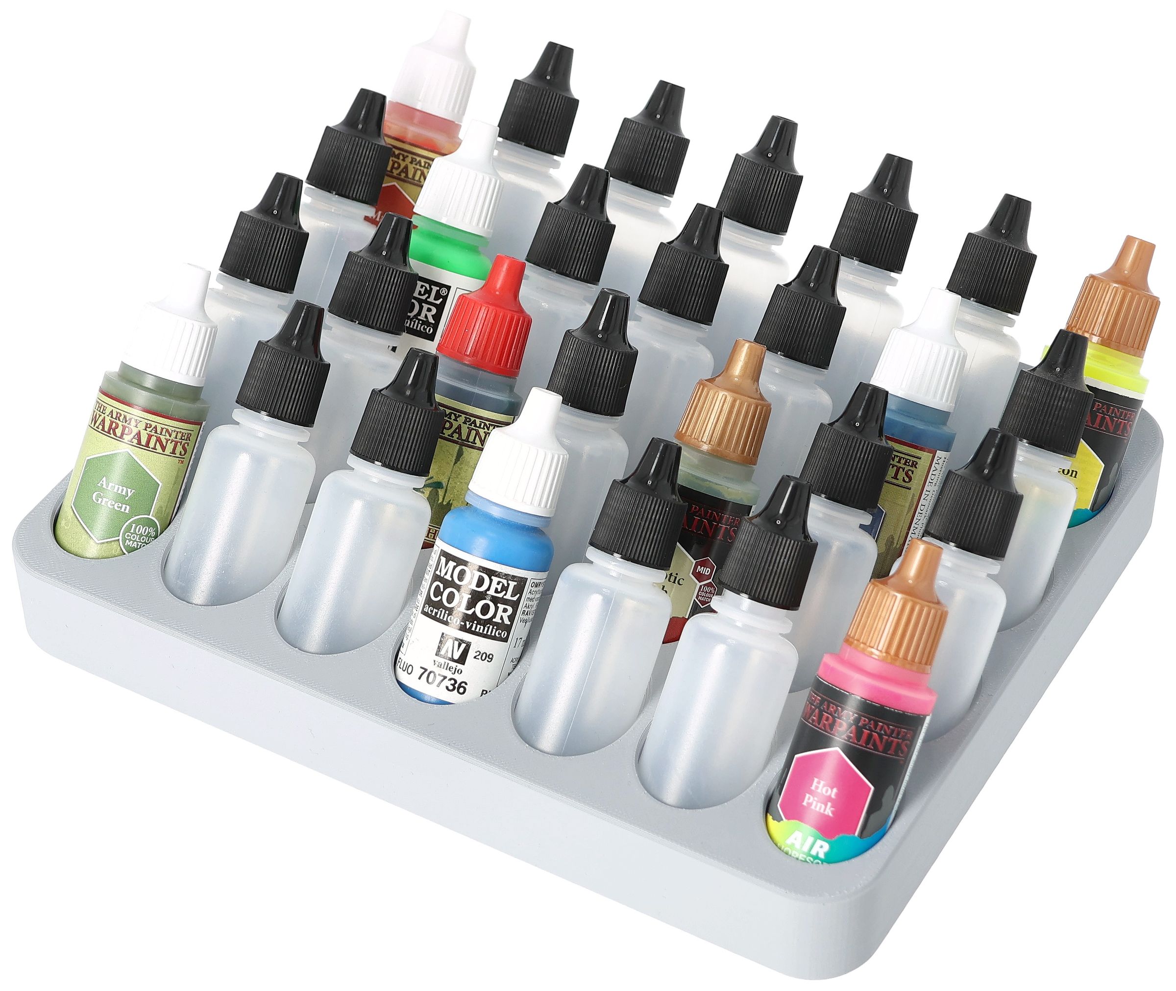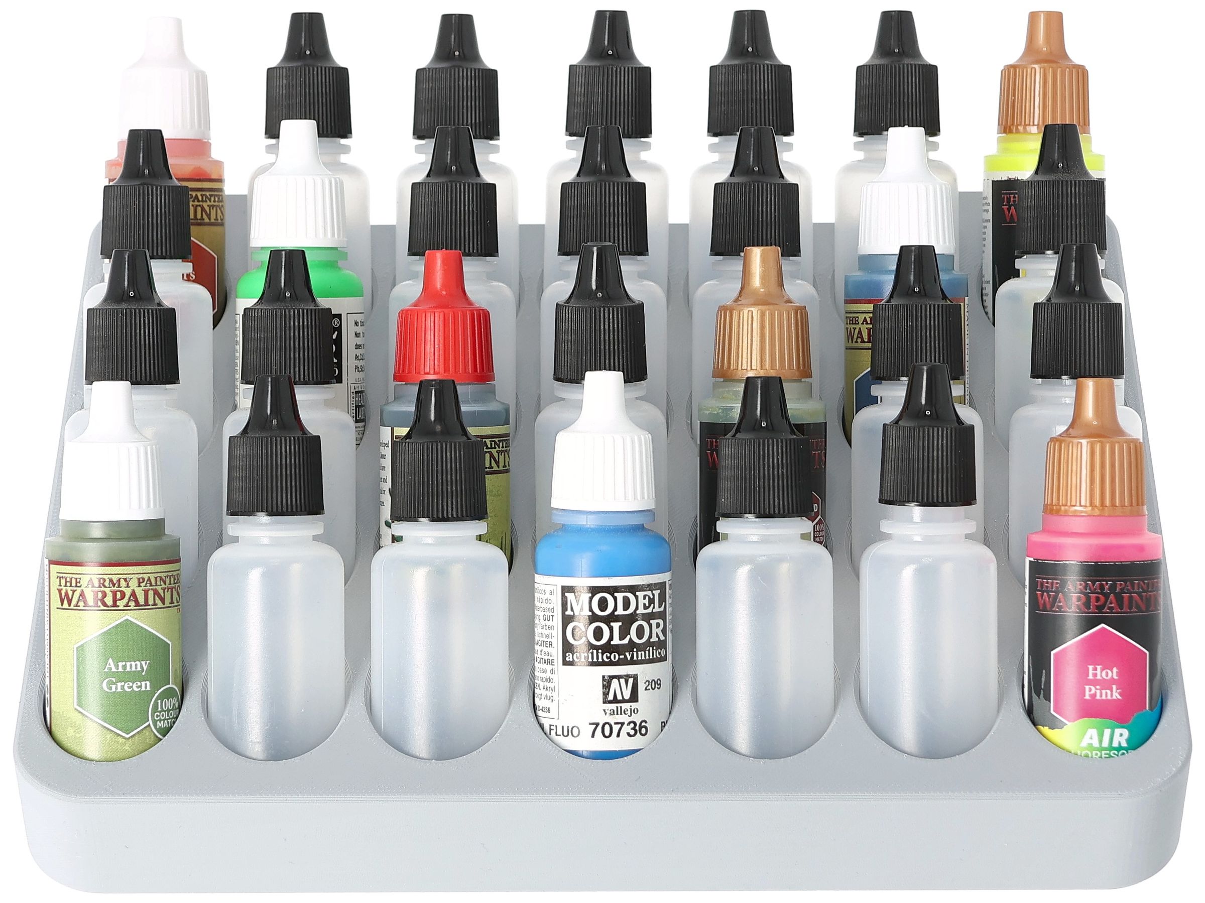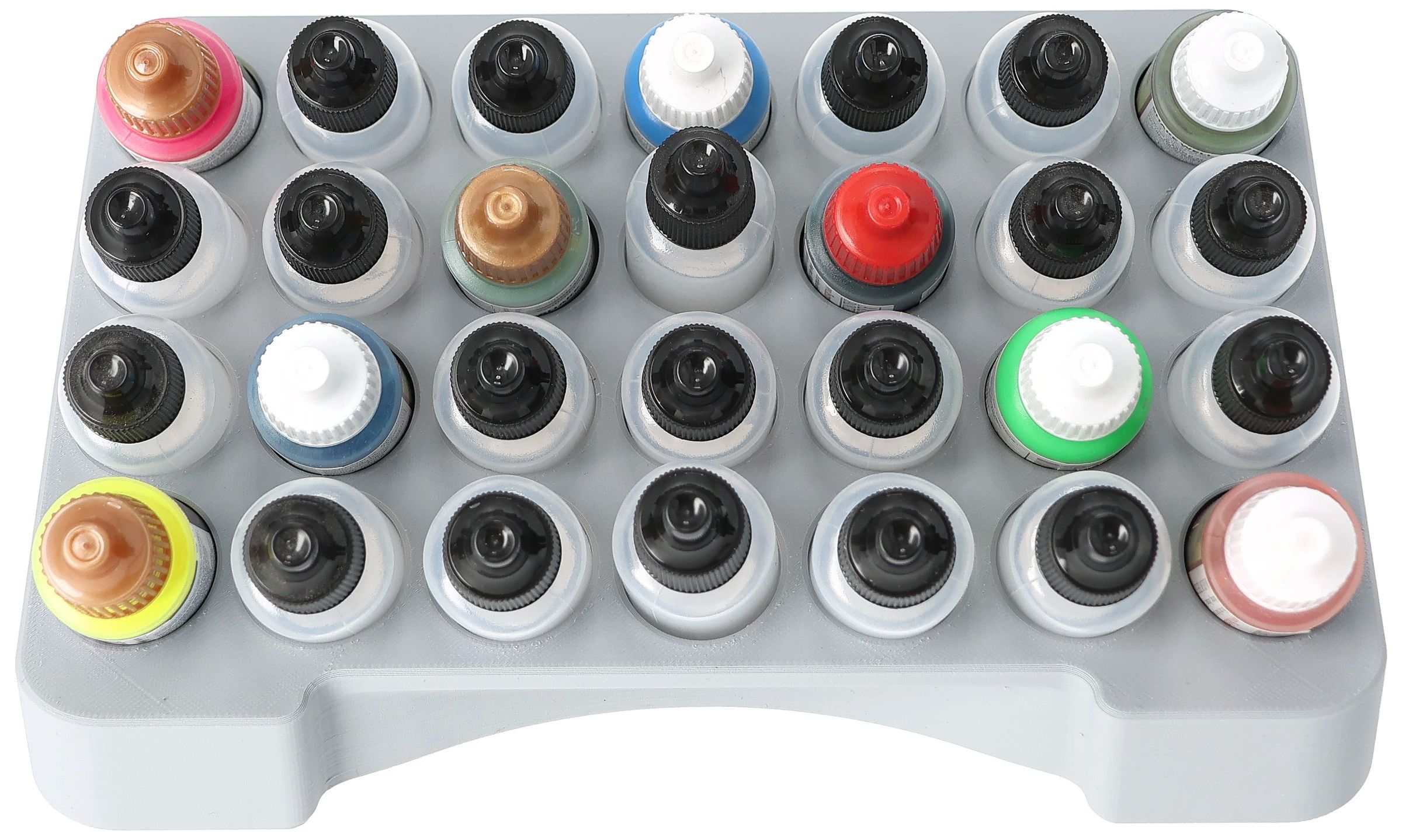 - Paint rack with 28 round compartments for paint bottles with a diameter of 25 mm - compatible with dropper bottles from Vallejo (17 ml), Army Painter (18 ml) and other common formats