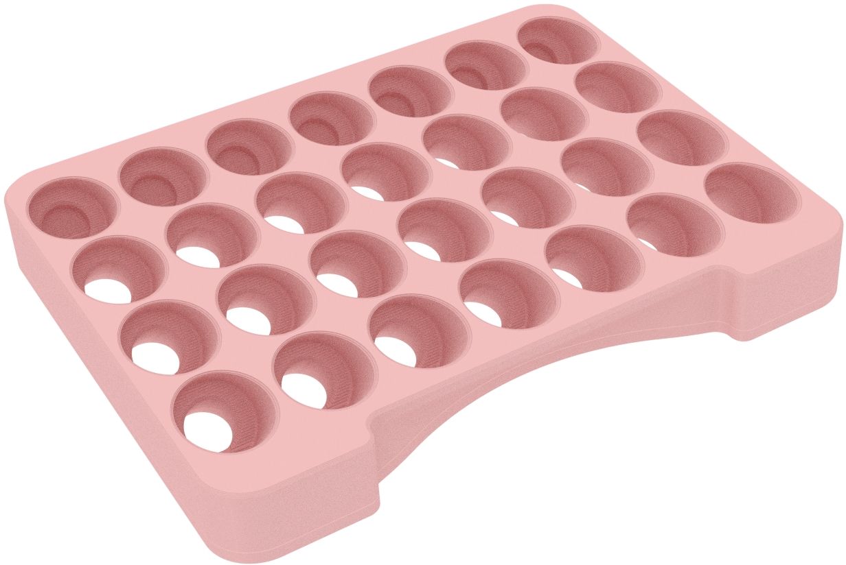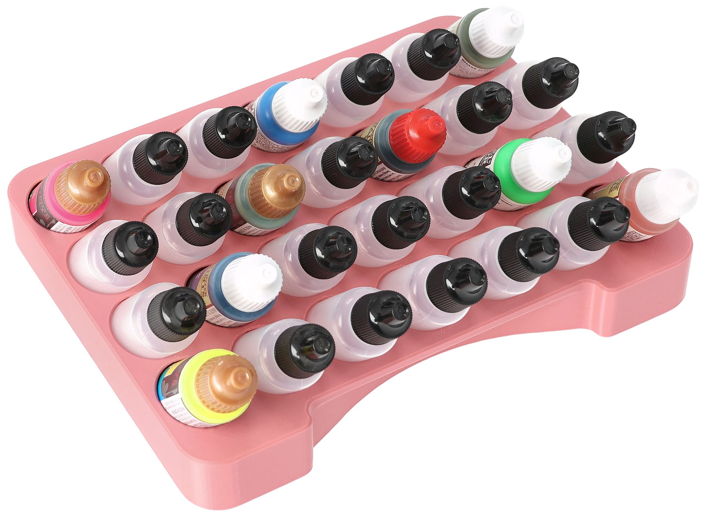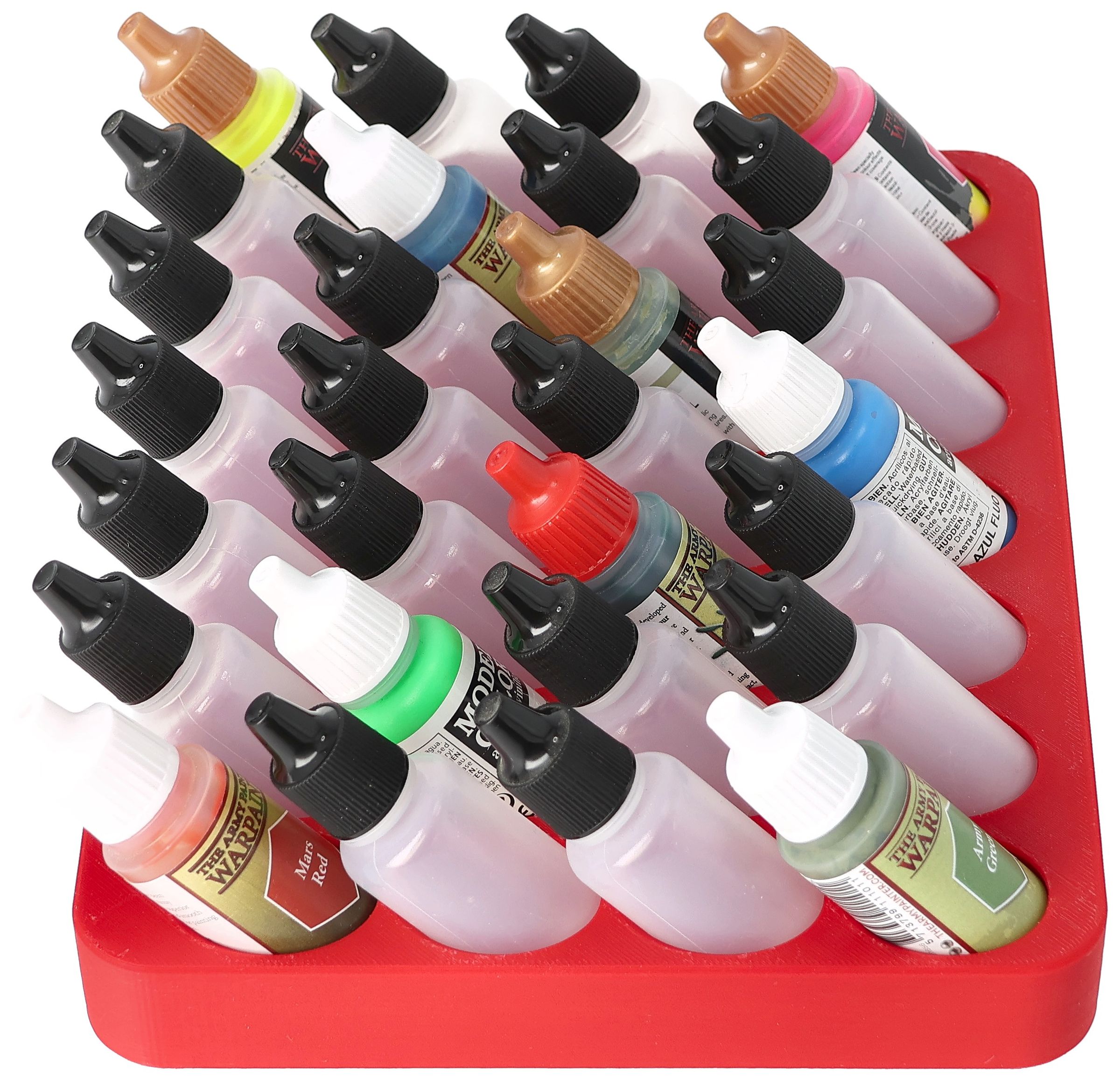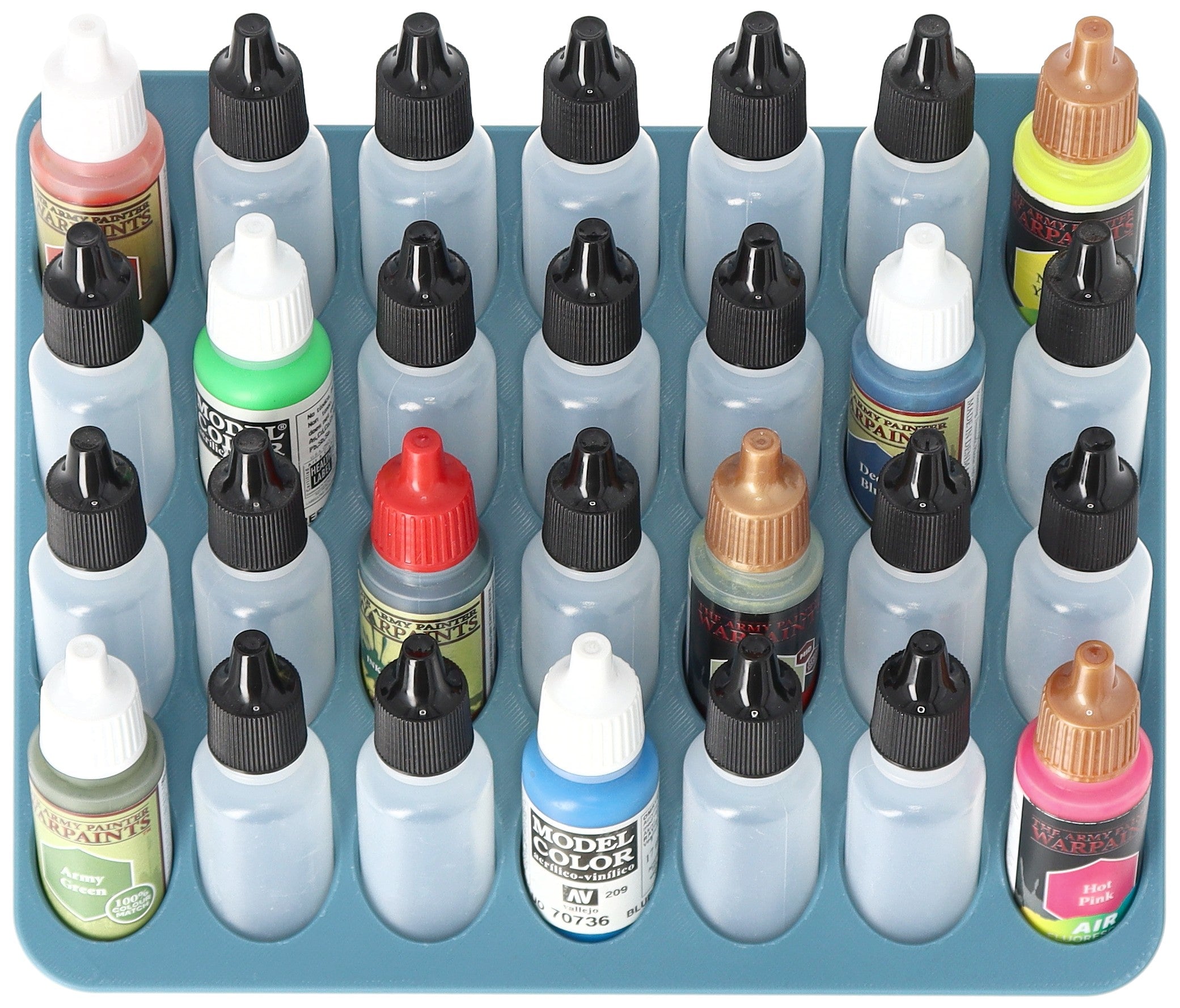 - Paint rack with 28 round compartments for paint bottles with a diameter of 25 mm - compatible with dropper bottles from Vallejo (17 ml), Army Painter (18 ml) and other common formats
