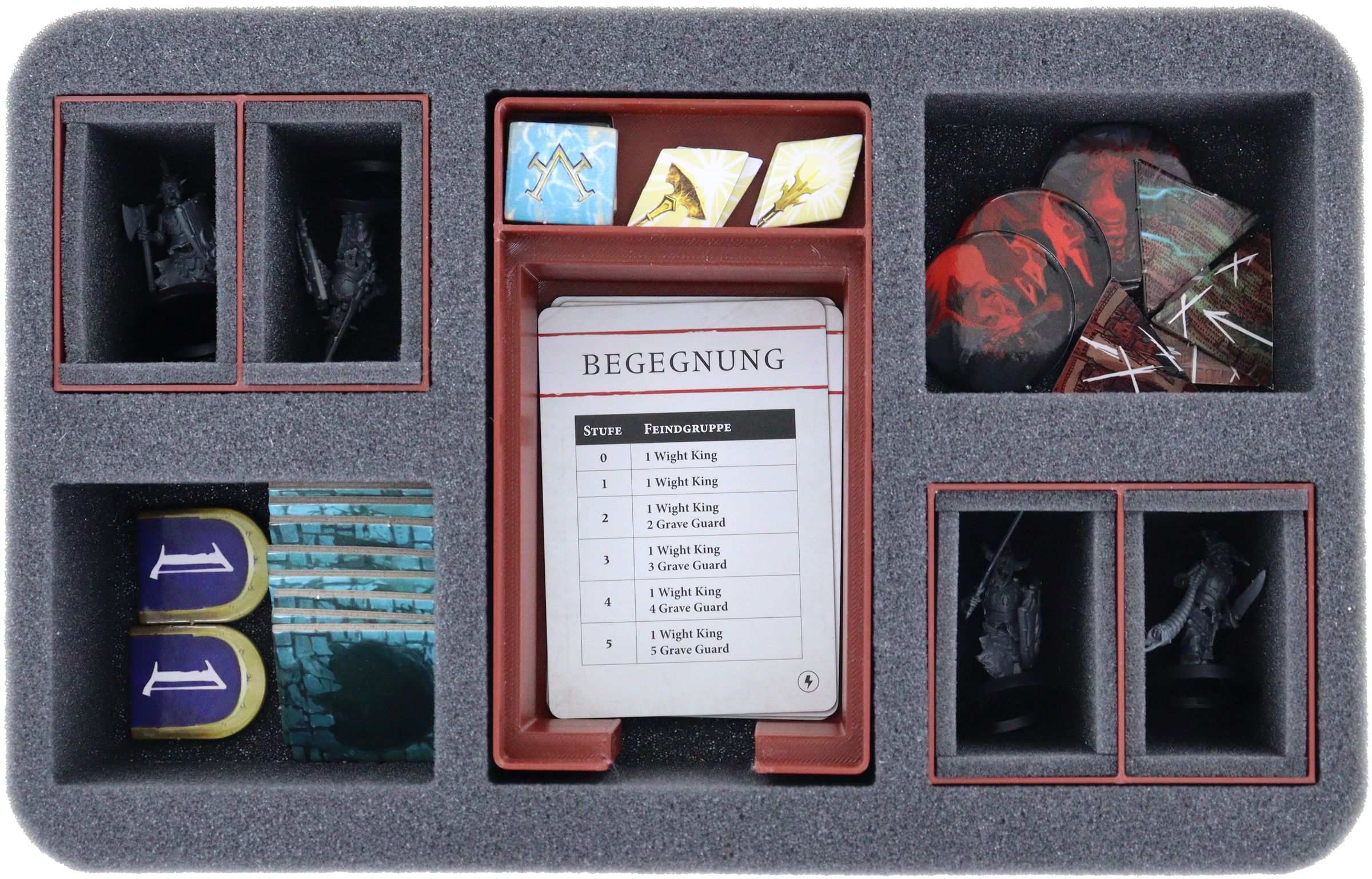 - 1 Half-Size foam tray with 7 compartments for standard-sized cards + small game components such as dice + small infantry such as Grave Guard (HSMEQO050BO)