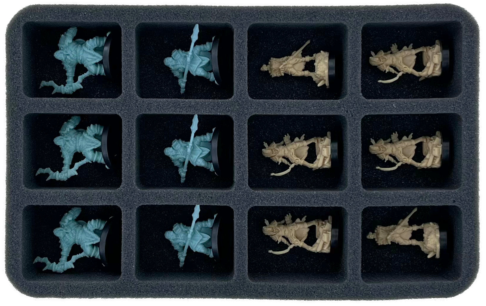 - 1 Half-Size foam tray with 12 compartments for bulky 28 mm tabletop and board game miniatures (HSMFEN050BO)