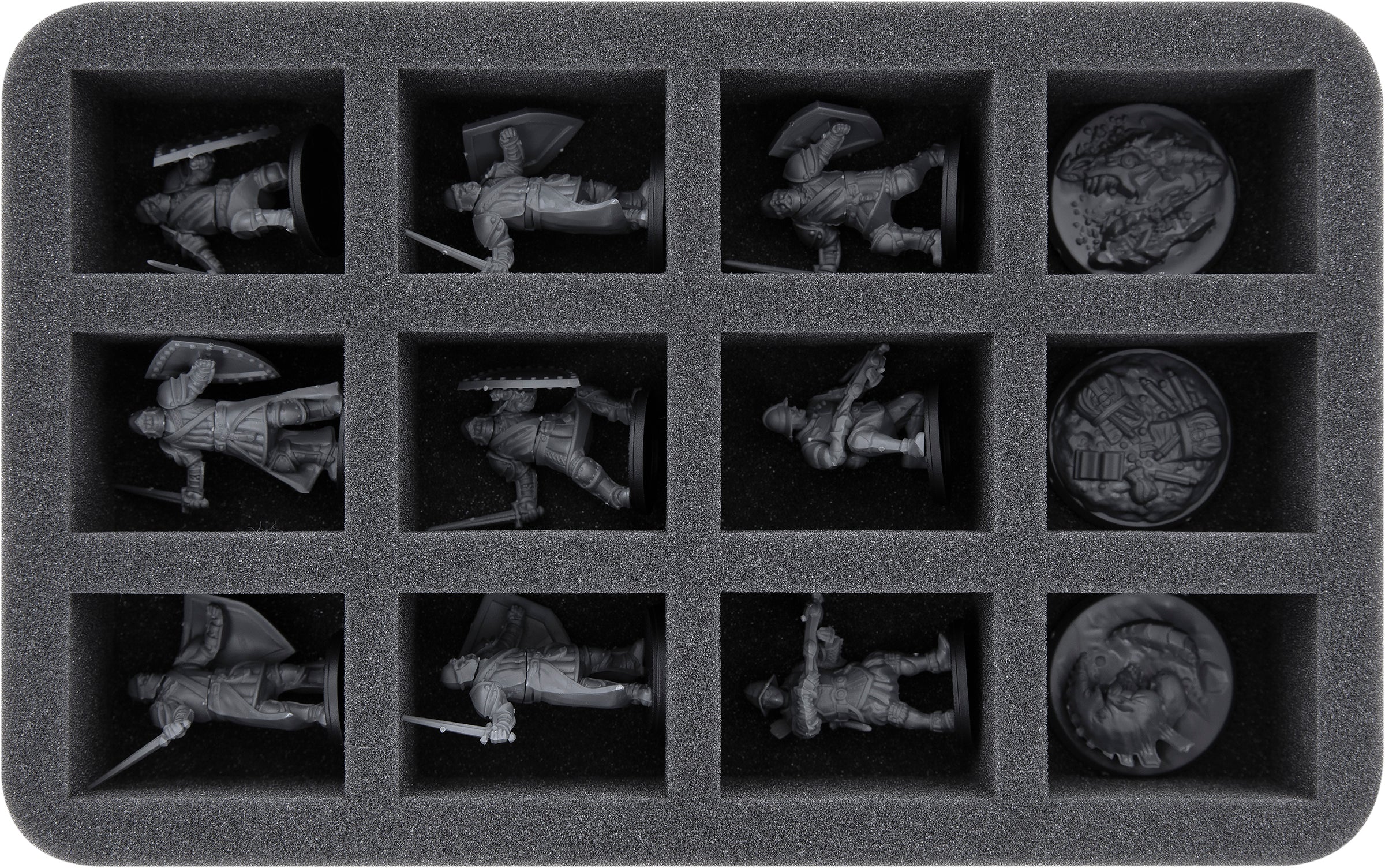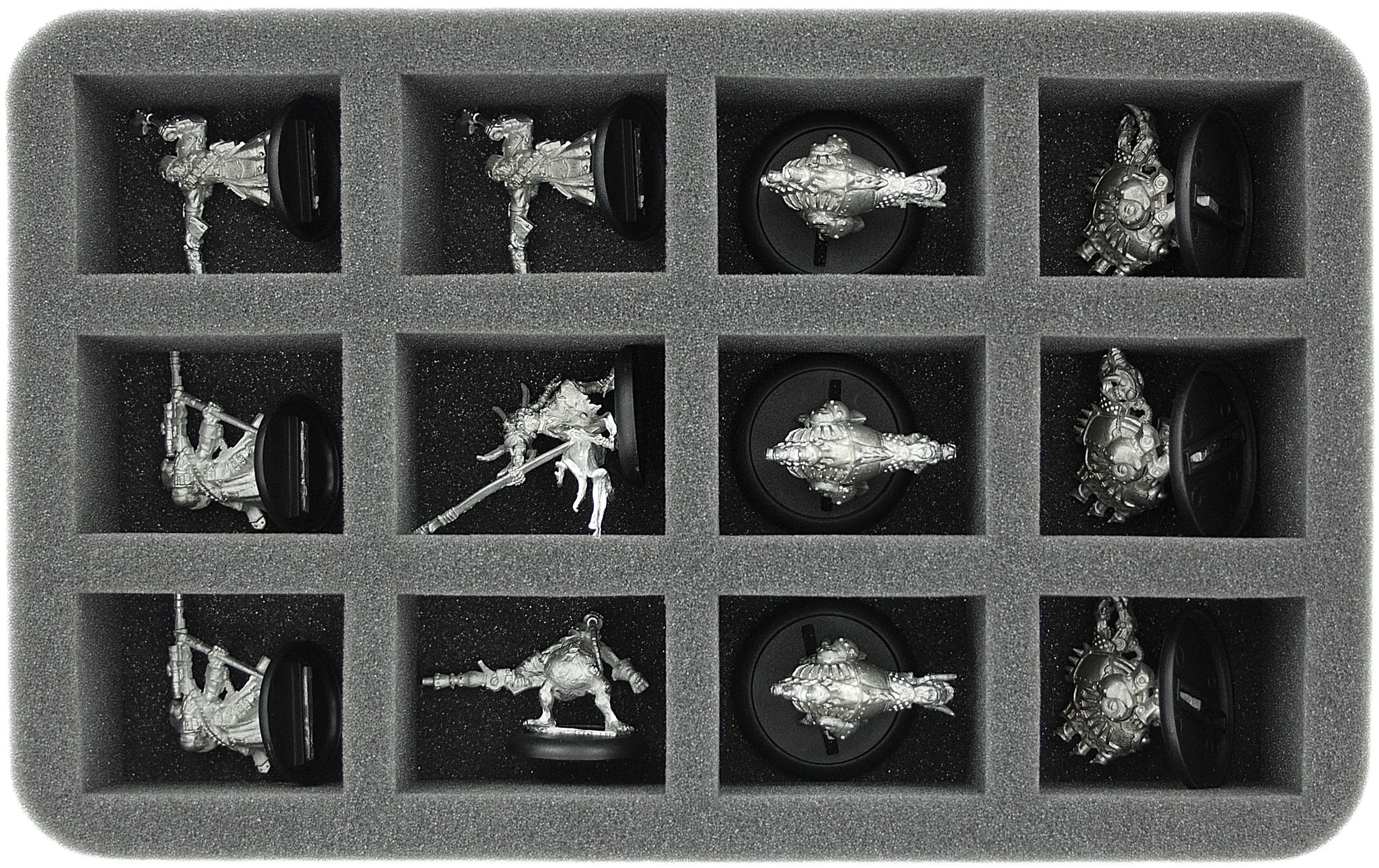 - 1 Half-Size foam tray with 12 compartments for 28 mm tabletop and board game miniatures (HS050I012BO)