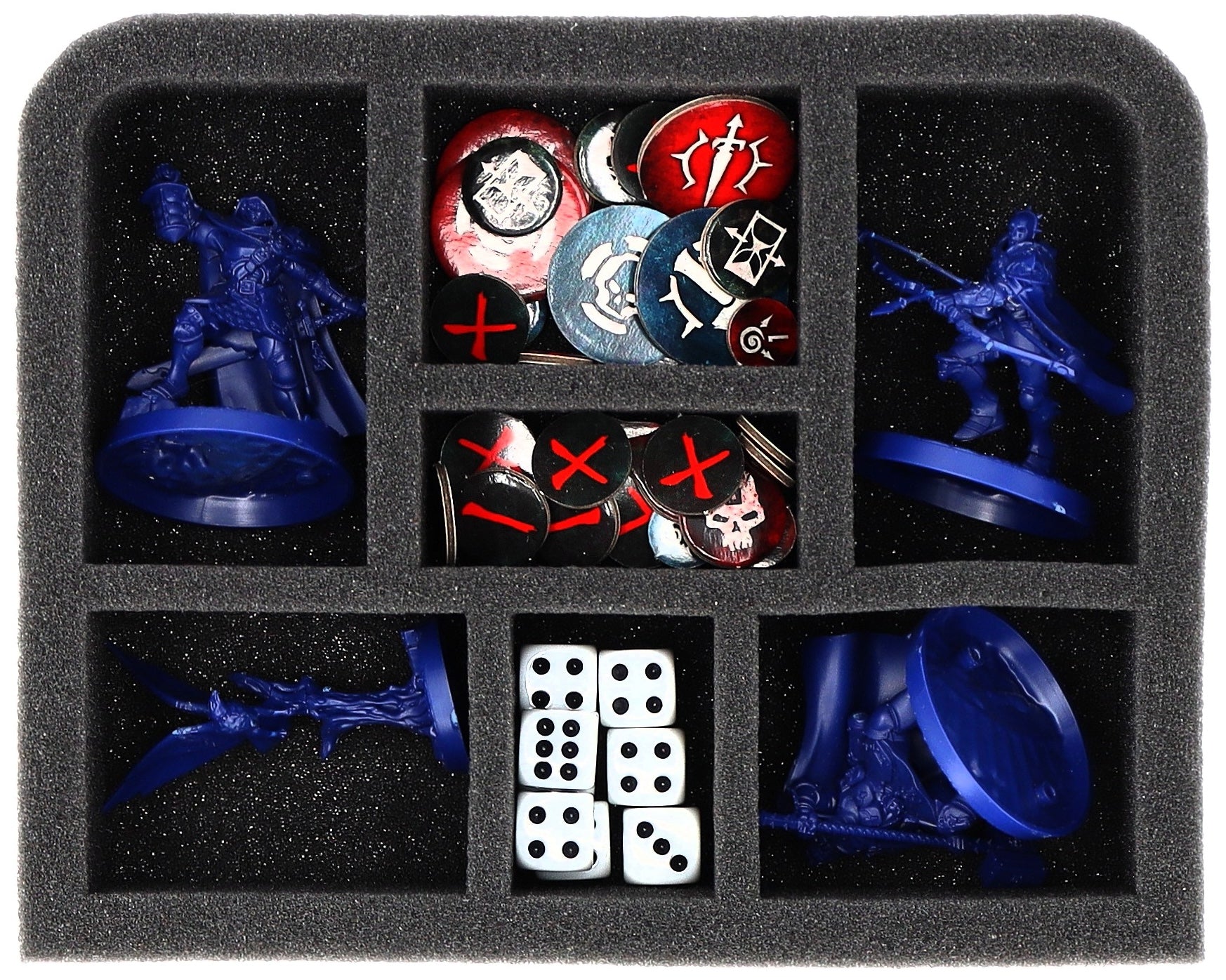 - 2 Quarter-Size foam tray with 7 compartments for warbands such as the Xandire’s Truthseekers, the Crimson Court and models with similar dimensions (QSMFKR050BO)