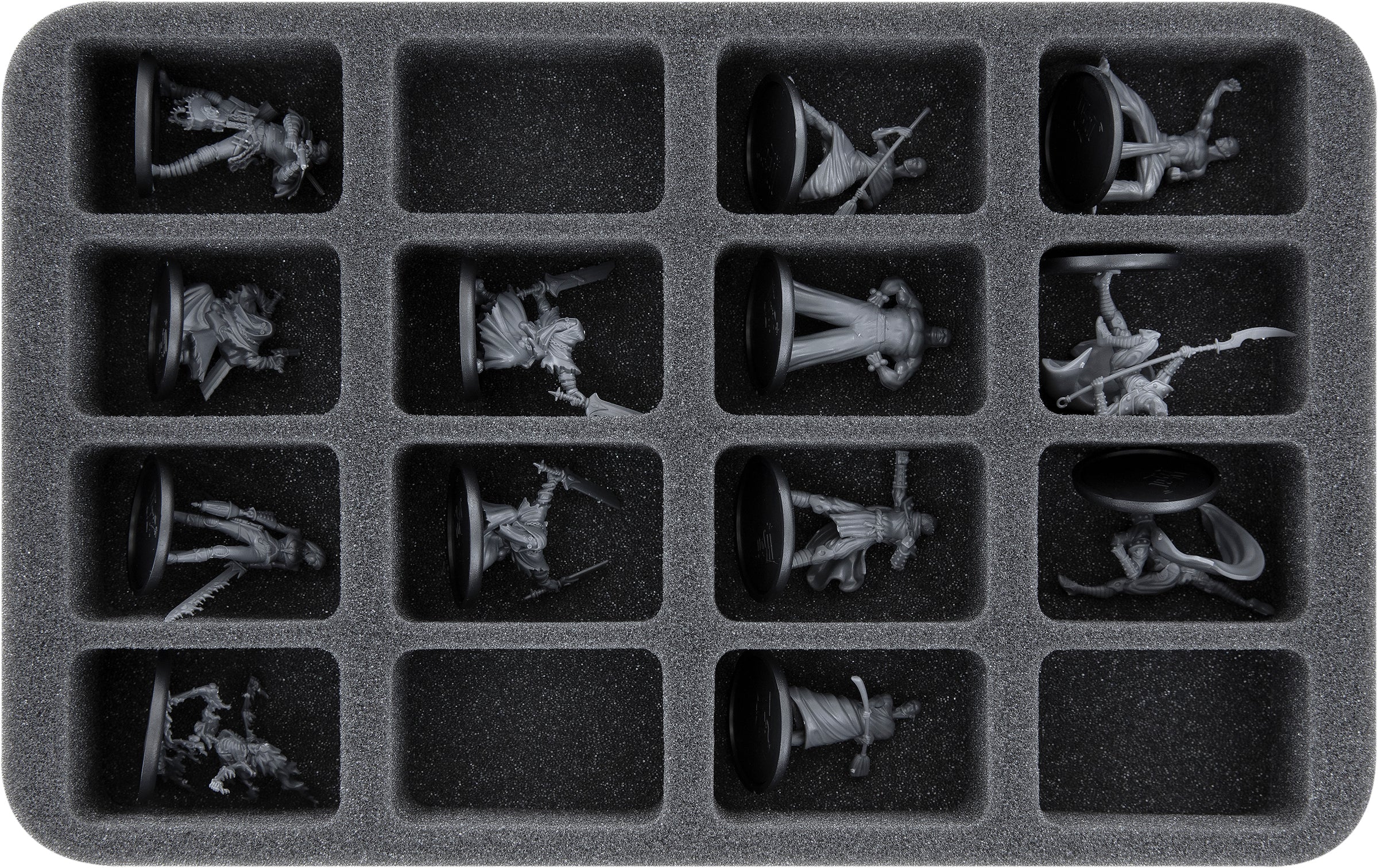 - 1 Half-Size foam tray with 16 compartments for Malifaux-Miniatures on 30 mm base like ShenLong, Primeordial Magic and miniatures of similar dimensions (HS040BF05BO).