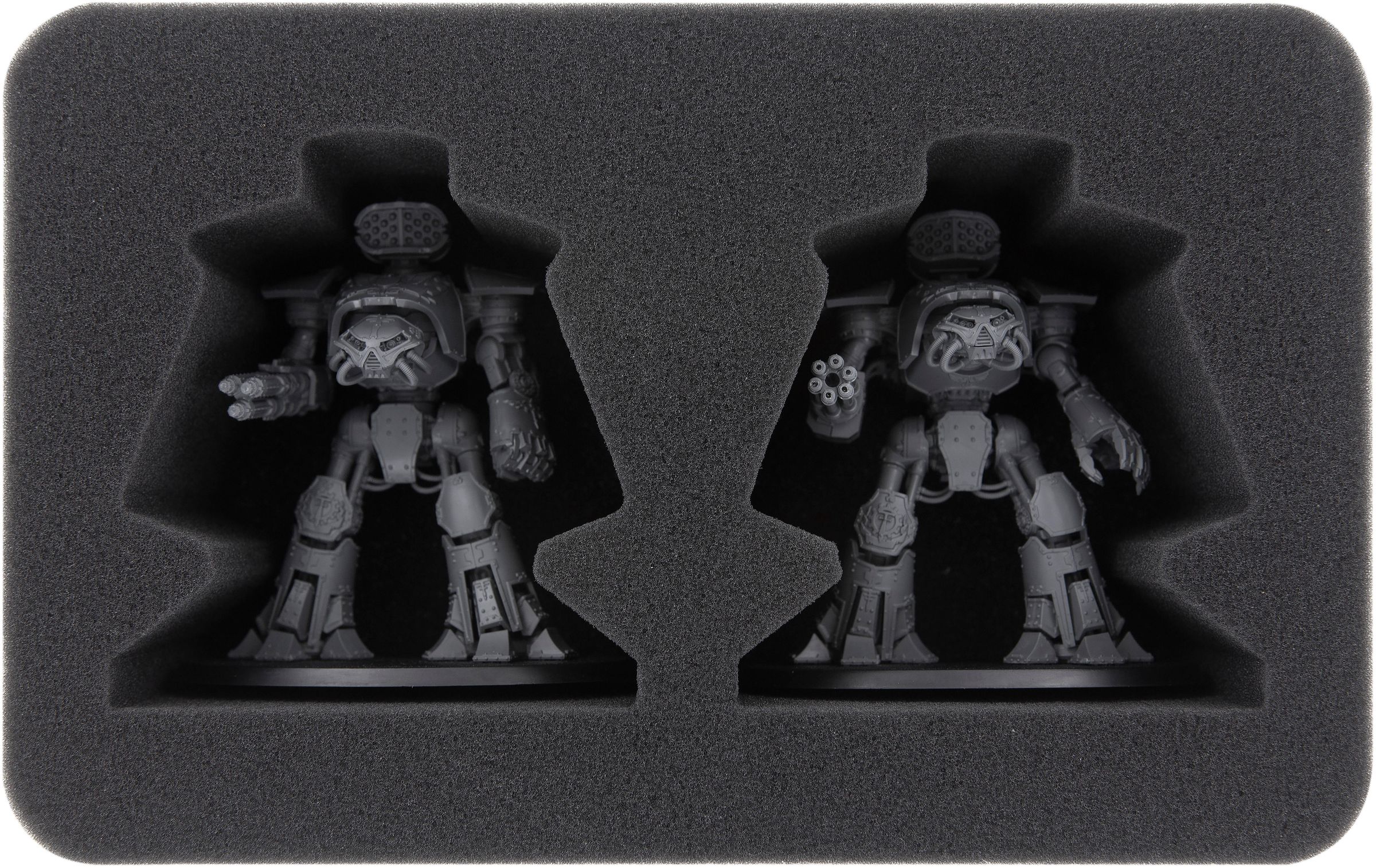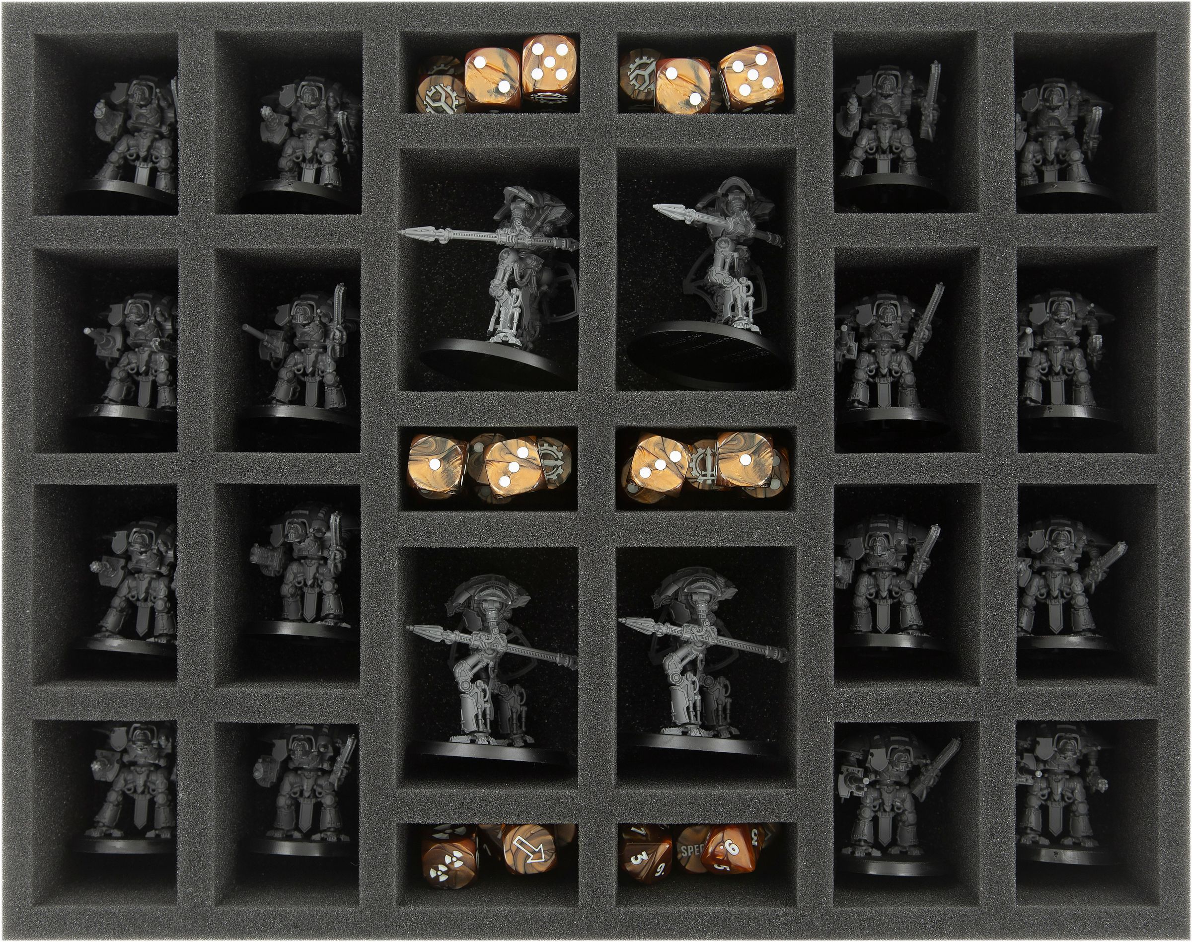 With the exception of 6 small compartments of the FSJQ060BO insert (here you can store small game accessories like dice and tokens), all compartments of the foam trays of the set are suitable for Adeptus Titanicus miniatures.