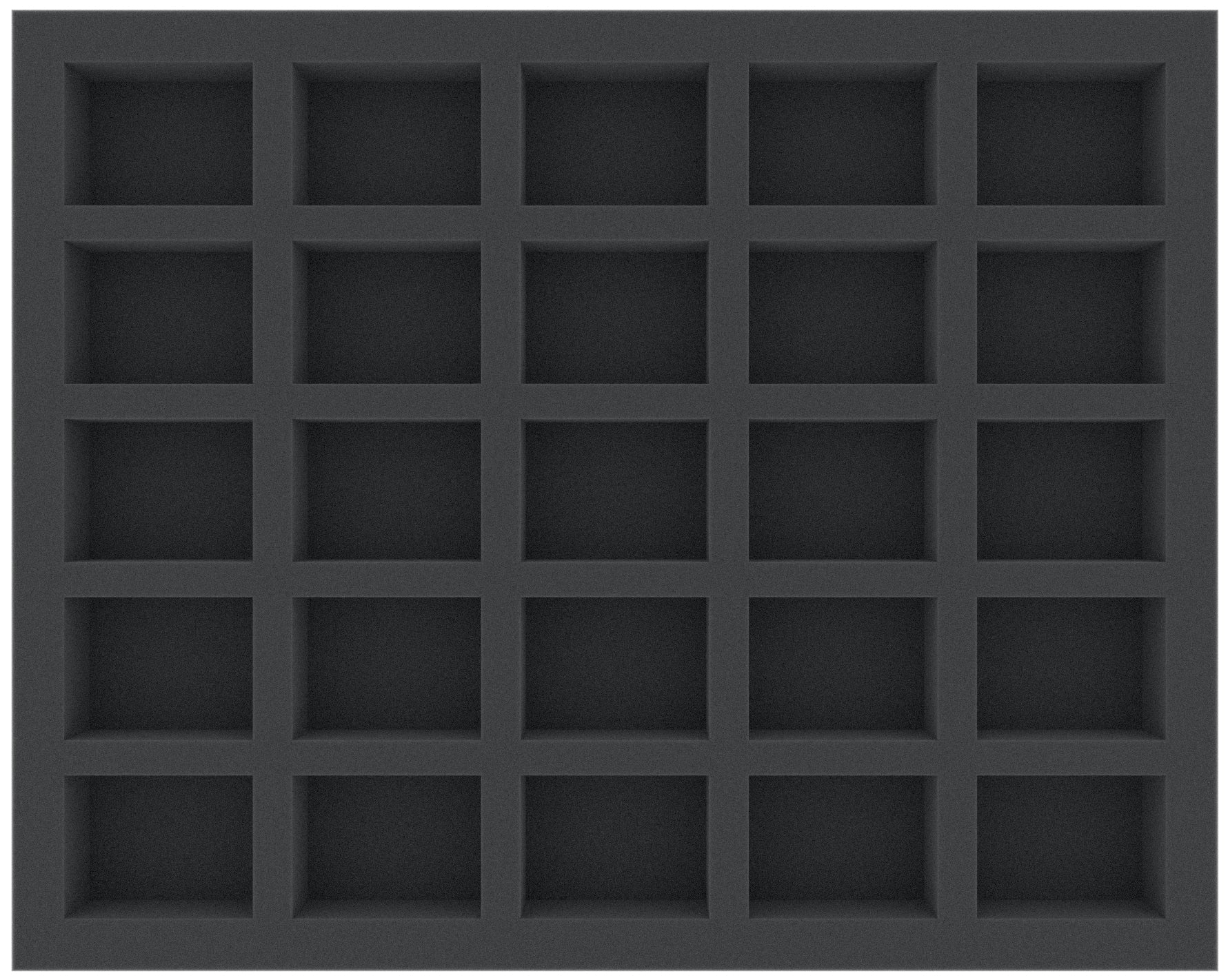The foam tray with 25 compartments is suited for medium-sized models. Each of the 25 compartments of the tray is 54 mm long x 41 mm wide x 30 mm deep.