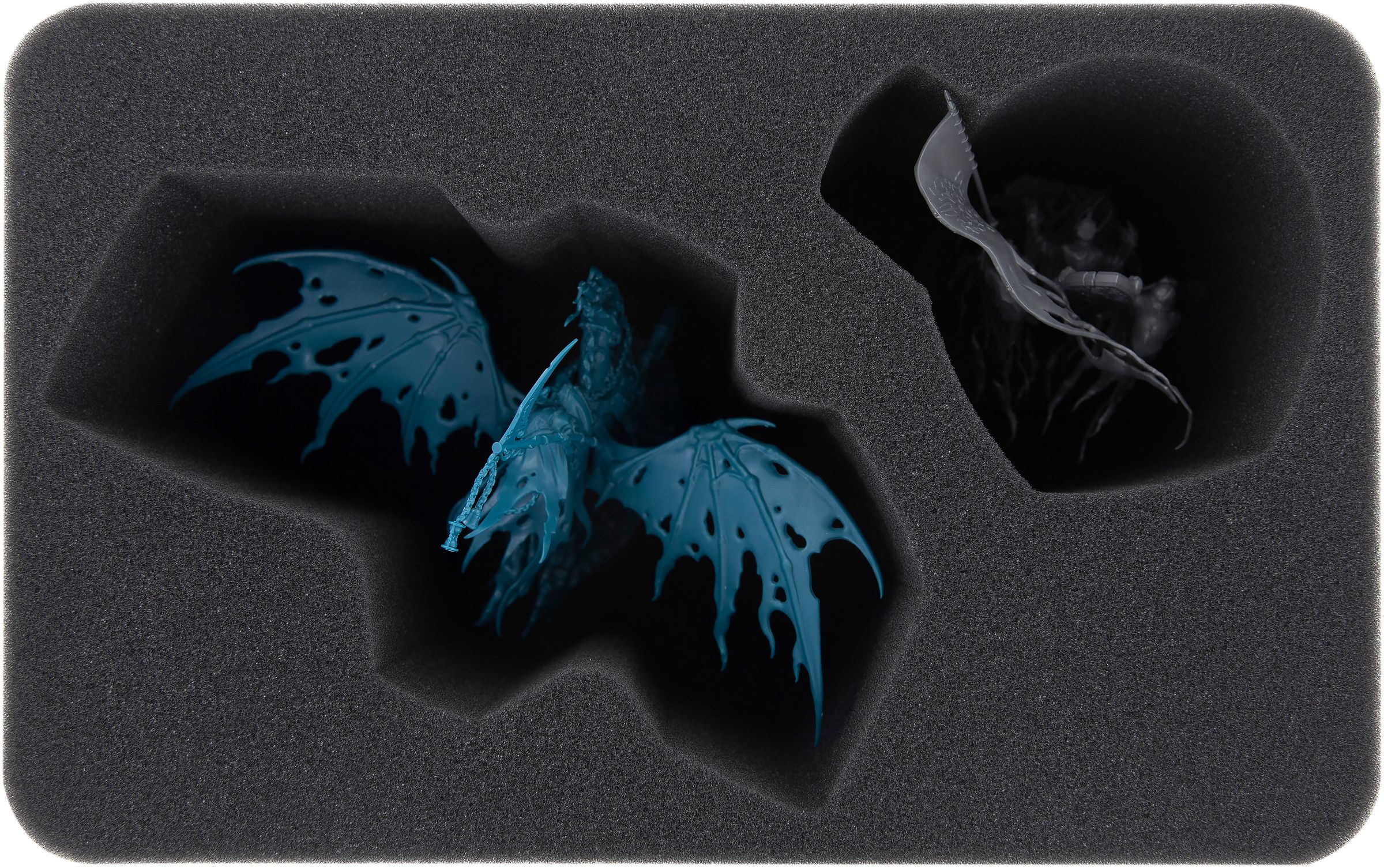 HSMEFB145BO: This custom cut tray provides space for two mighty leaders of the Nighthaunt – Kurdoss Valentian, The Craven King and Reikenor the Grimhailer. The mat is divided into two custom-made compartments, which are exactly tailored to the individual miniatures. This ensures that Kyallaron's wings remain intact even during transport and the flag of Craven King continues to wave.