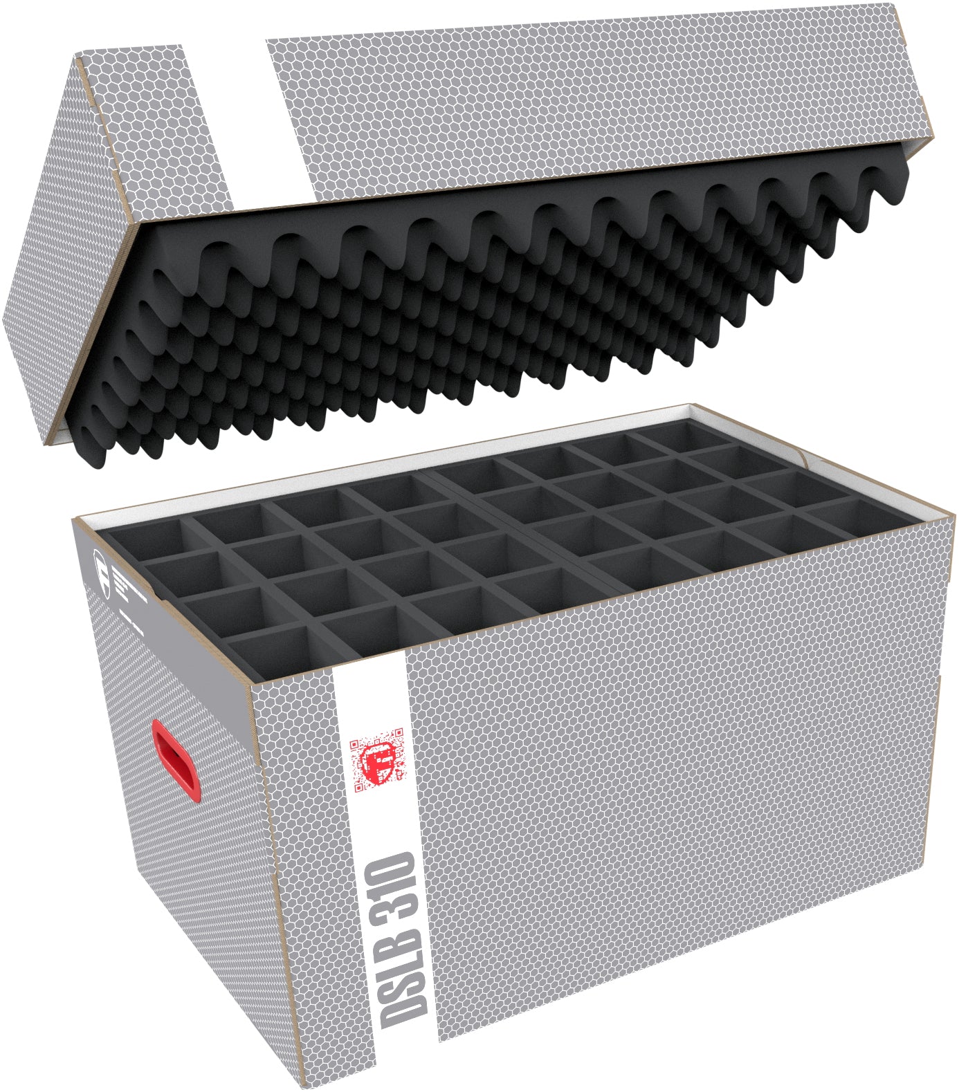 Of course, the trays fit exactly into the sturdy Double-Size storage box. The box is made of coated, double-walled cardboard. It is therefore both very light and very stable. The attachable lid reliably protects your miniatures from dust and other external influences. With the two plastic-reinforced carrying handles on the sides, you can transport the box very easily.