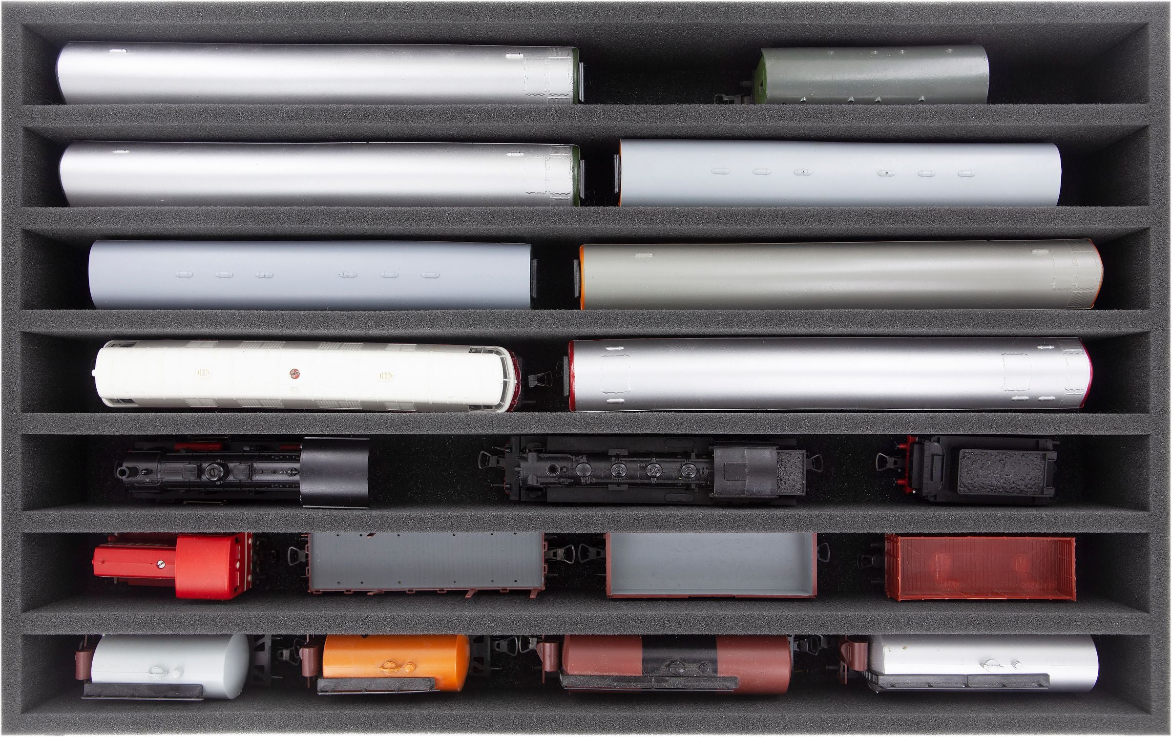 Seven compartments, tailor-made for upright storage of model railways in Gauge 00, offer your wagons and locomotives reliable protection for storage and transport.