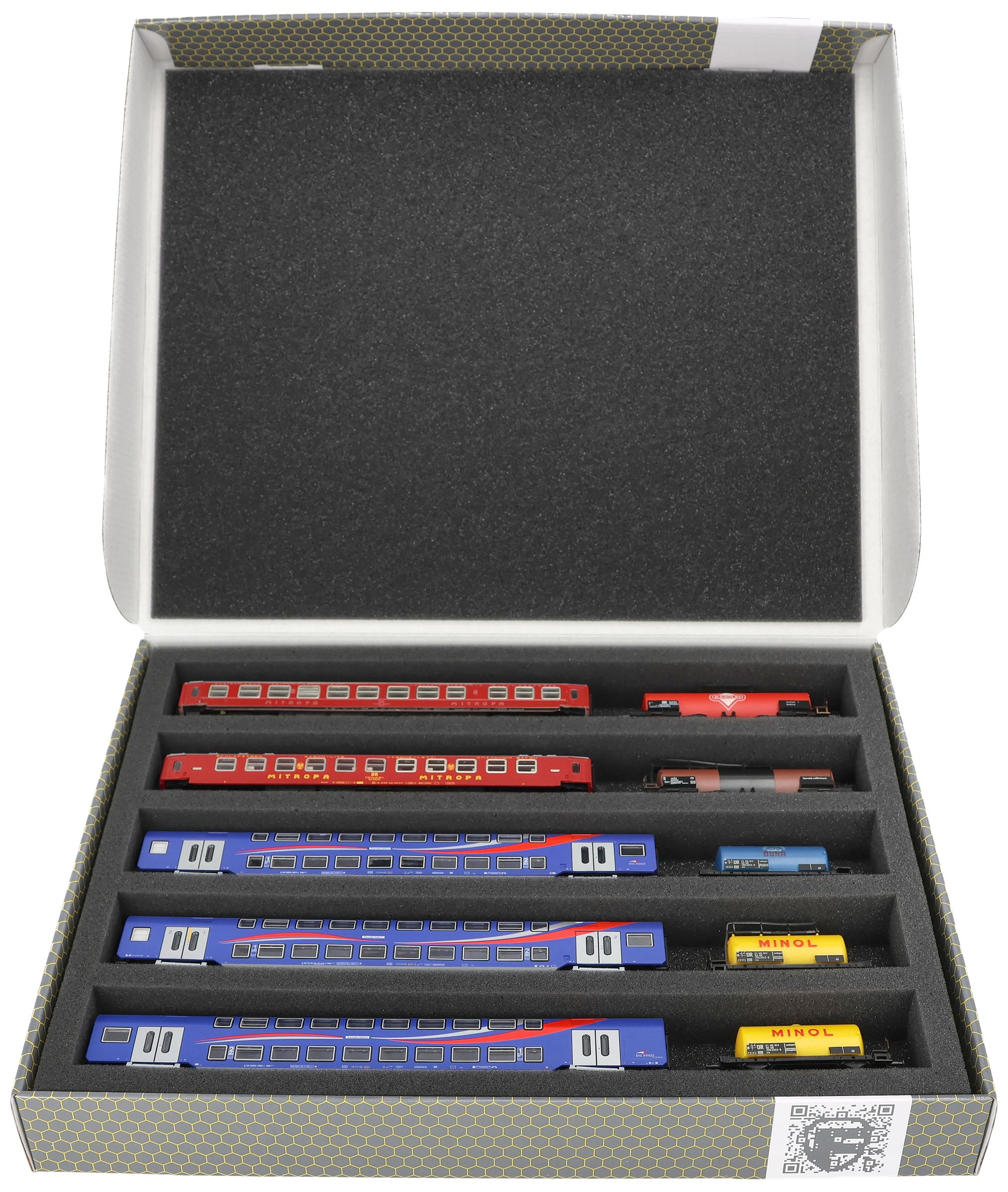 Five compartments, tailor-made for horizontal storage of model railways in Gauge TT, offer your wagons and locomotives reliable protection for storage and transport. Due to the lying position the trays can also be used as a display for the presentation of your model train collection.