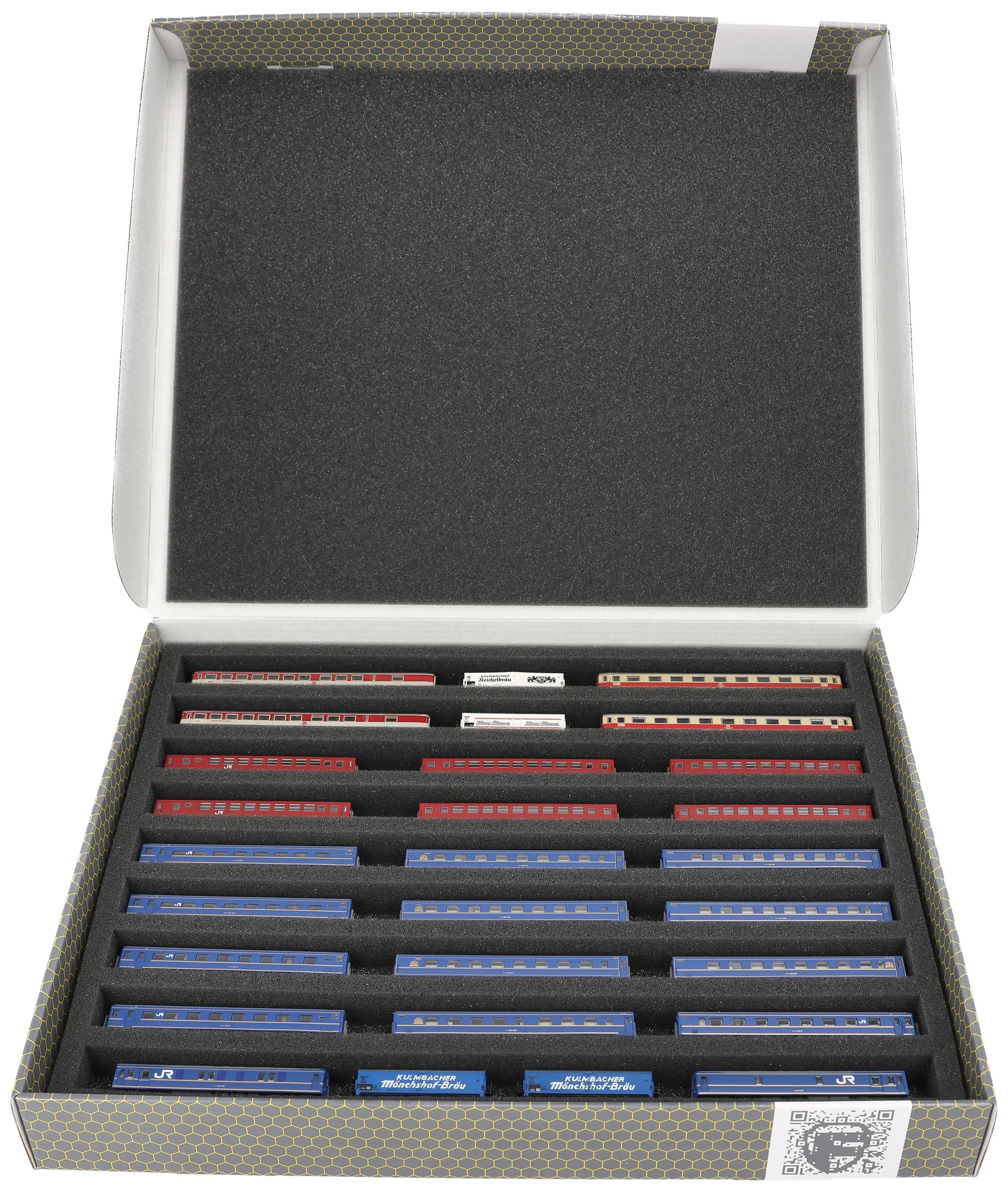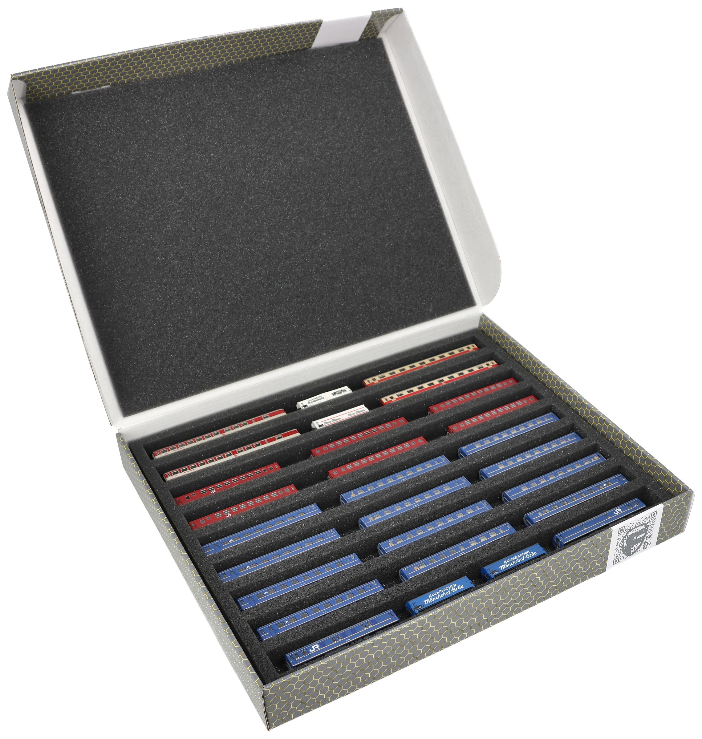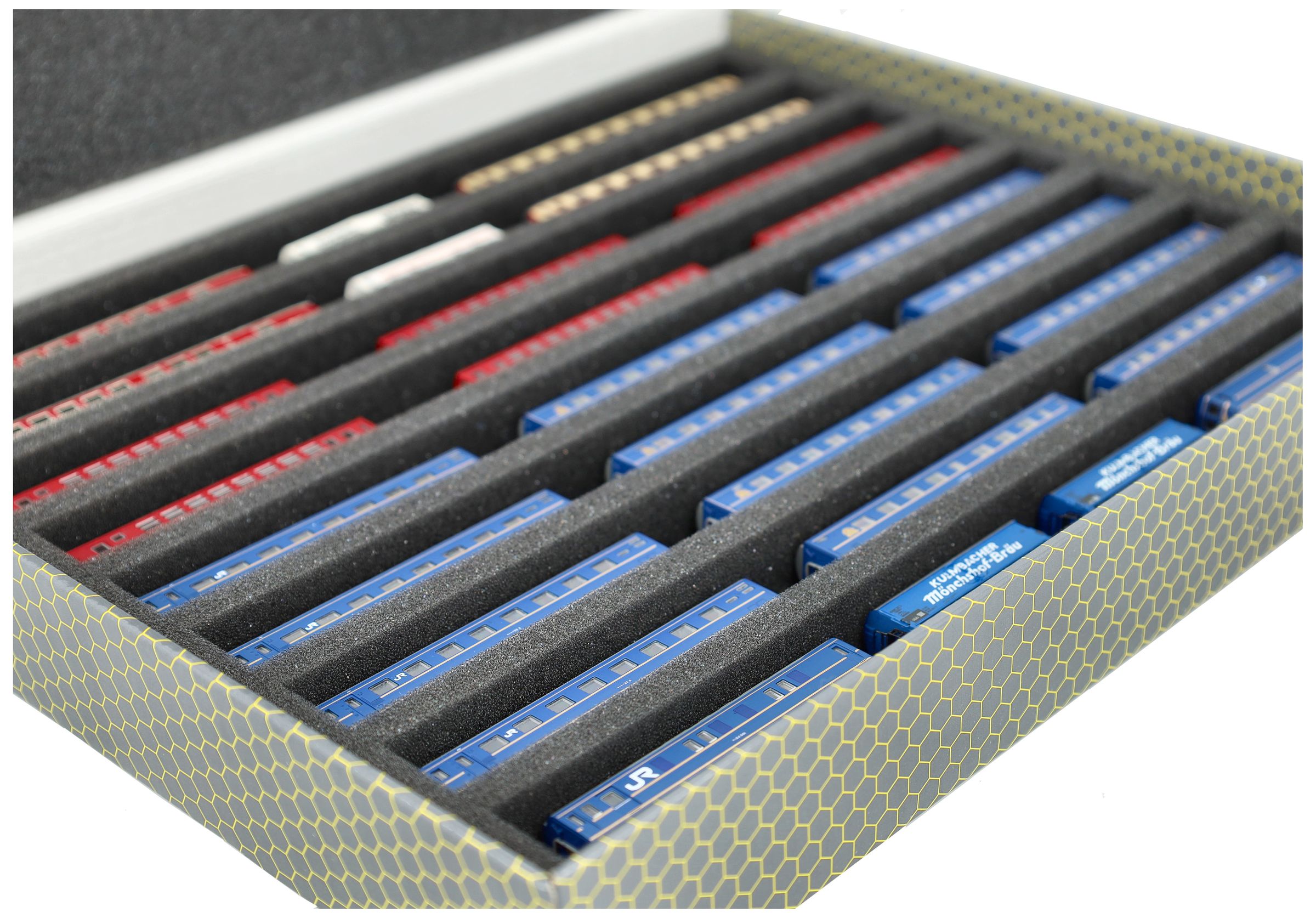 Several trains and carriages can be stored next to each other in one compartment. In order to prevent collision or unintentional coupling, we offer suitable foam spacers (HS040A002, HS020A001) to separate your model trains.