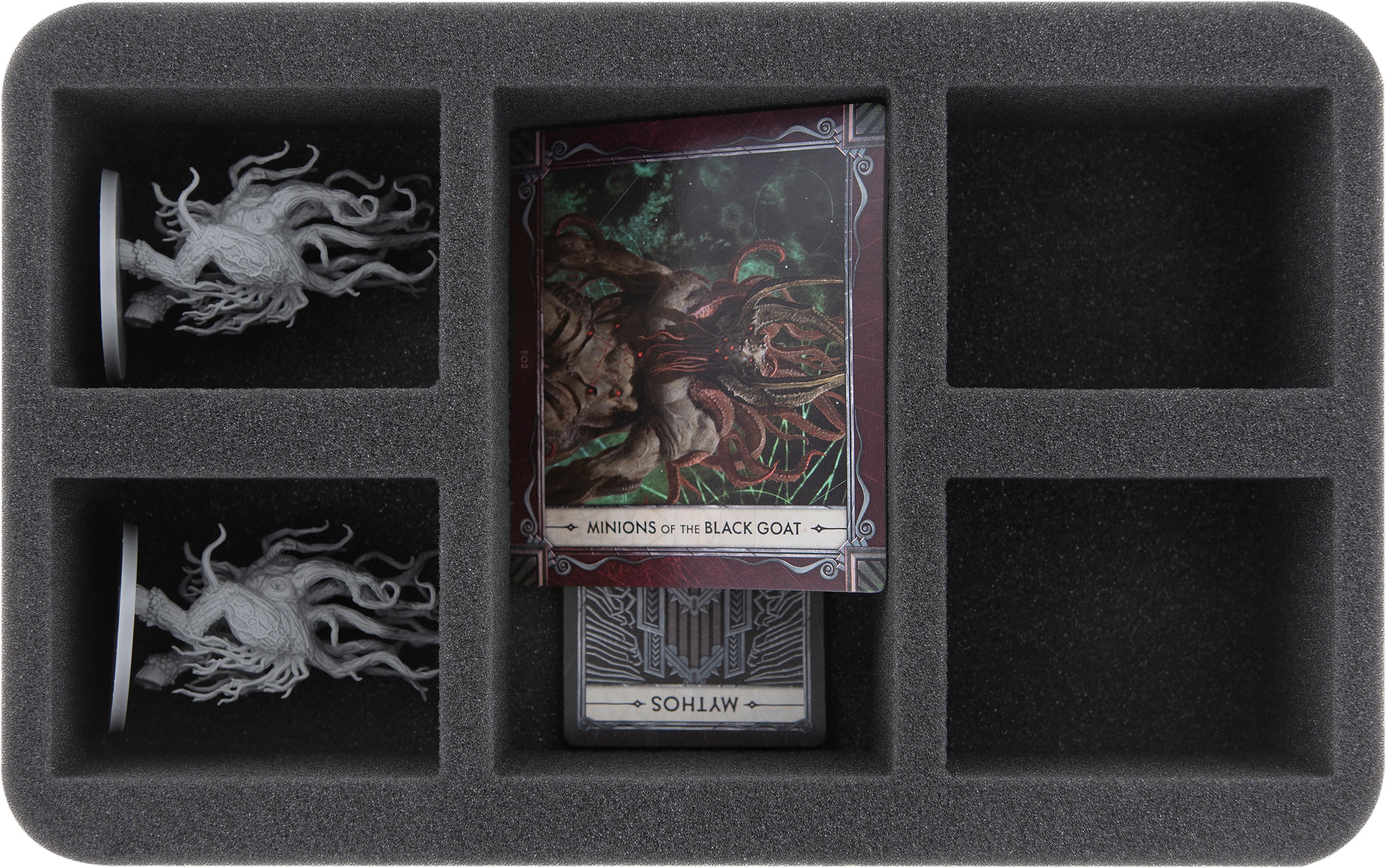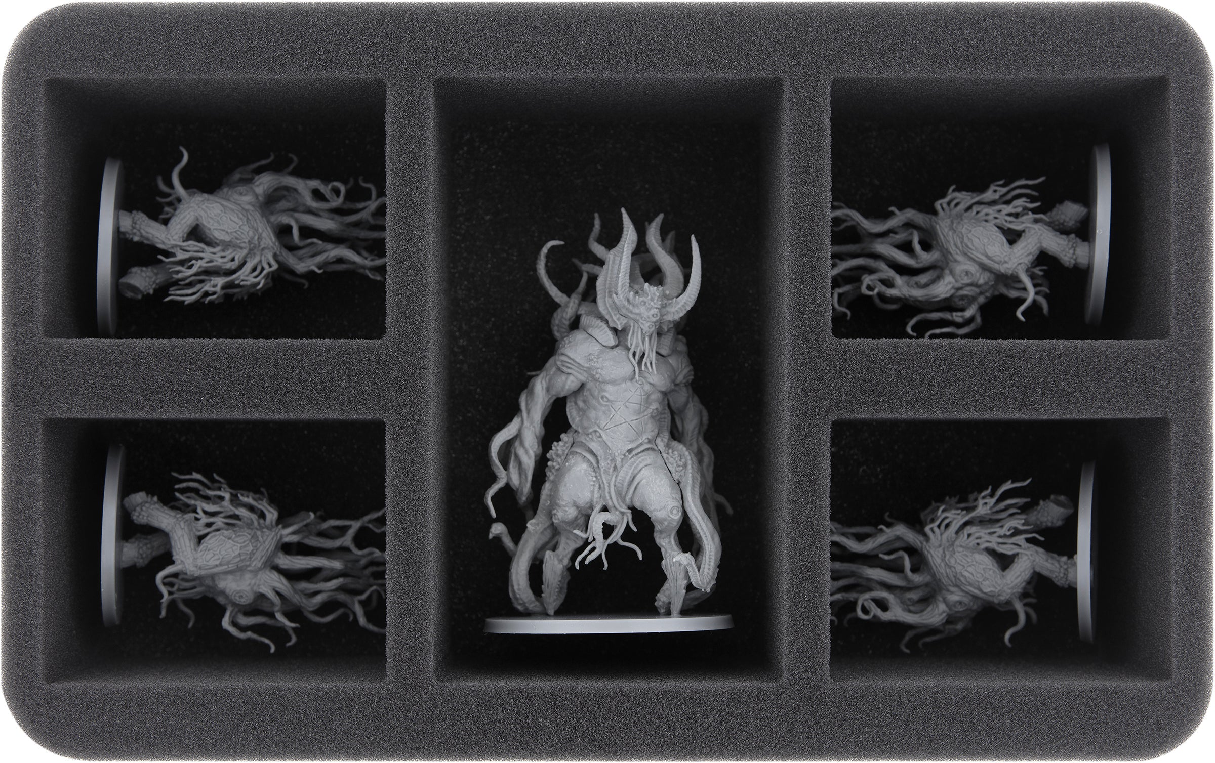 The higher of the two foam trays takes care of the large miniature of the Black Goat of the Woods and four figures of his followers. The custom-fit cut ensures optimal protection of the miniatures. They lie safely in their compartment made of soft foam. This not only protects the sensitive details, such as the tentacles, from damage. Also the colors of the painted miniature remain undamaged.