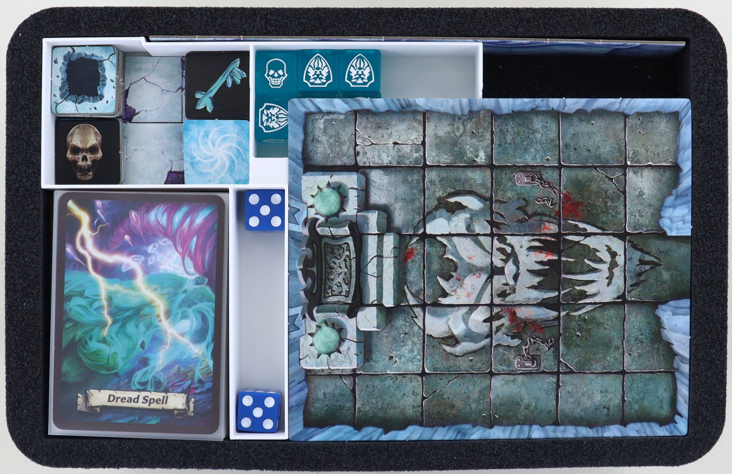 - 1 Plastic card holder with three compartments for small-sized game components like Movement and Combat Dice, as well as tiles like Magic Ice Tiles, Ice Tunnels, Slippery Ice, Ice Vault, Crystal Key Tile, Blocked Square Tiles, and Skull Tiles