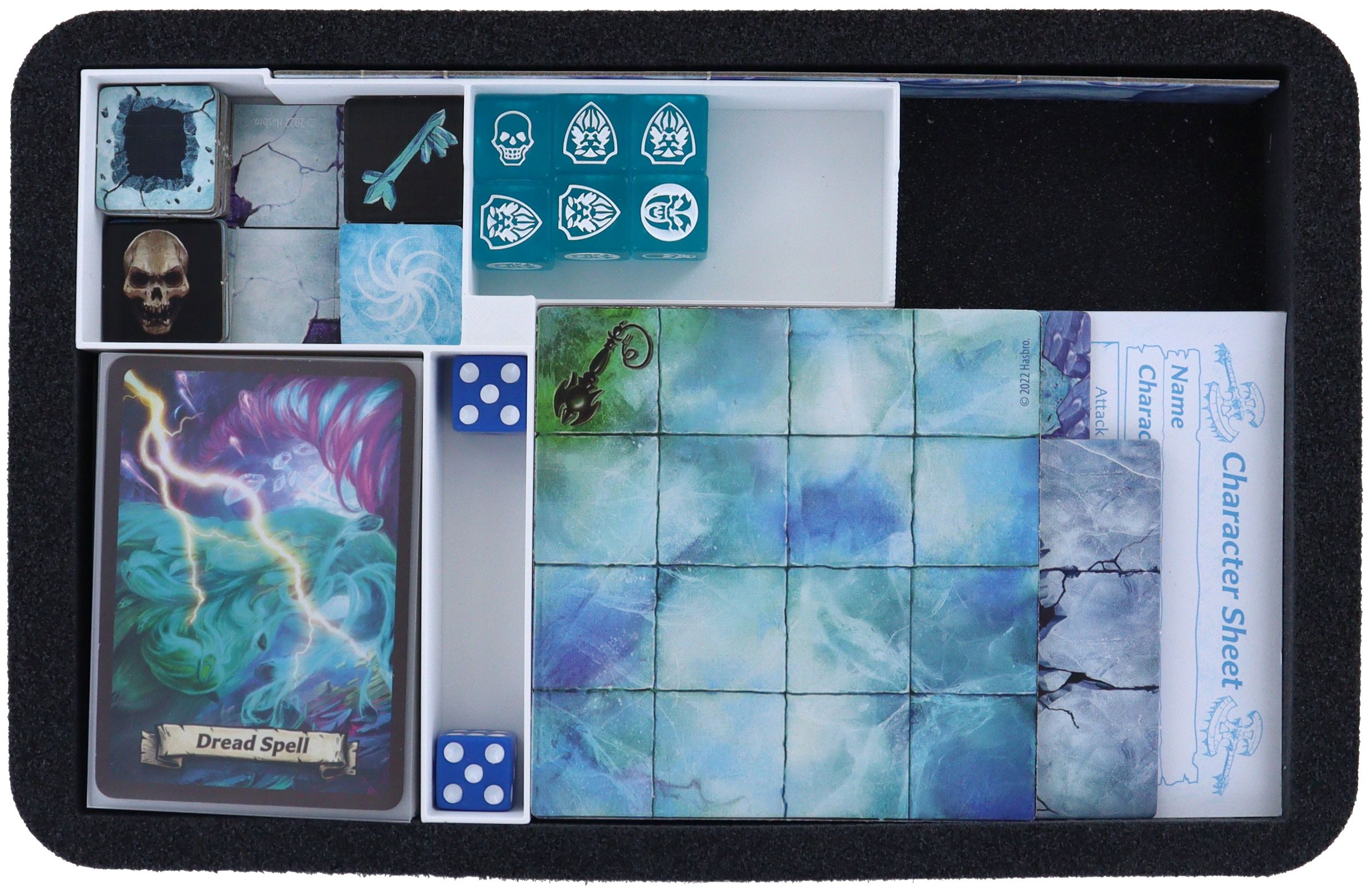 - The plastic tray is fitted into the foam. It offers space for the small-sized game material of the expansion, like tiles and dice. Also, it functions as a divider for the compartment in the foam tray so that you can accommodate playing cards, character sheets, and large cardboard pieces.
