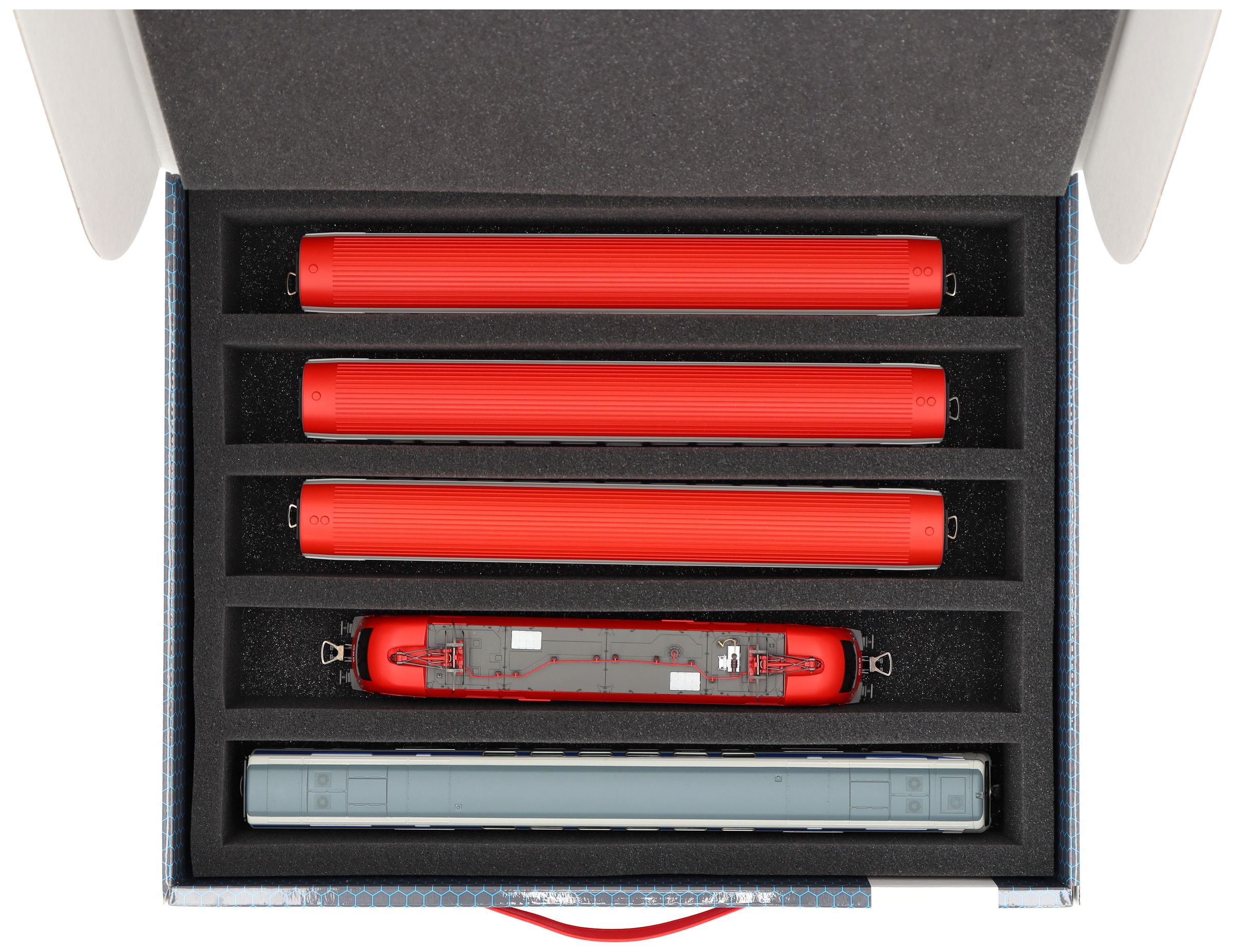 Several trains and carriages can be stored next to each other in one compartment. In order to prevent collision or unintentional coupling, we offer suitable foam spacers (HS040A002, HS020A001).