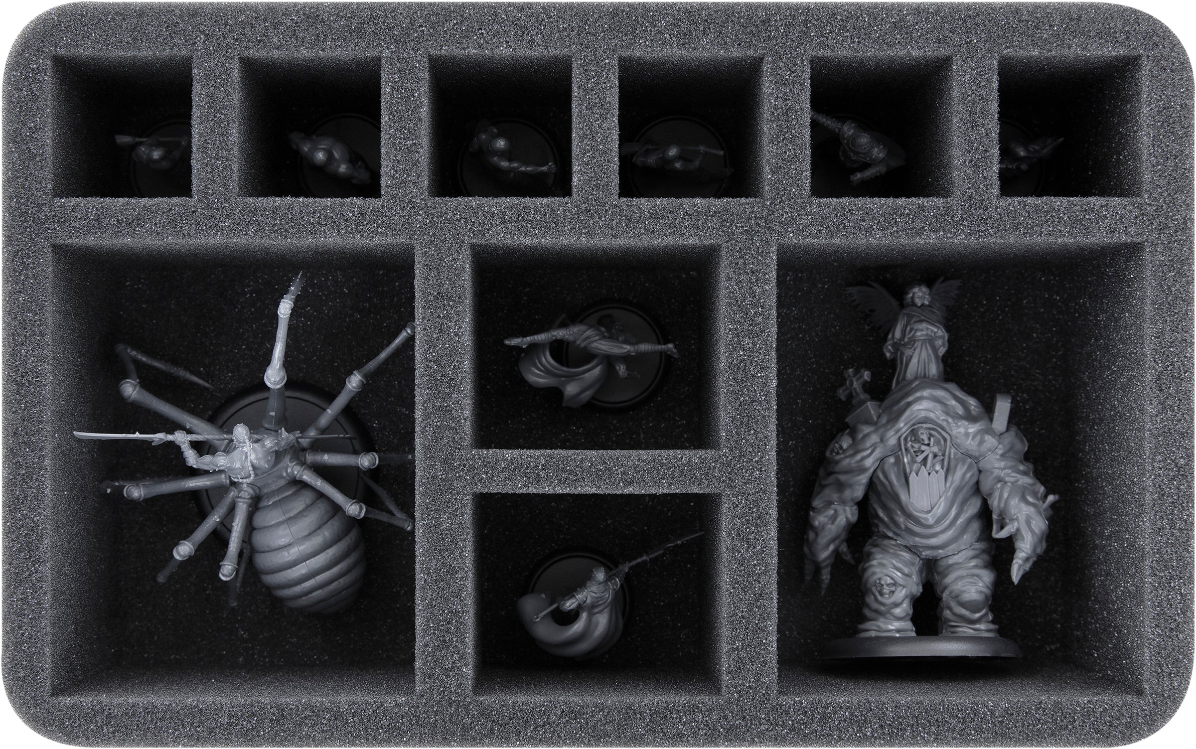 - 1 Half-Size foam tray with 10 compartments for bulky miniatures like Jorogumo, Grave Golem and small miniatures like Shenlong (HS080A016)
