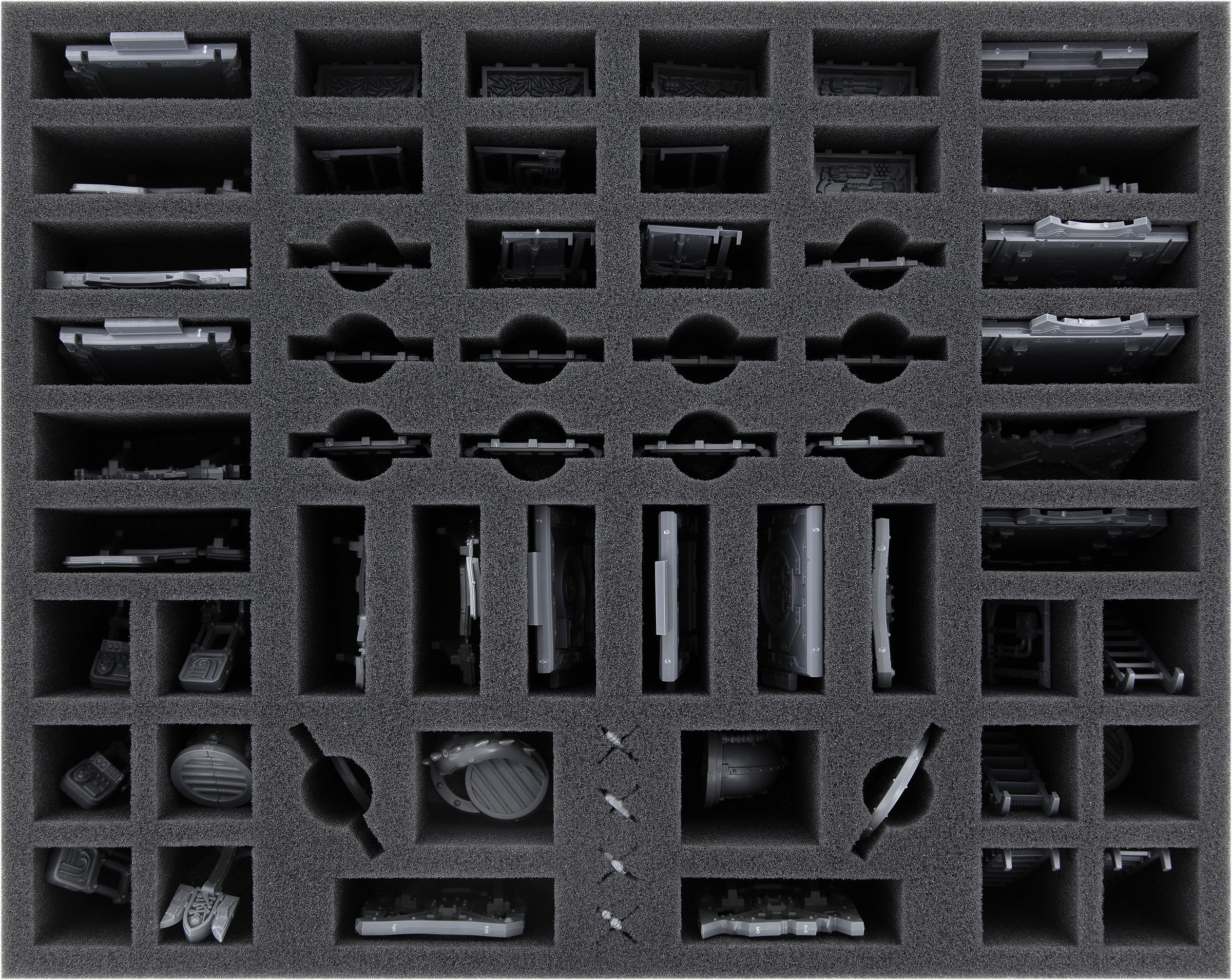 For particularly bulky terrain parts of the Zone Mortalis, as well as for token and game cards, a pre-perforated Pick & Pluck foam tray is included. To fit your models into it, or create a custom compartment, just remove the appropriate foam segments and then glue the insert to the included base. Done!