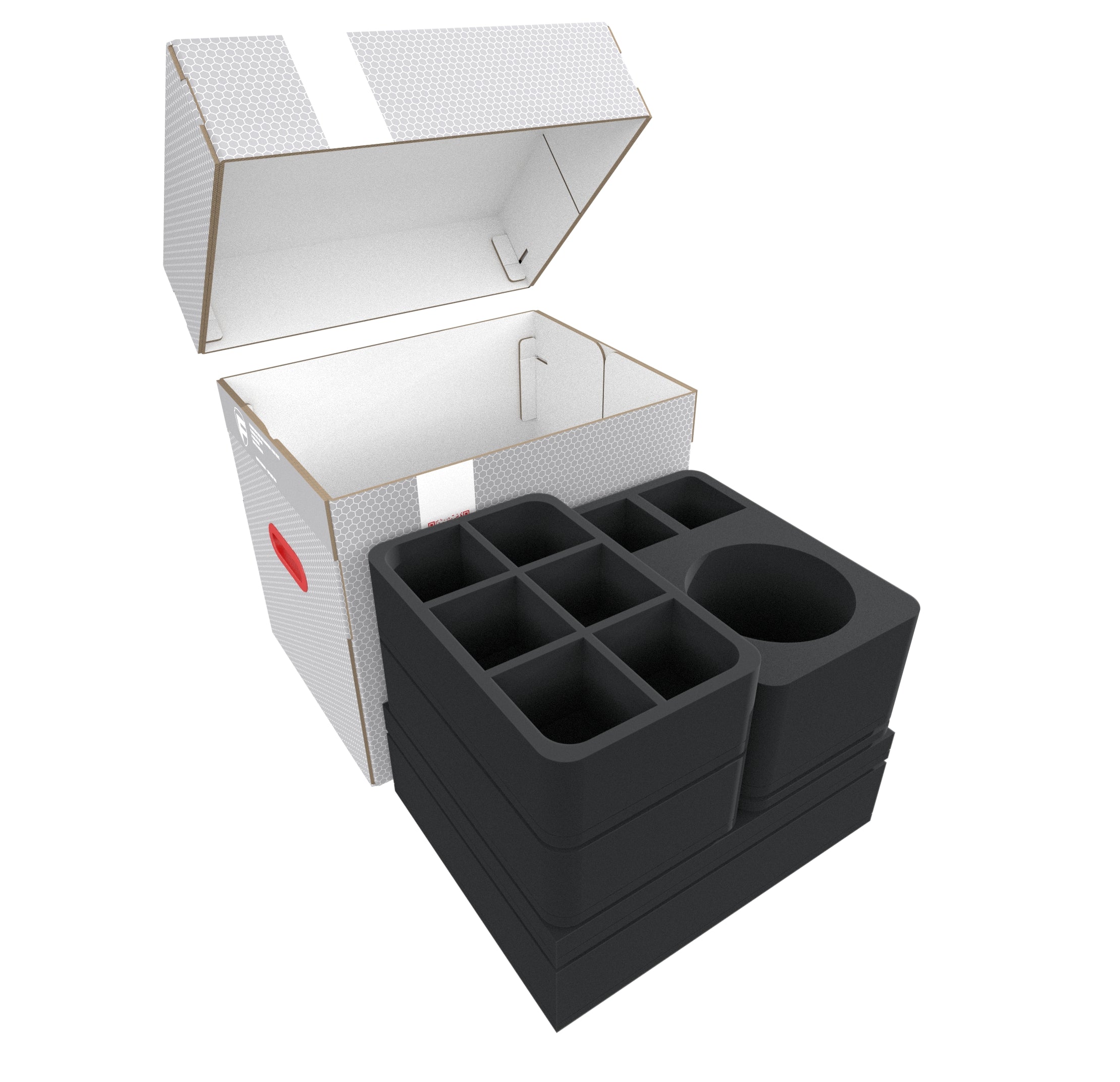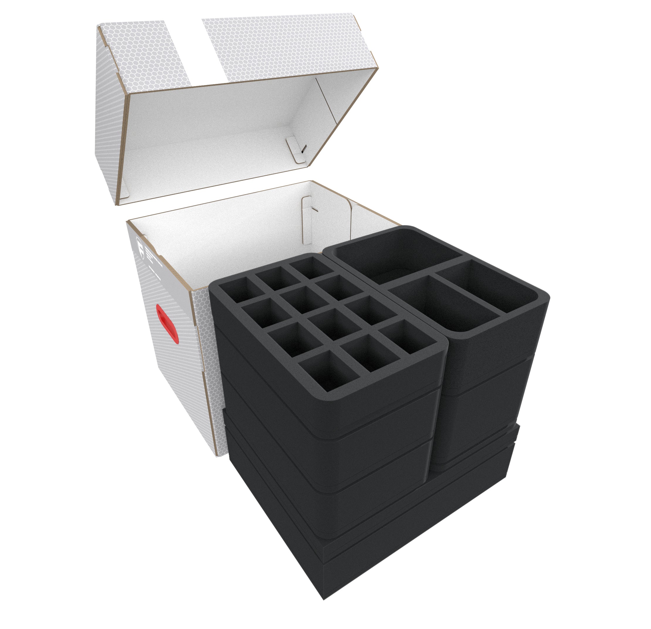The two Full-Size and five Half-Size foam trays optimally protect your miniatures. Each model receives its own custom-fit cut compartment. The high-quality foam ensures secure placement during transport, protecting delicate details like weapons, antennae, and bionic limbs from damage. The soft foam prevents the colors of your painted figures and protects against paint chipping and ugly scratches.