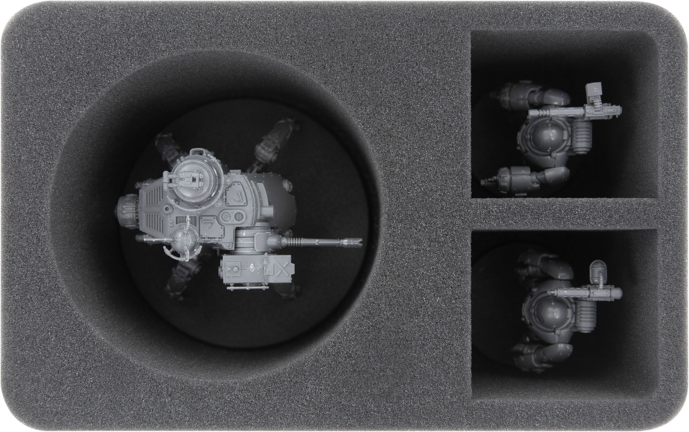 - 1 Half-Size foam tray with three compartments for Belisarius Cawl, Kastelan Robots, and similar-sized models (HS080A018)