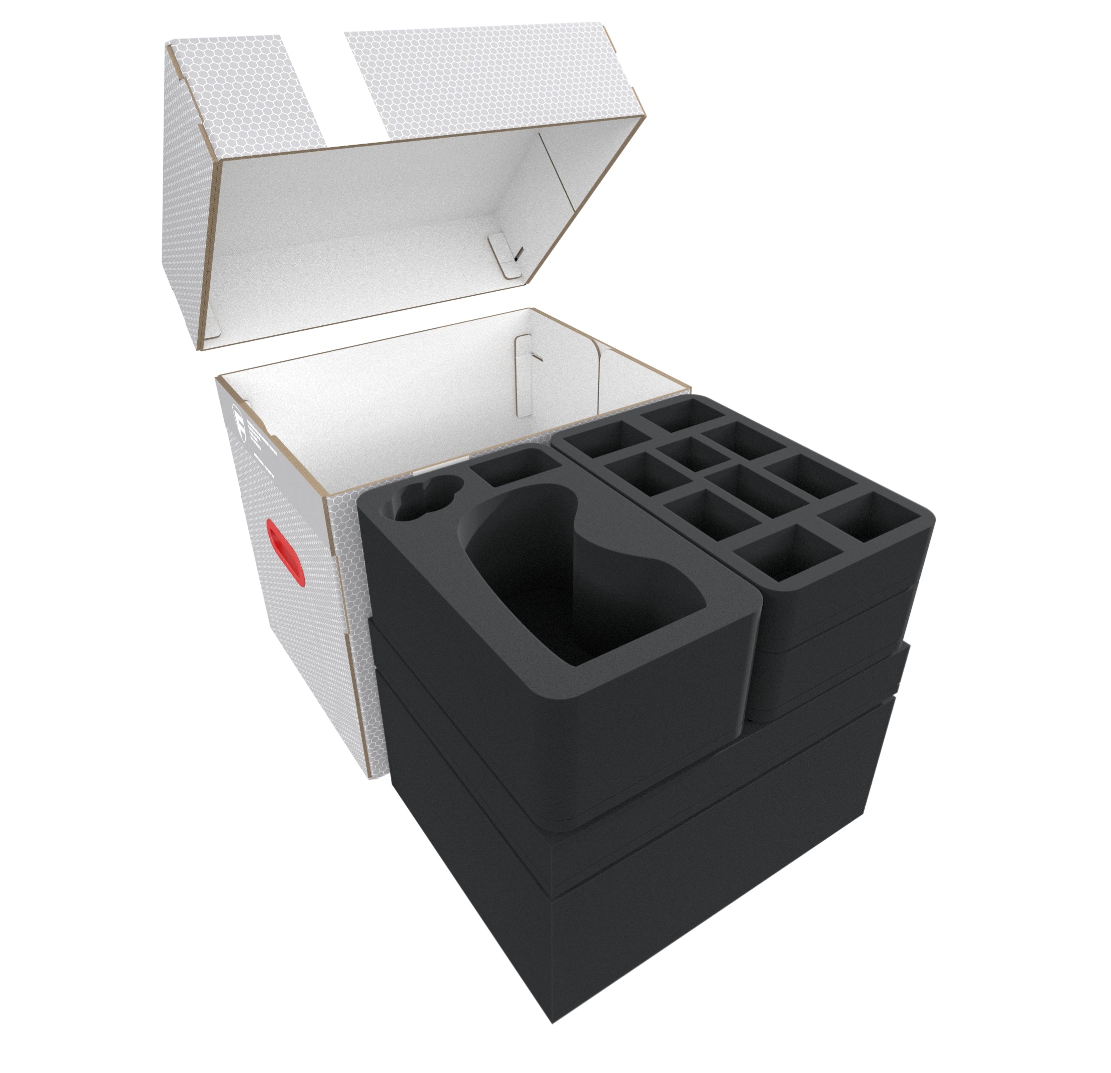 The Storage Box FSLB310 is made of coated, double-walled cardboard. This makes it not only pleasantly light but also very tear-resistant and stable. The attachable lid reliably protects the contents from dust and other external influences. With the appropriate foam trays, miniatures, game material, and all other goods can be stored safely - and conveniently transported with the two plastic-reinforced carrying handles on the sides.