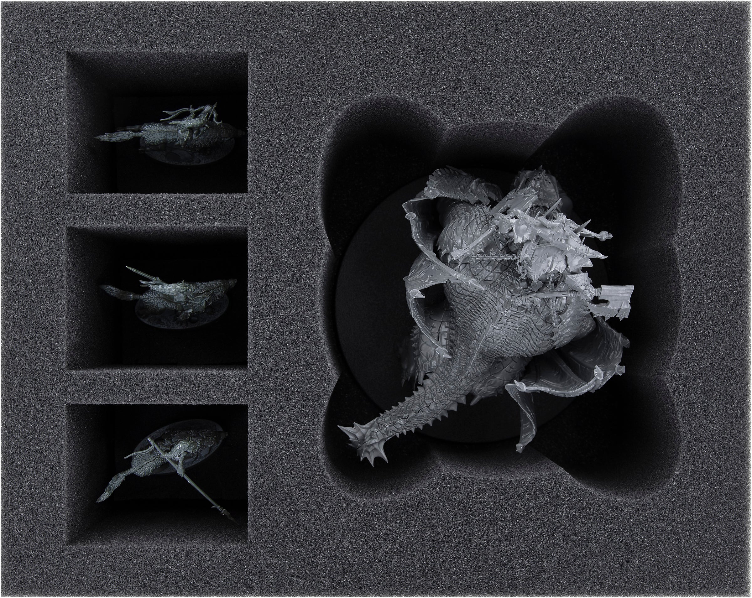 Each miniature in your collection gets its own custom-fit compartment here. This ensures that your models remain safely in place during transport. The soft foam protects the sensitive parts of your figures and the colors of painted miniatures are just as safe from abrasion and scratches.