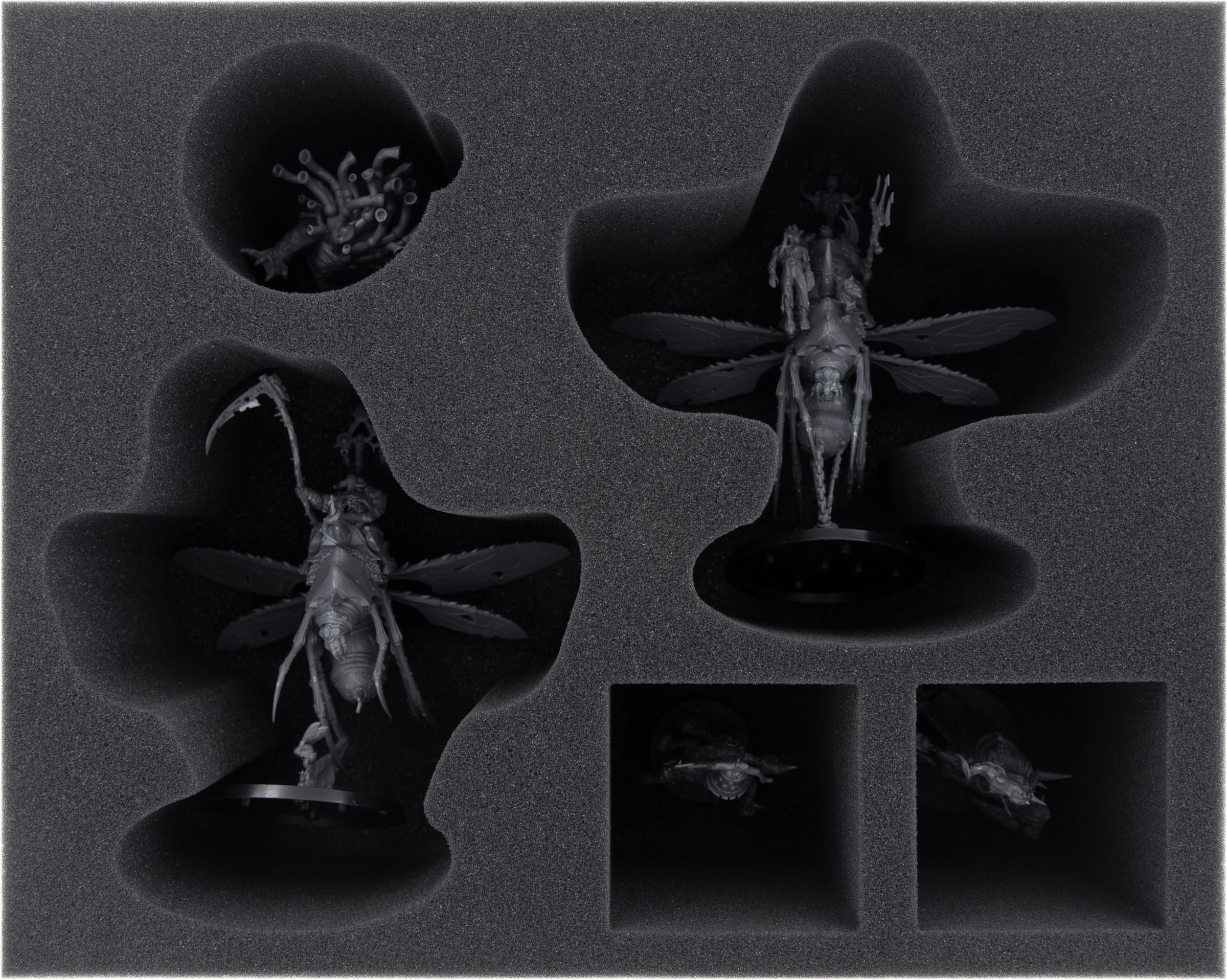 With the second foam tray you have room for three Plague Drones. For each of the three guards in the Garden of Nurgle there is a compartment that is exactly tailored to the miniature.