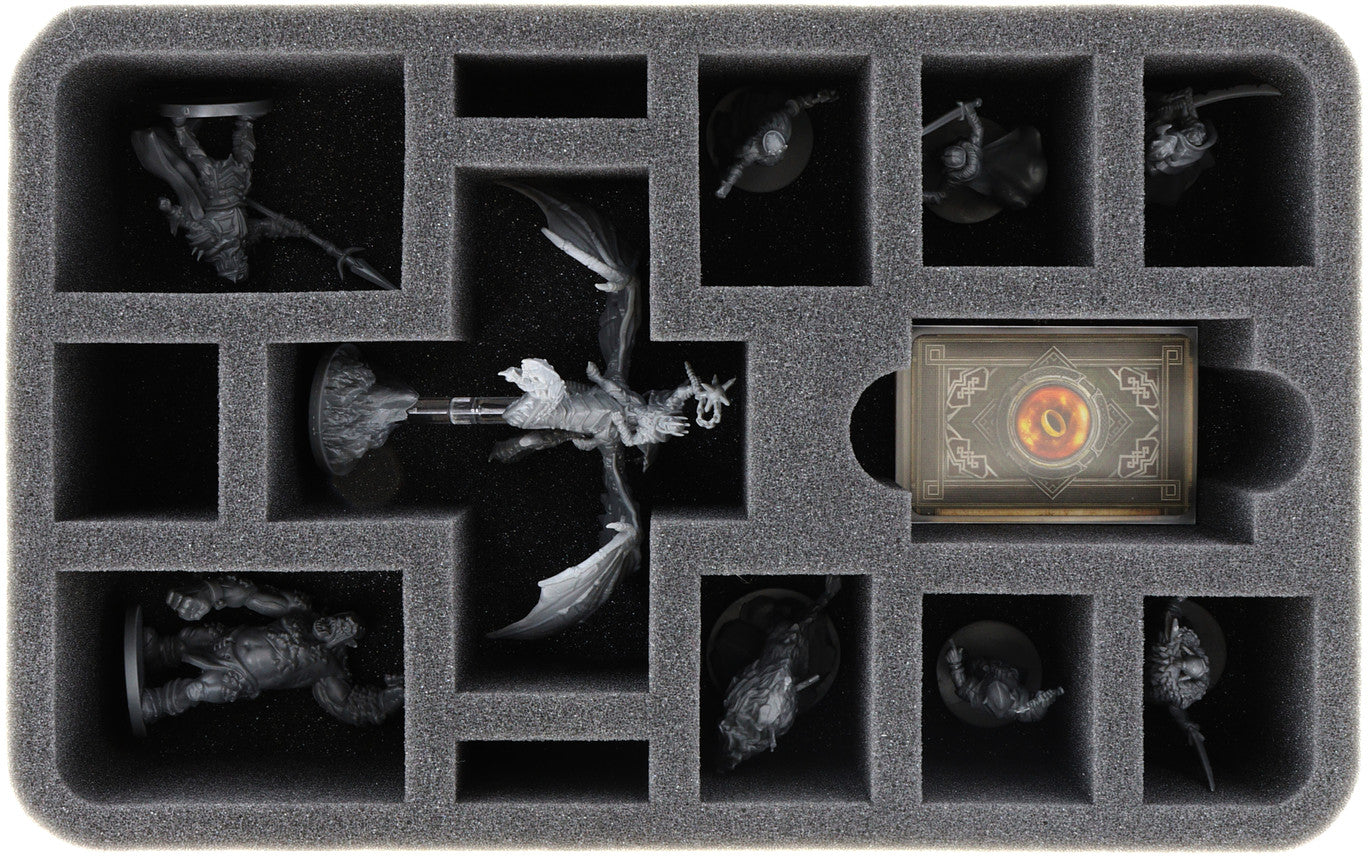 The 70 mm high foam tray is divided into 13 compartments. Whether the Witch King or Golgotar, each miniature gets its own compartment. The precisely fitting cut ensures the figures have a firm seat and do not slip during transport. The soft foam reliably protects sensitive details from damage. The colors of painted figures are also safe, as the foam prevents abrasion of the colors and scratches.