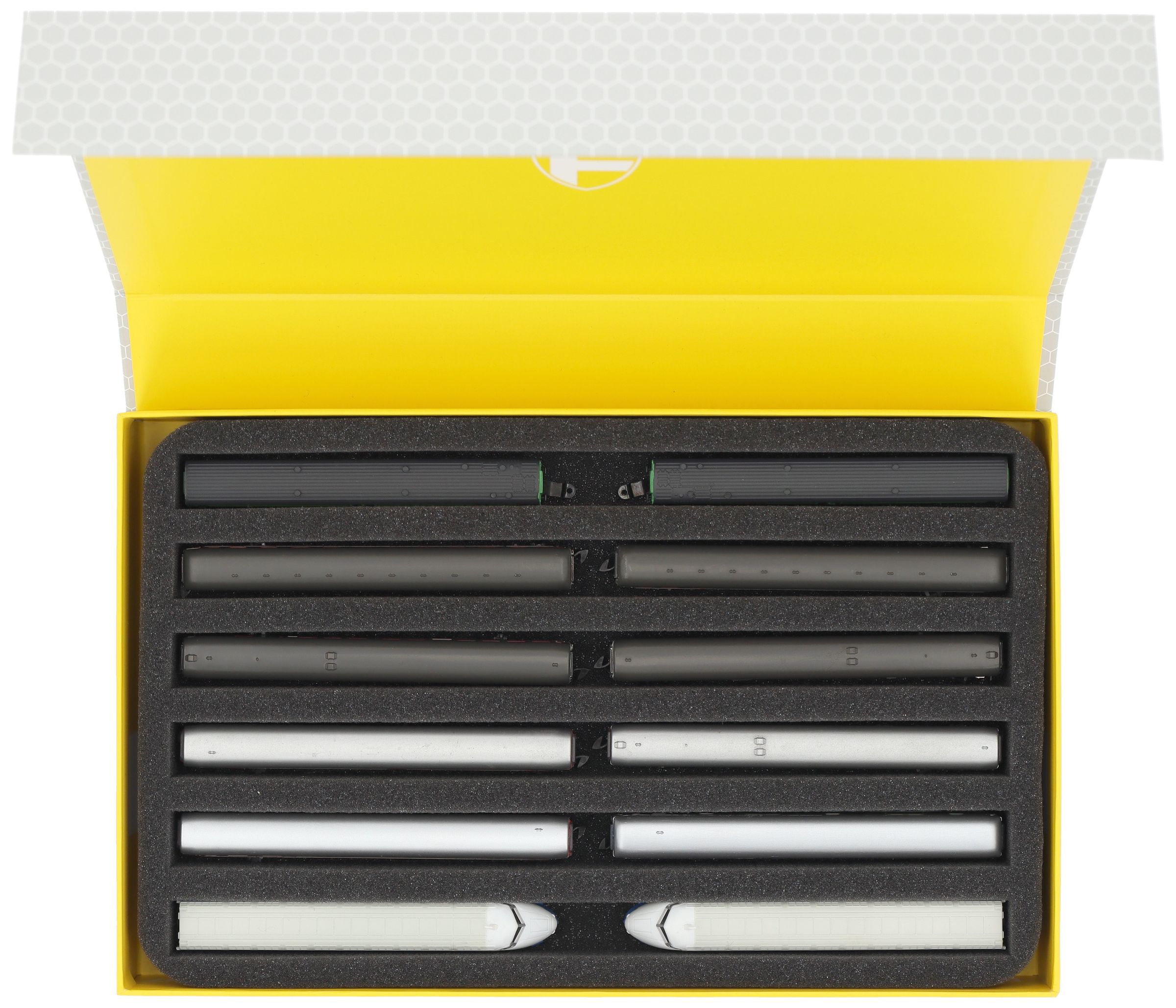 Several trains and carriages can be stored next to each other in one compartment. In order to prevent collision or unintentional coupling, we offer suitable foam spacers (HS040A002, HS020A001) to separate your model trains.