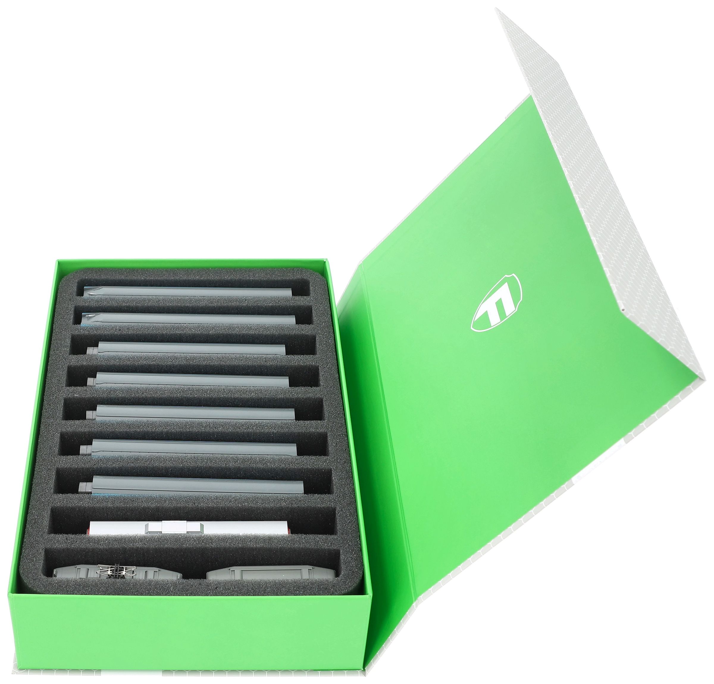 Nine compartments, custom-made for storing model railways in N scale, offer your wagons and locomotives reliable protection for storage and transport.