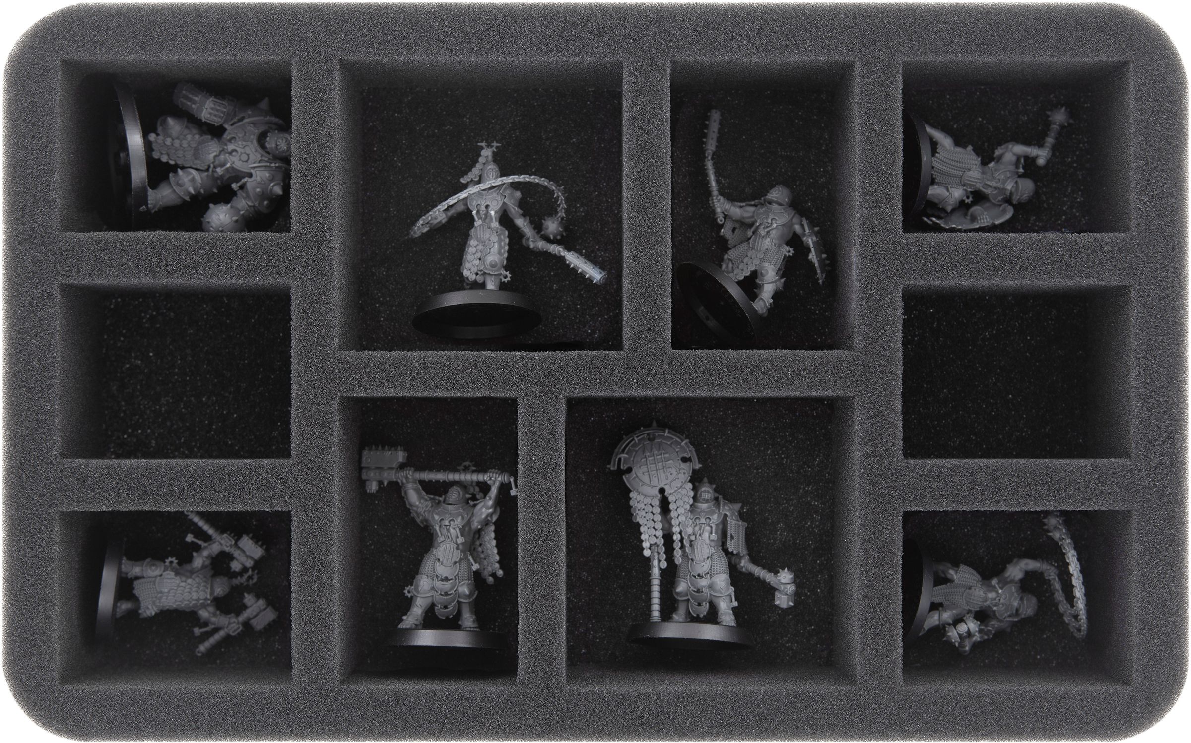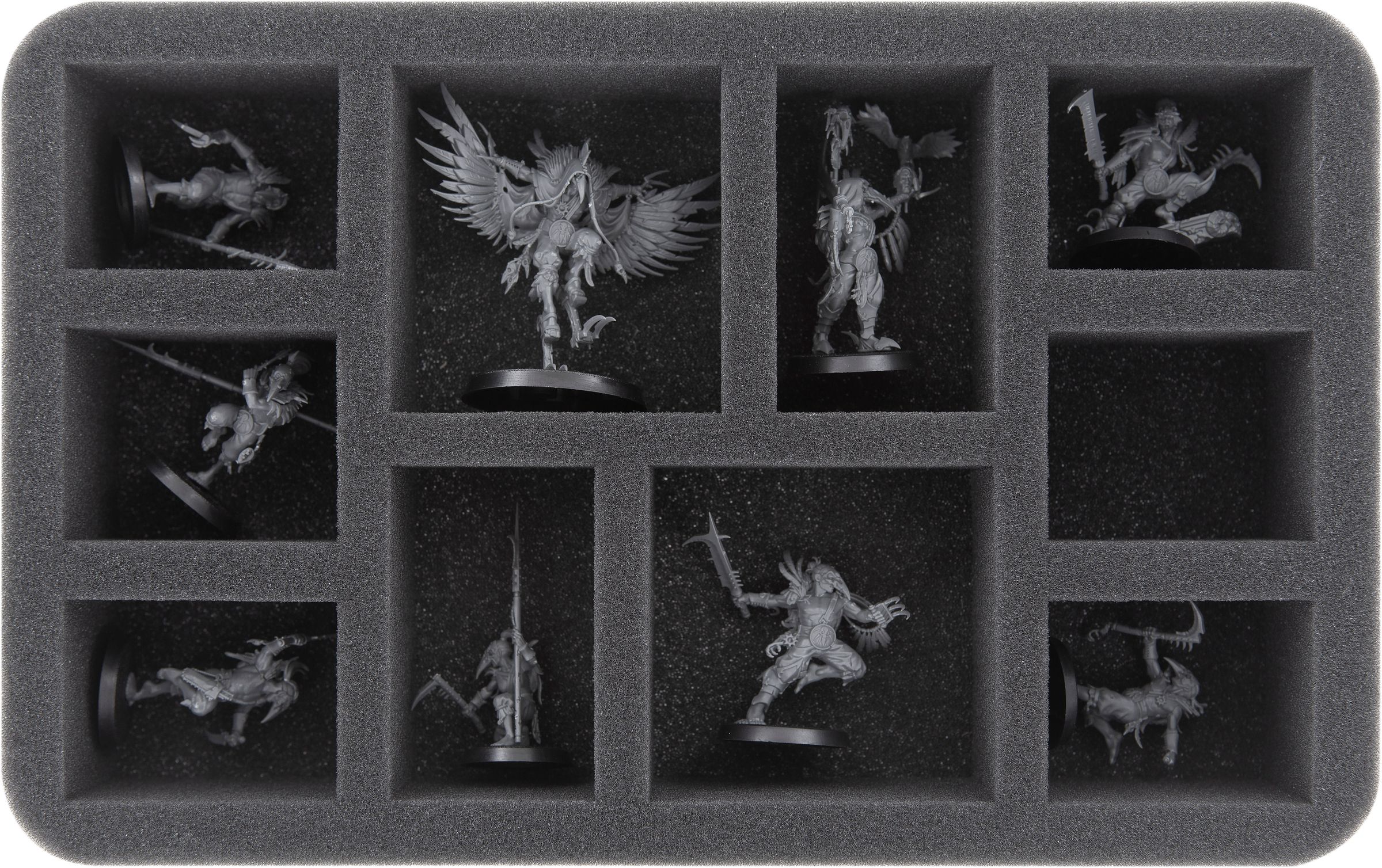 The insert is divided into ten compartments in which you can stow your warrior models safely. Each of the 9 models has its own compartment.