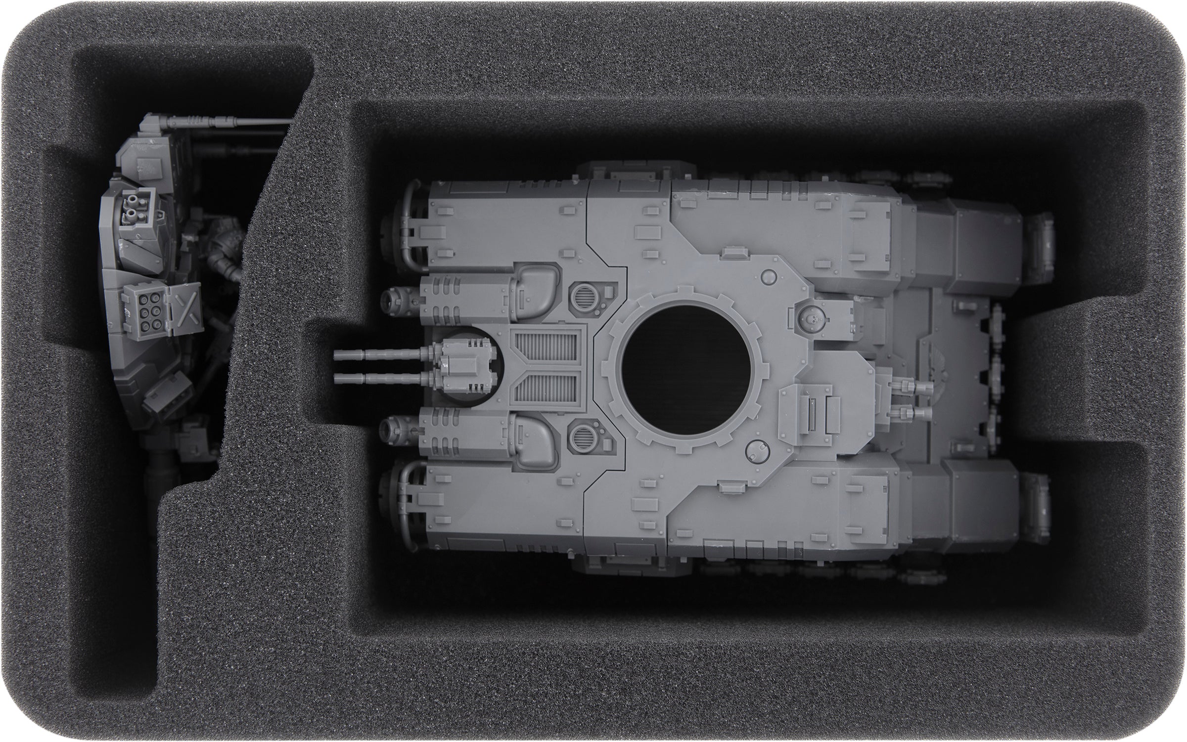 The large compartment on the HSMETN095BO insert houses the hull of the anti-gravitic battle tank. The compartment is exactly tailored to the Repulsor Executioner of the Primaris Space Marines and ensures that the miniature is securely packed all around. The krakstorm grenade launchers and the two storm bolters remain just as intact during transport as the radar arrays. To ensure that the Plasma Incinerators or the Laser Destroyers are also safely accommodated, there is also a tailored compartment for the turret.