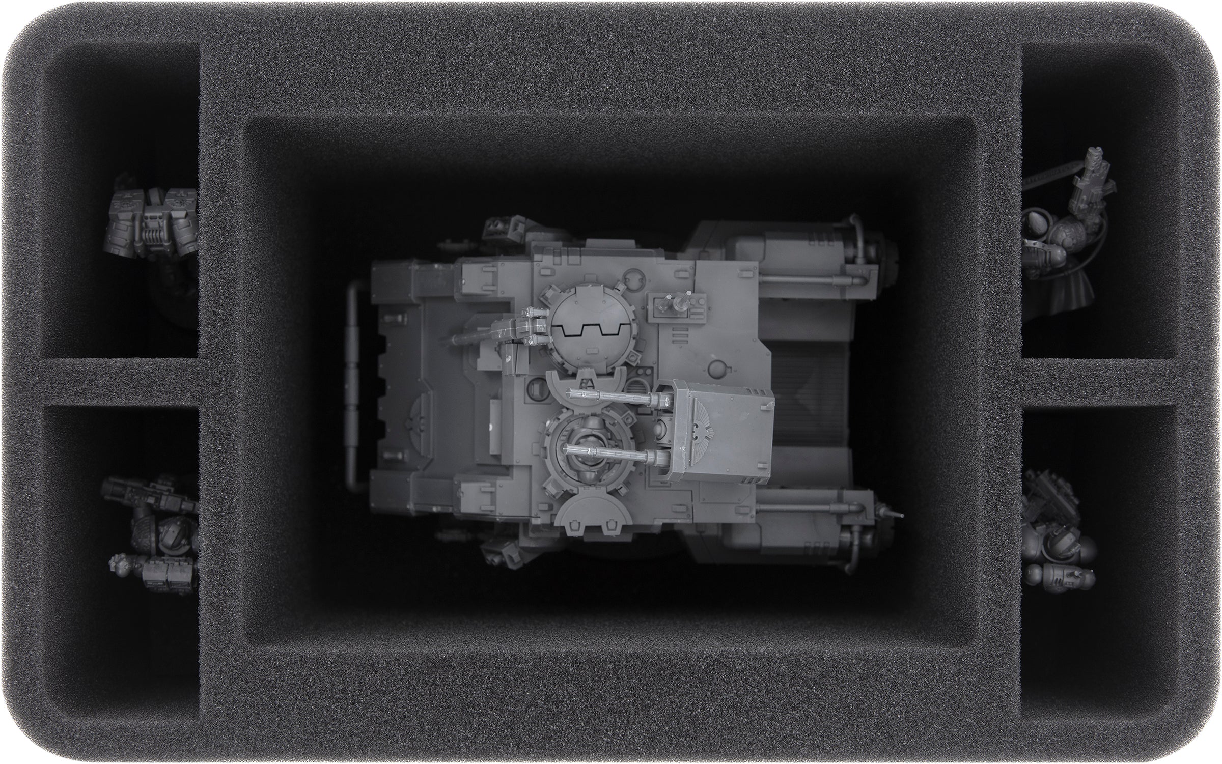Your Impulsor is best stored in the tall Half-Size foam tray. In addition to the large compartment for the Impulsor, you are left with four rectangular compartments that can hold additional Adeptus Astartes units on 32 mm Bases.