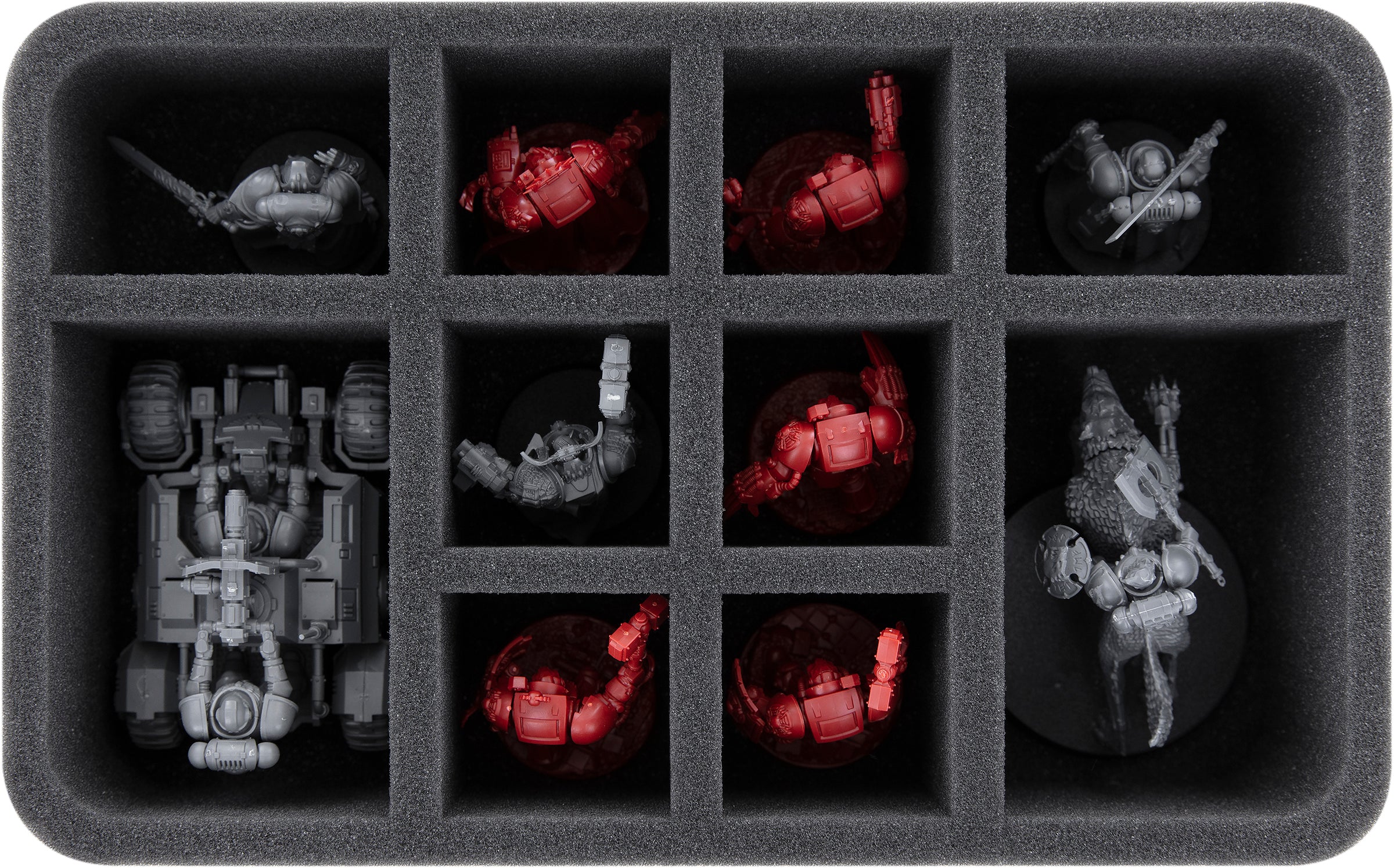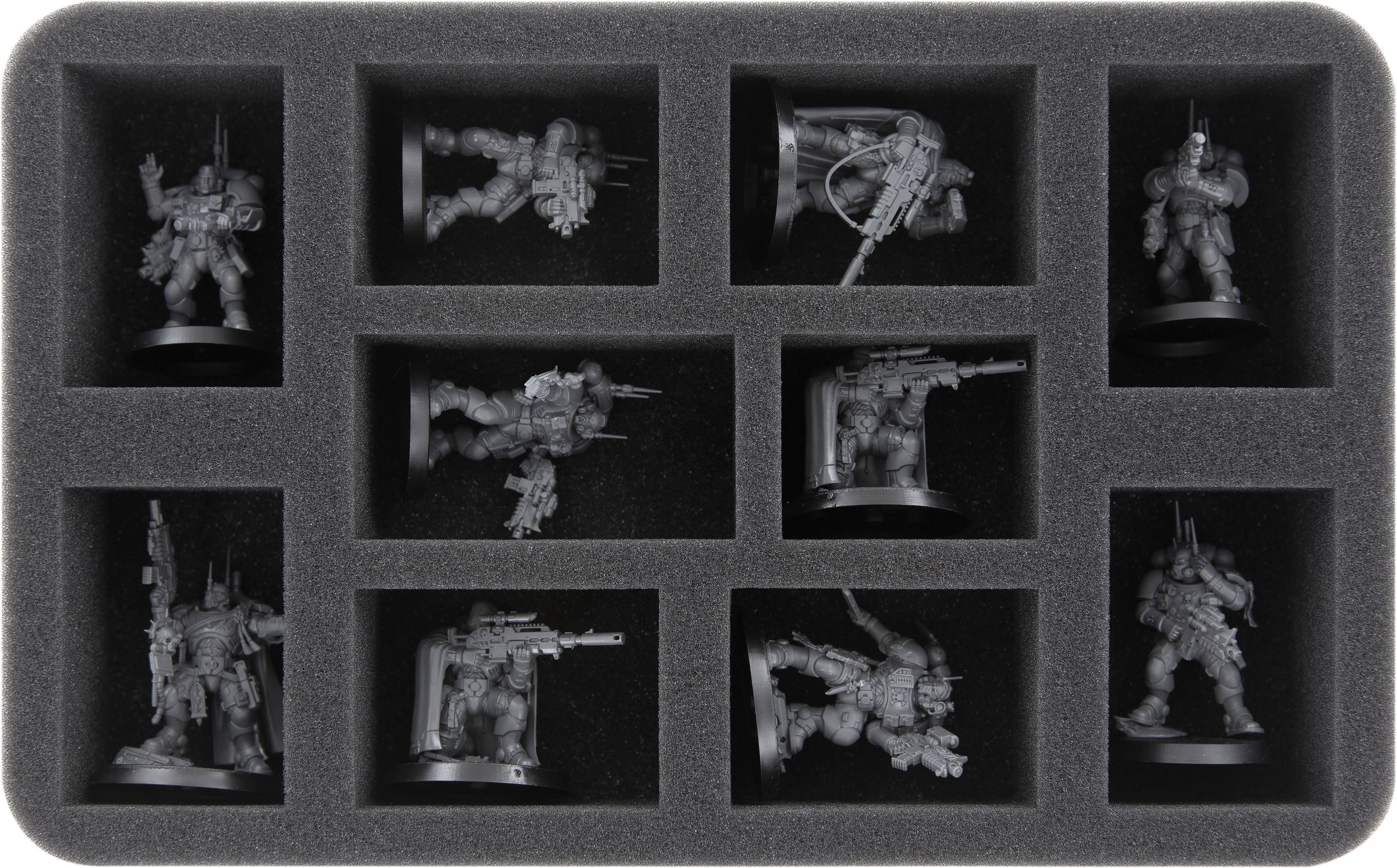 The final Half-Size foam tray is divided into ten compartments. The different sized compartments are ideal for keeping larger or wider Adeptus Astartes models neat and safe. That's why it works well for your bulky Aggressors and the dynamic Incursors / Infiltrators.