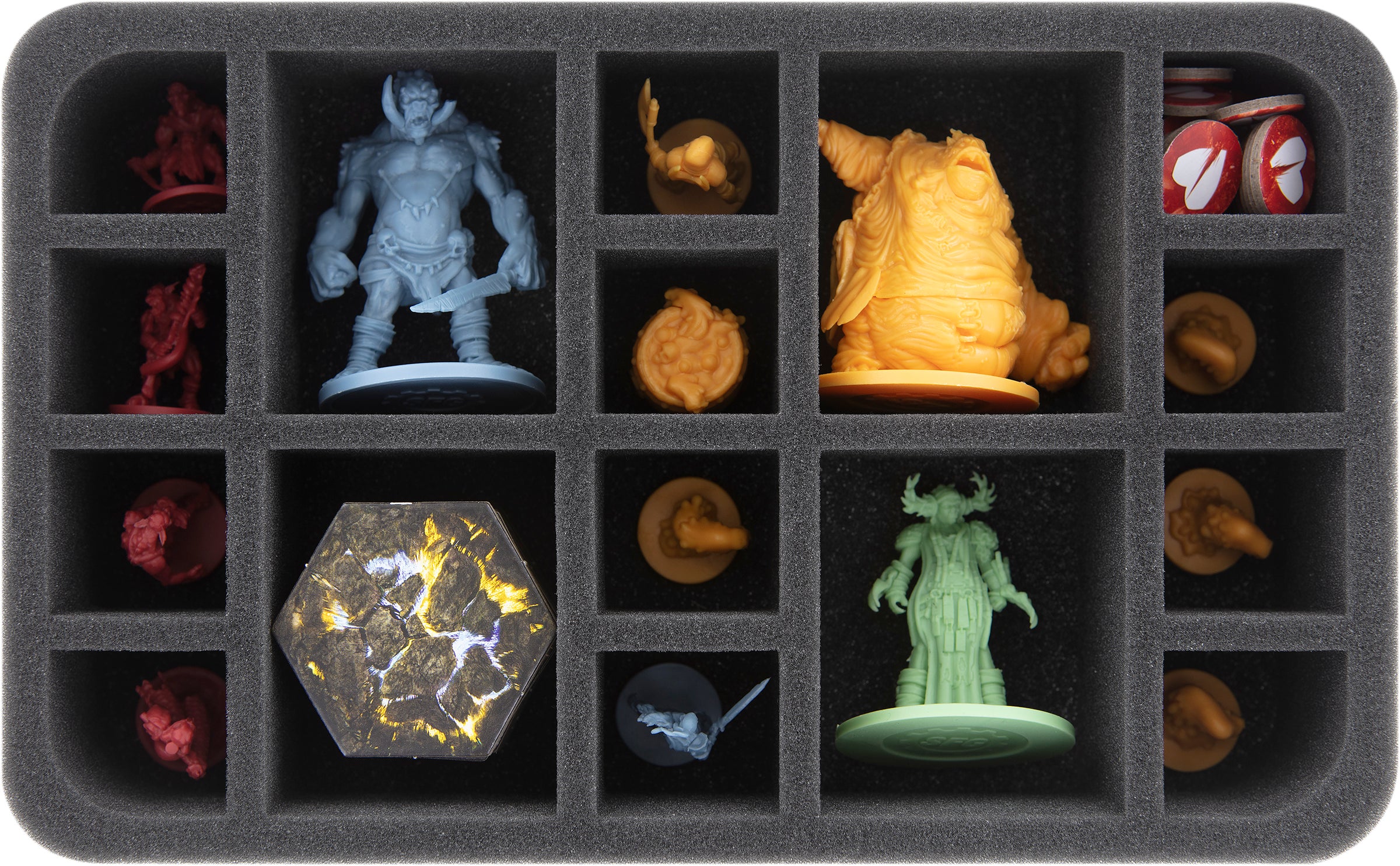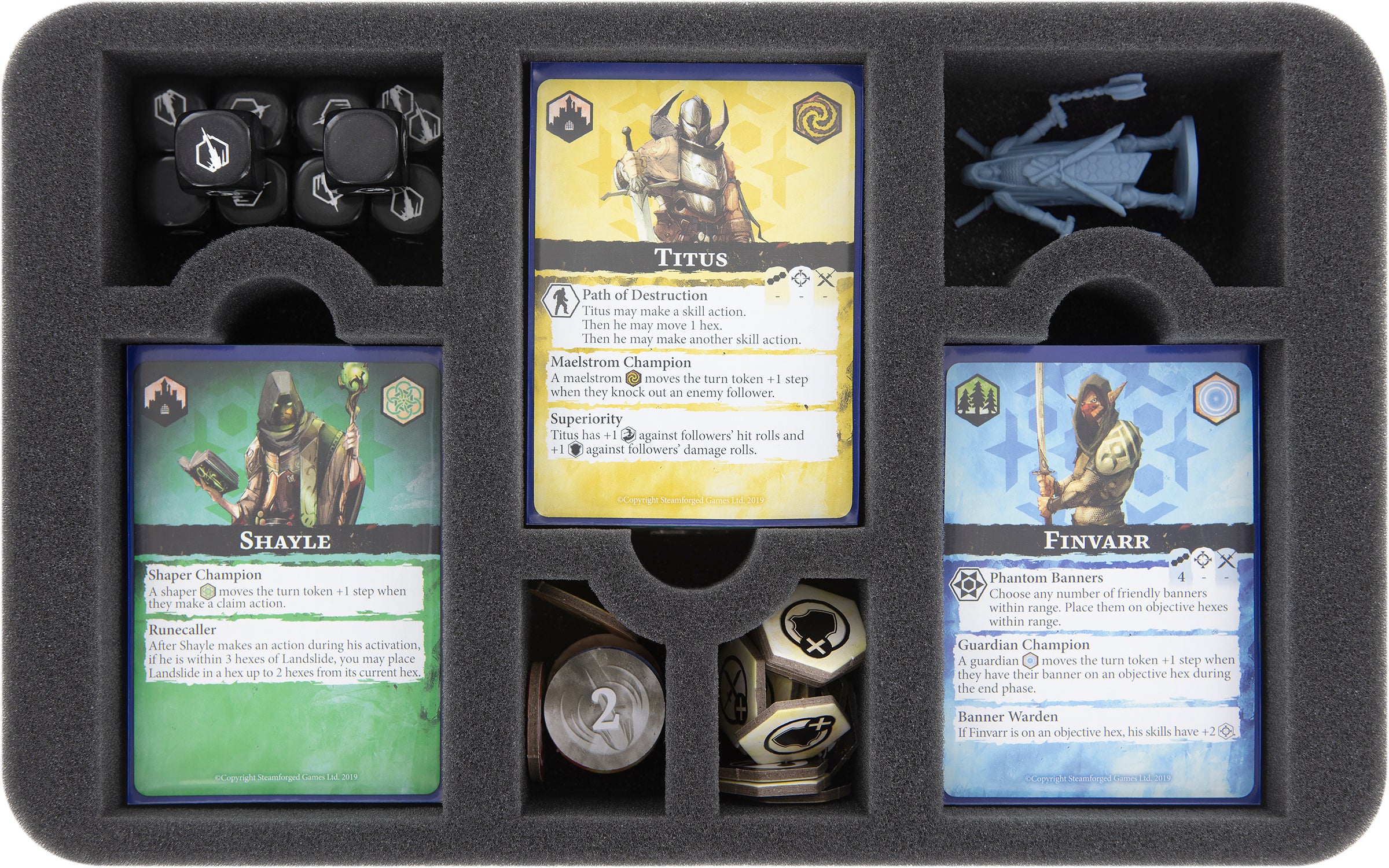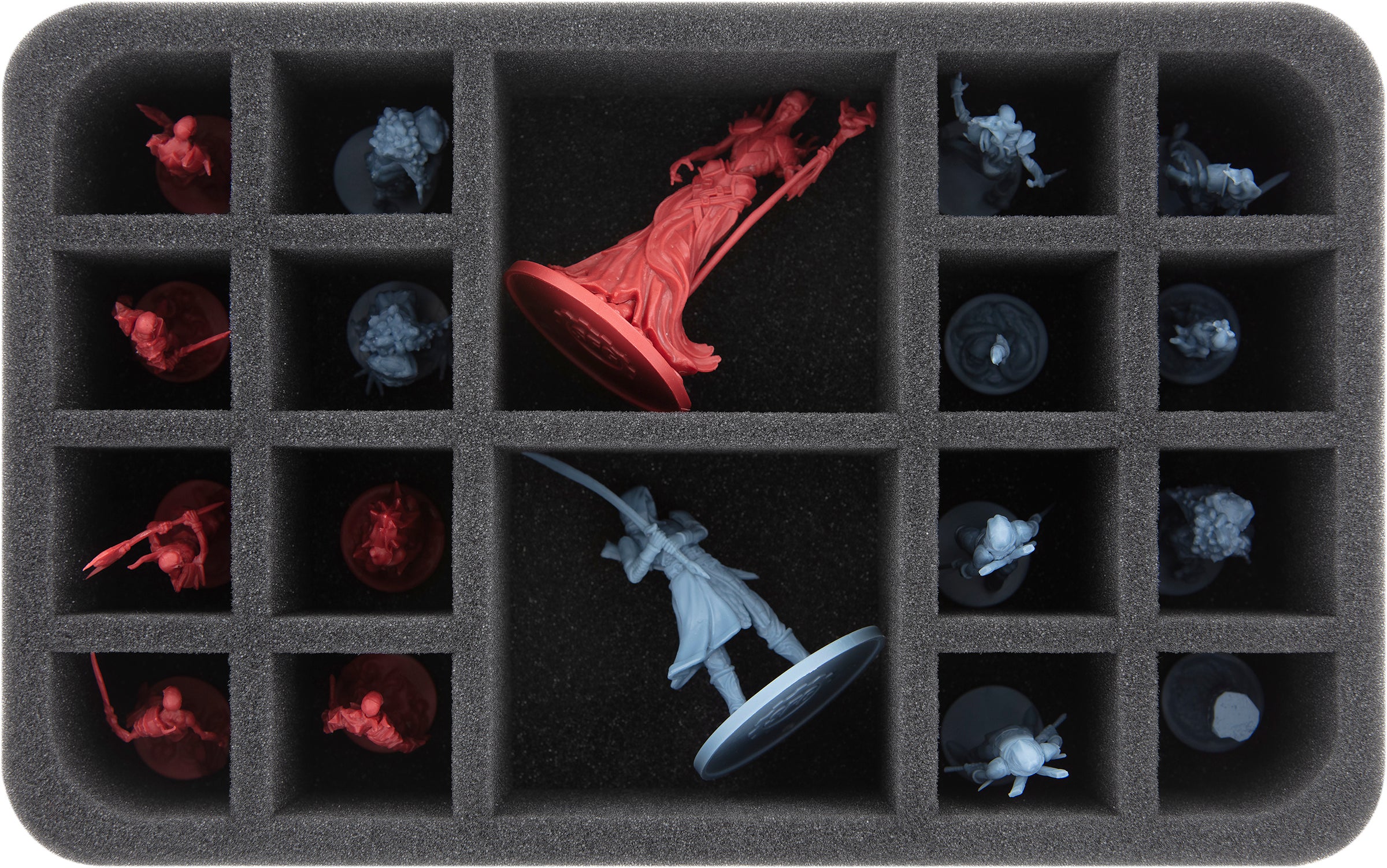 All 53 miniatures from the two Starter Sets and the five expansions find a safe home on five foam inserts. From Mournblade, the Soulless, to Nia, The Crystalmancer, to Halftusk, Warden of the Stonekin Isle - every champion and every follower gets the fitting compartment.
