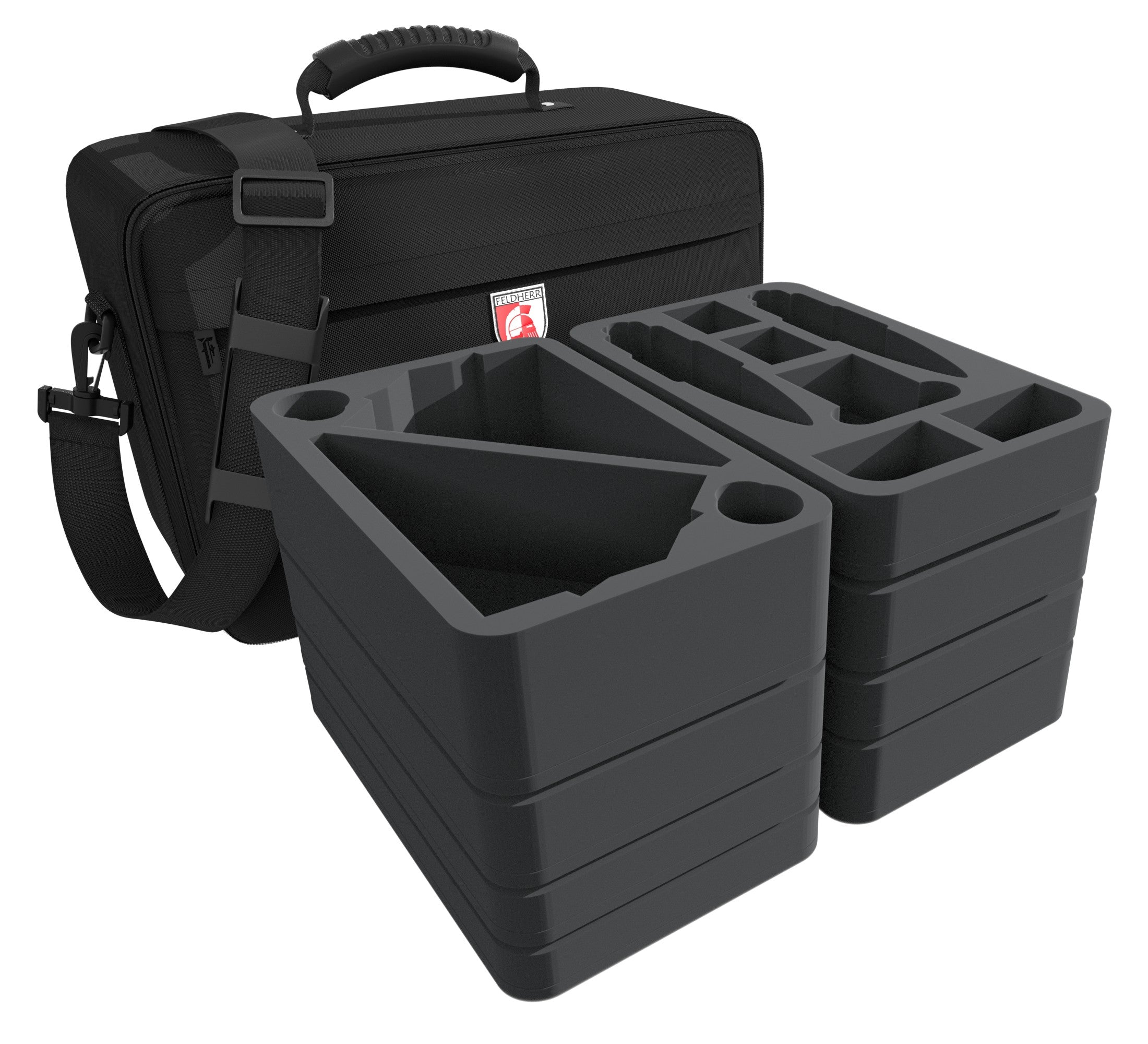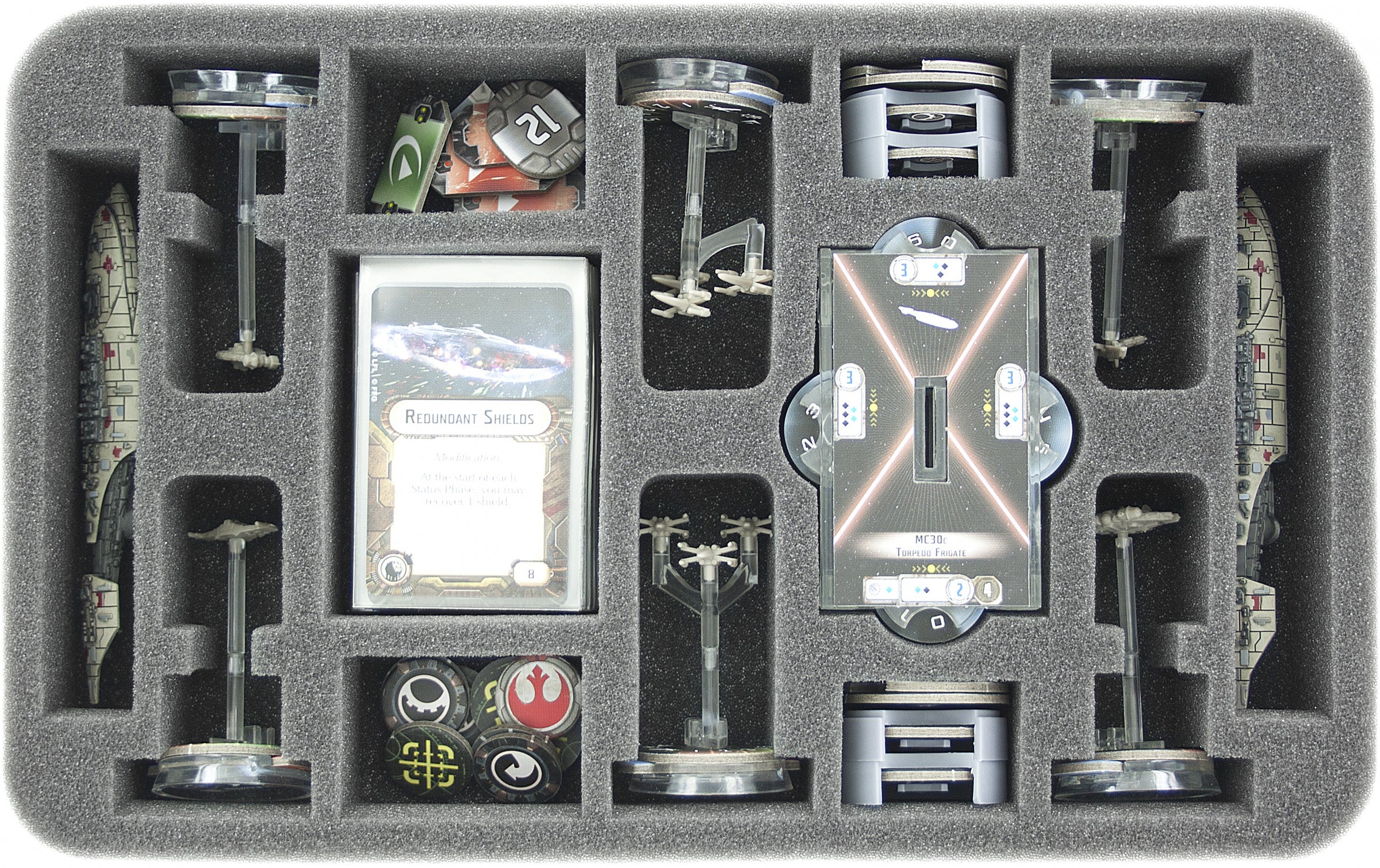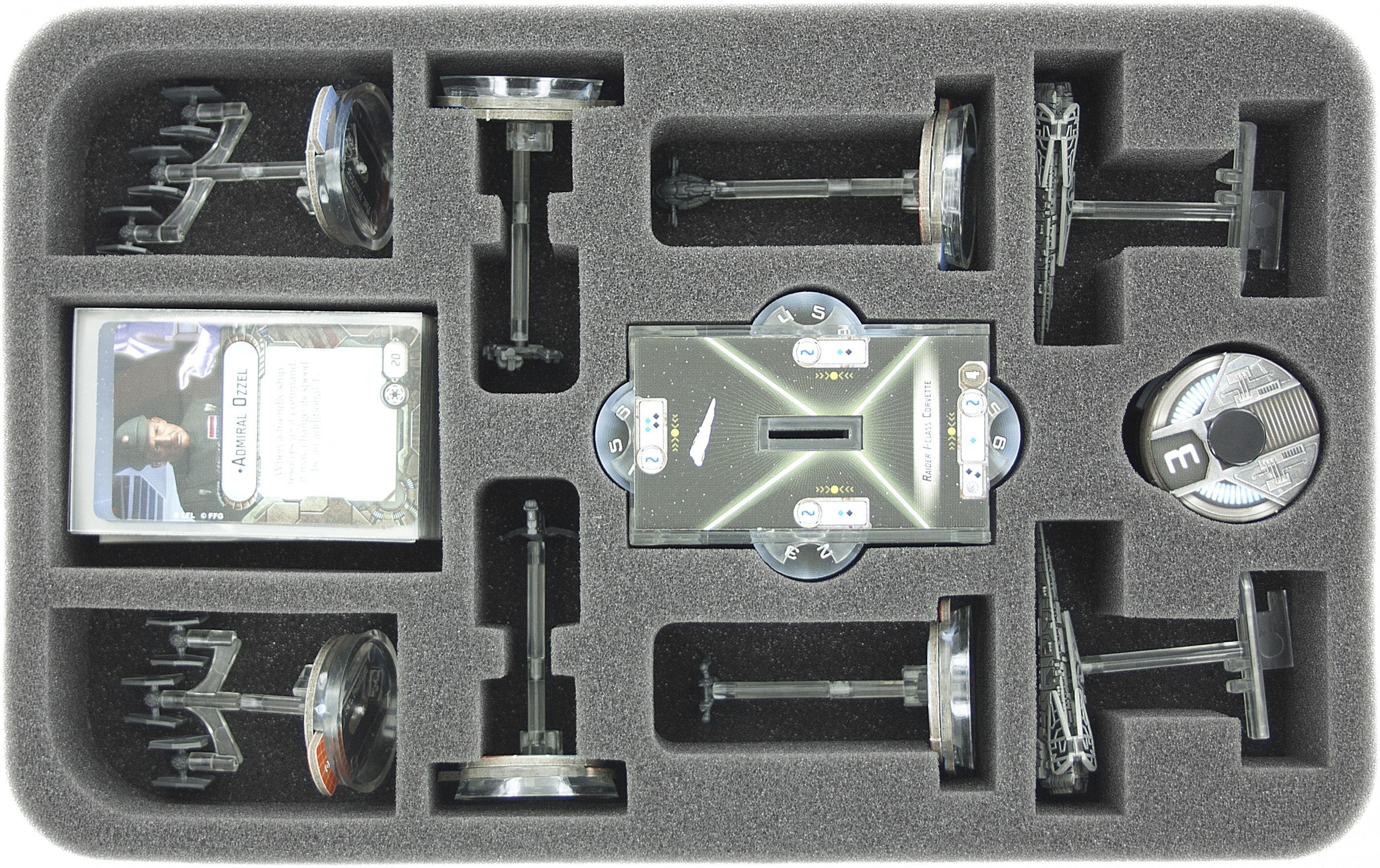 Feldherr Maxi Bag for Star Wars Armada. The Bag comes with foam trays for the entire Wave 2. In addition, there is enough space for cards in sleeves, Commando and Speed Dials.