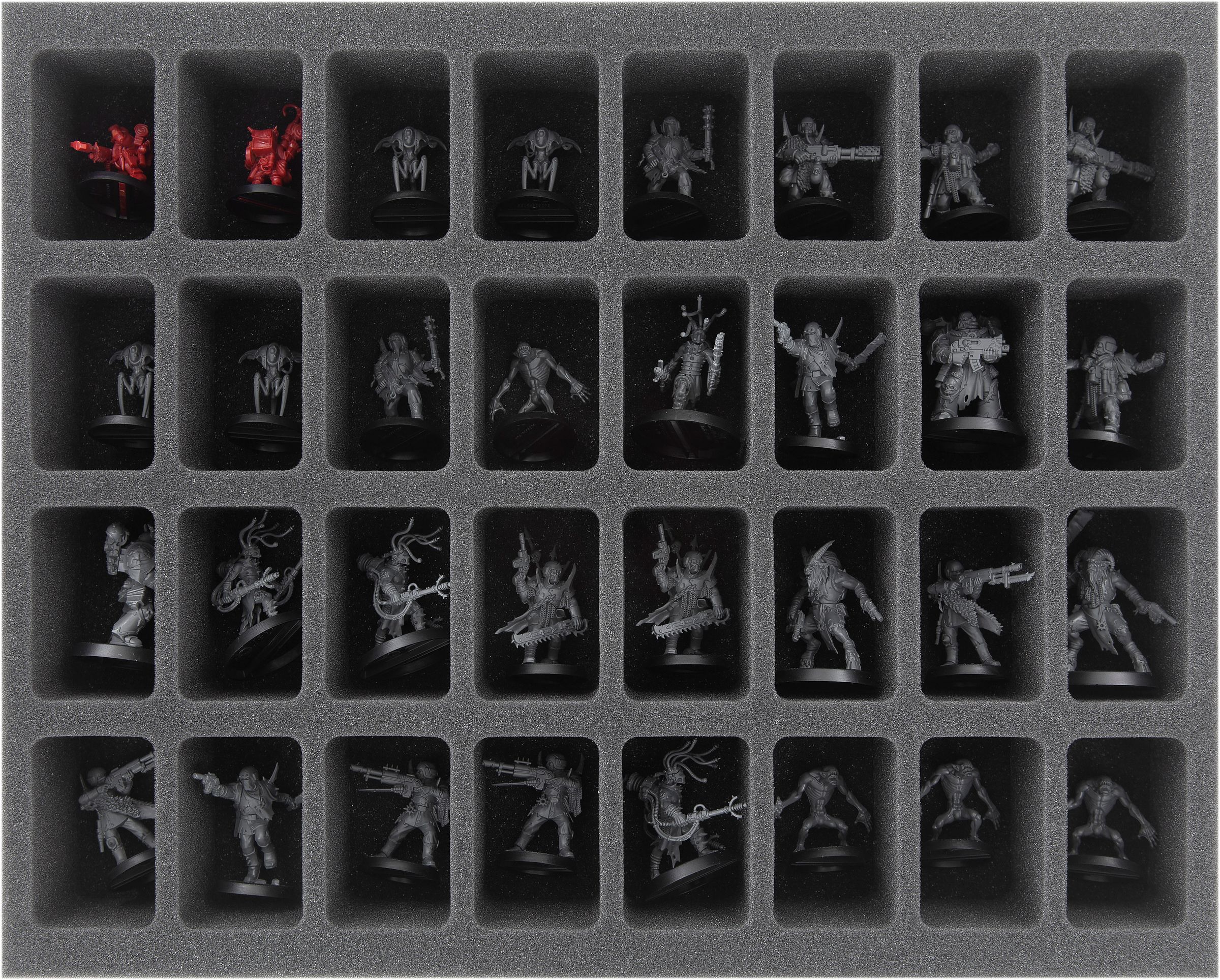 You place the remaining models from the core game on the Half-Size insert with 12 compartments. Here the warriors with expansive poses, scepters or larger weapons get a little more space. So Obsidius Mallex, the Rogue Psychers or UR-025 also have a suitable sized shelter. The fine miniatures are safe here and sensitive parts such as Vindictor, Chaos Stave or Monomolecular rapier are preserved from damages.