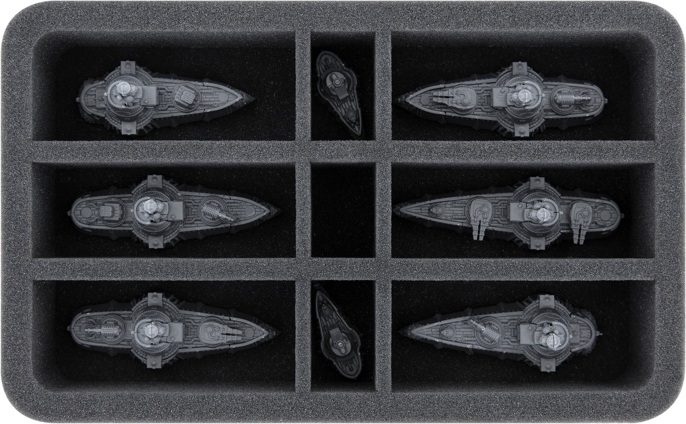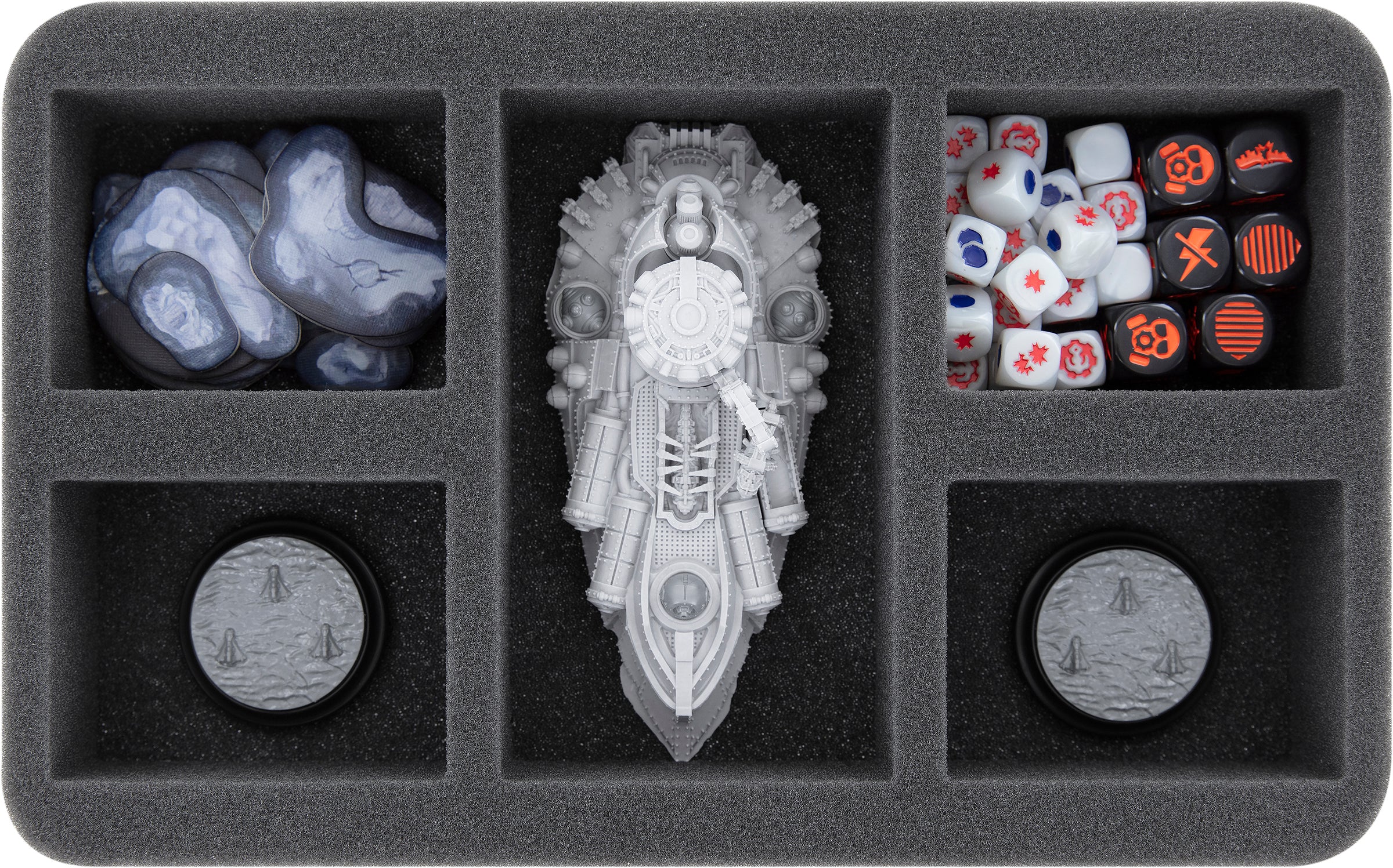 - 1 Half-Size foam trays with 5 compartments for e.g. one Descartes Class Control Ship, Hypatia Class Generator Ship or Borodino Class Battleship and game material (HS050A089)