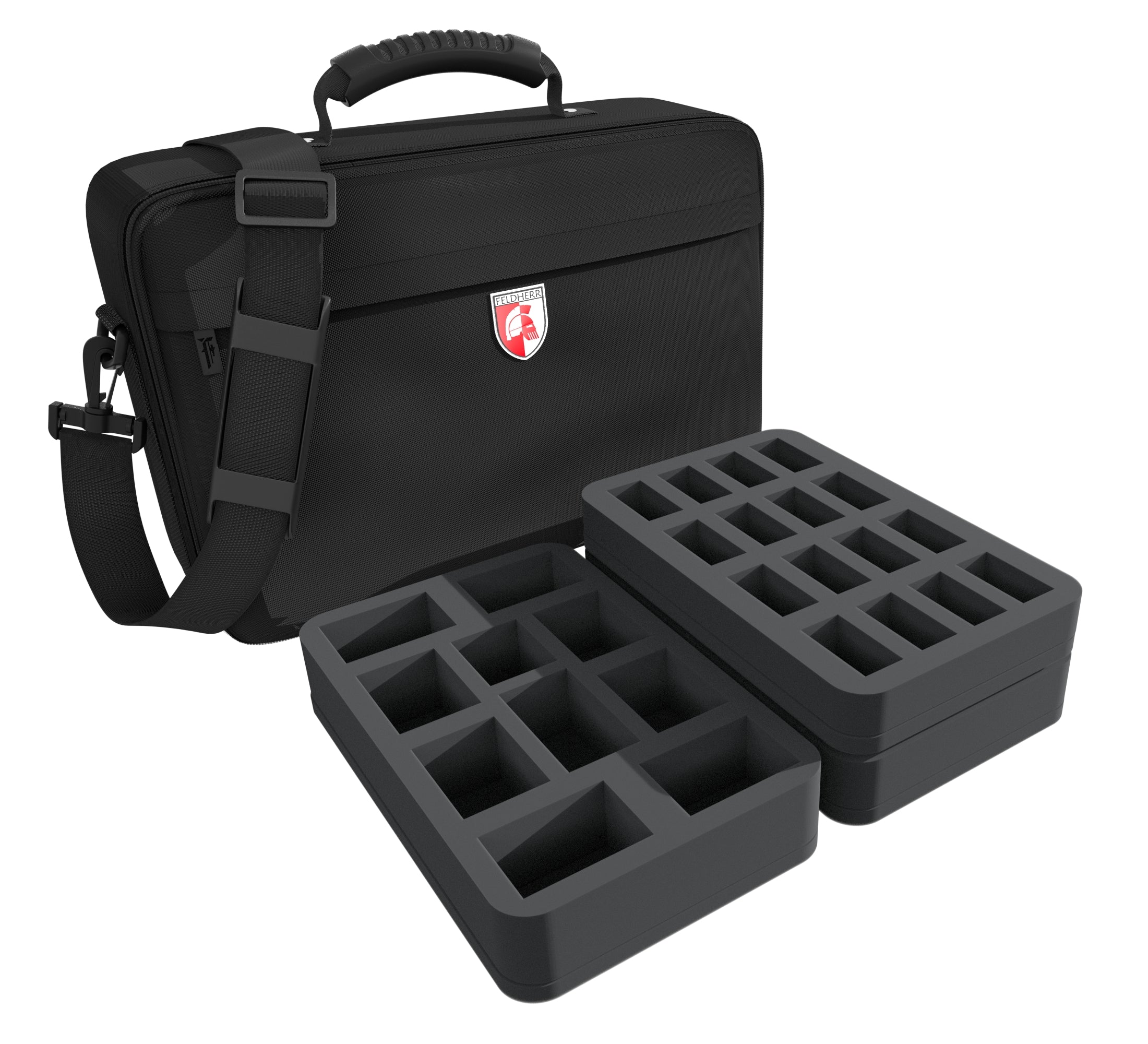 Of course, the trays fit exactly into the robust MEDIUM bag. The bag is made of particularly hard-wearing fabric and ensures that your miniatures are optimally preserved from external influences. Padded side panels and a reinforced base provide additional protection. Besides the large main compartment, the bag has a small zipped pocket at the front. Here you can stowe the rulebooks, for example.