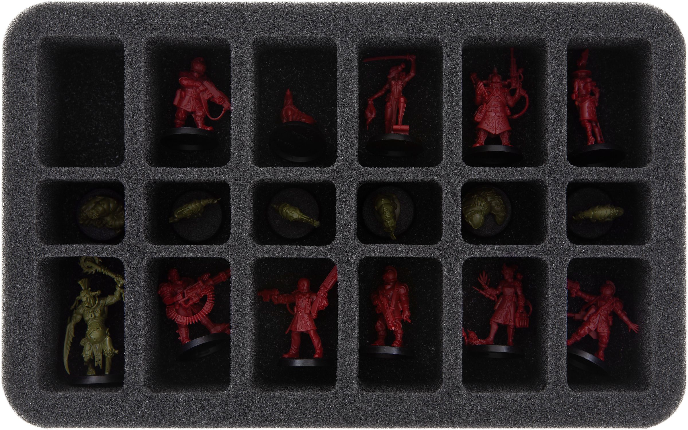 Two foam trays offer the right compartment for each of the 23 miniatures from the Kill Team expansion 'Rogue Trader', in which they are clearly and securely stored. The precisely fitting compartments ensure that the models do not slip around or collide during transport. This not only protects the sensitive parts of the miniatures from damage. It also prevents the colors of painted figures from rubbing or flaking off after hours of fine work with brush and acrylic paint.