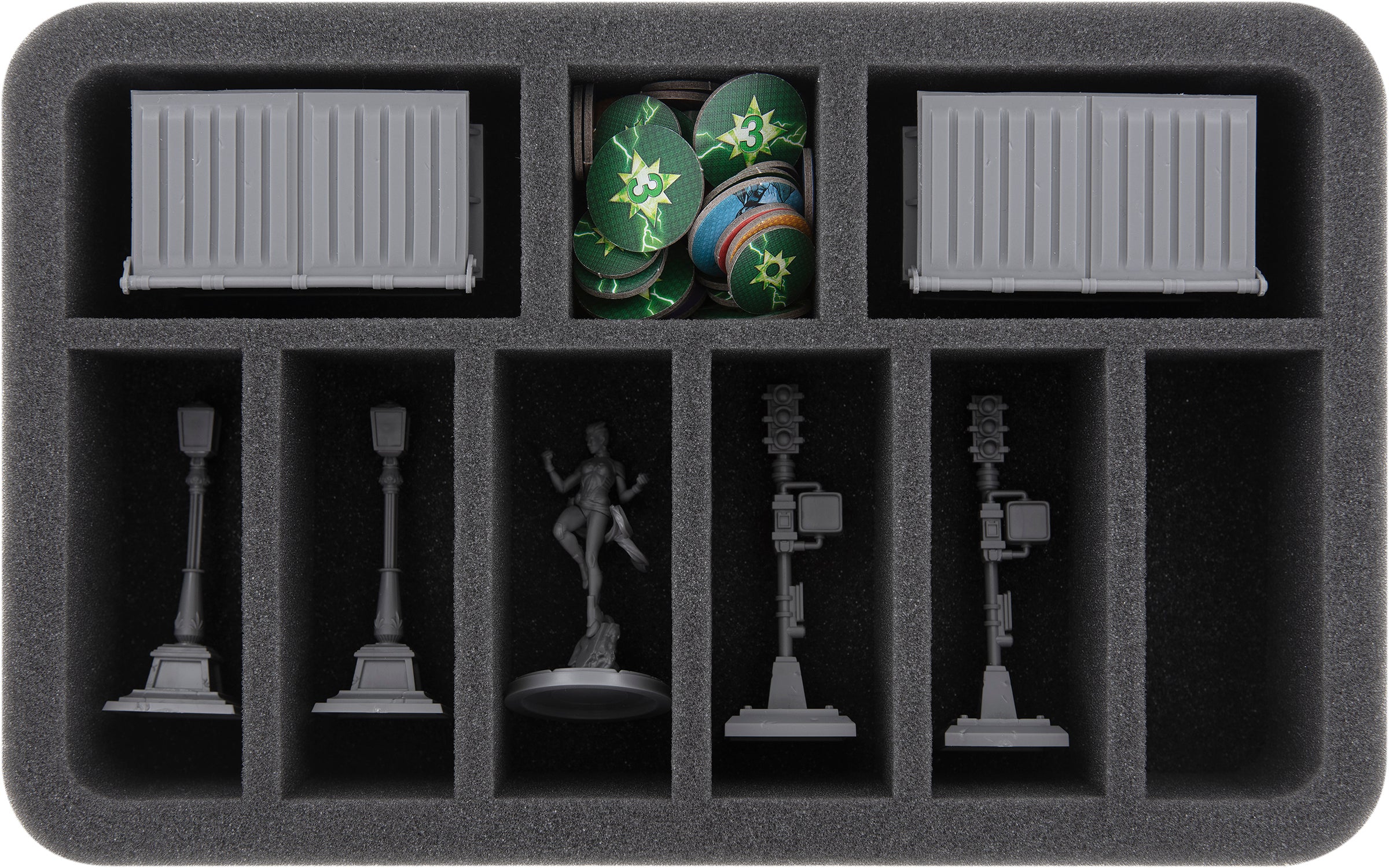 - This set provides space for all 10 character miniatures, the terrain pieces, and the complete accessories of the core box (CP01) by Atomic Mass Games.