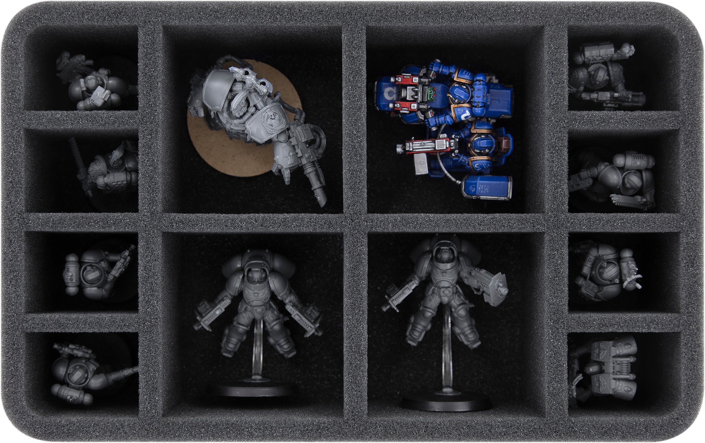 - 1 Half-Size foam tray with 10 compartments for e.g. additional Primaris Invader ATV, Terminators, Primaris Space Marines, or similar sized models (HSMFAH070BO)