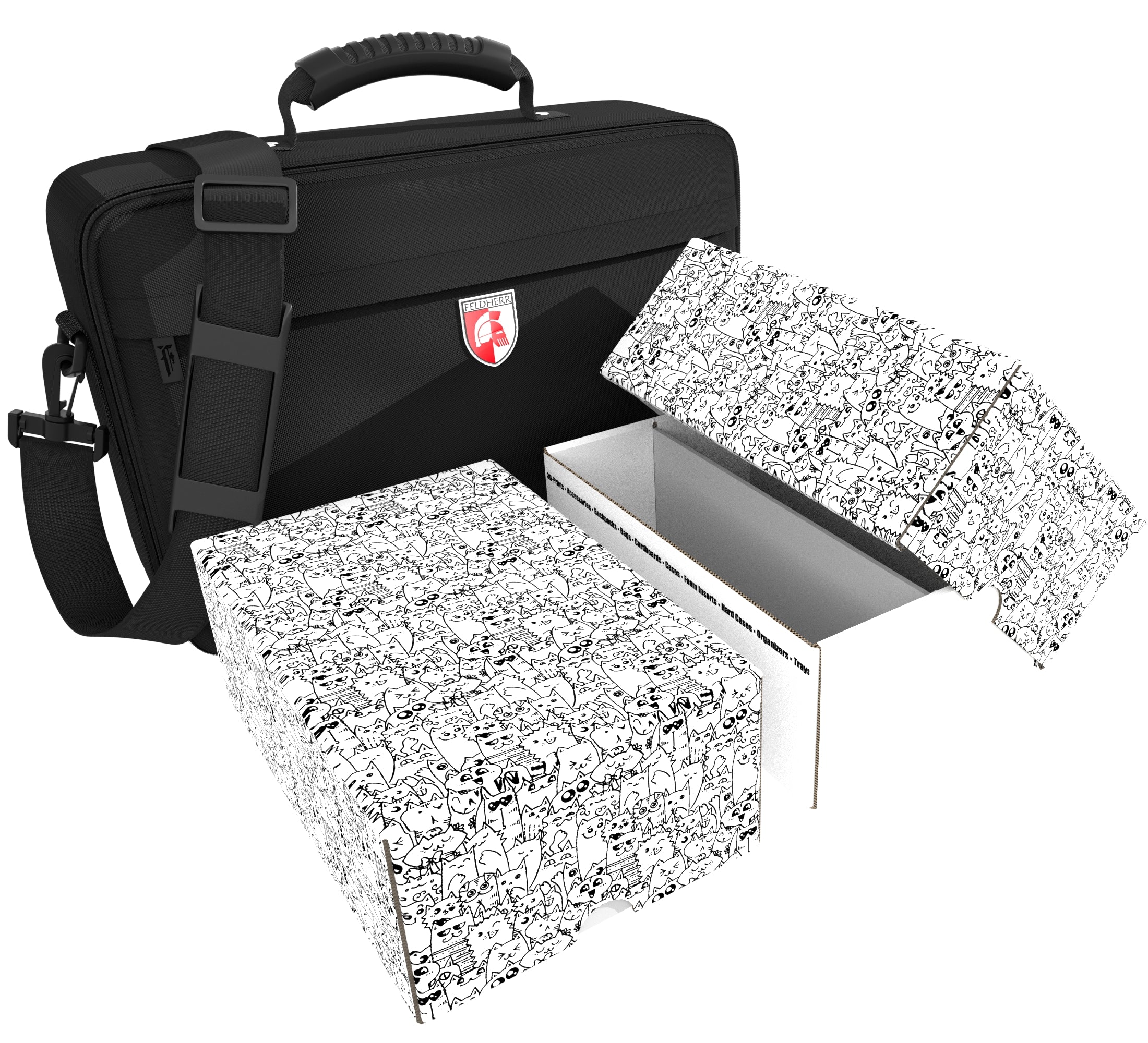 - The two stackable card boxes fit perfectly in the Feldherr MEDIUM bag and hold up to 1600 cards each (900 with protective sleeves*).