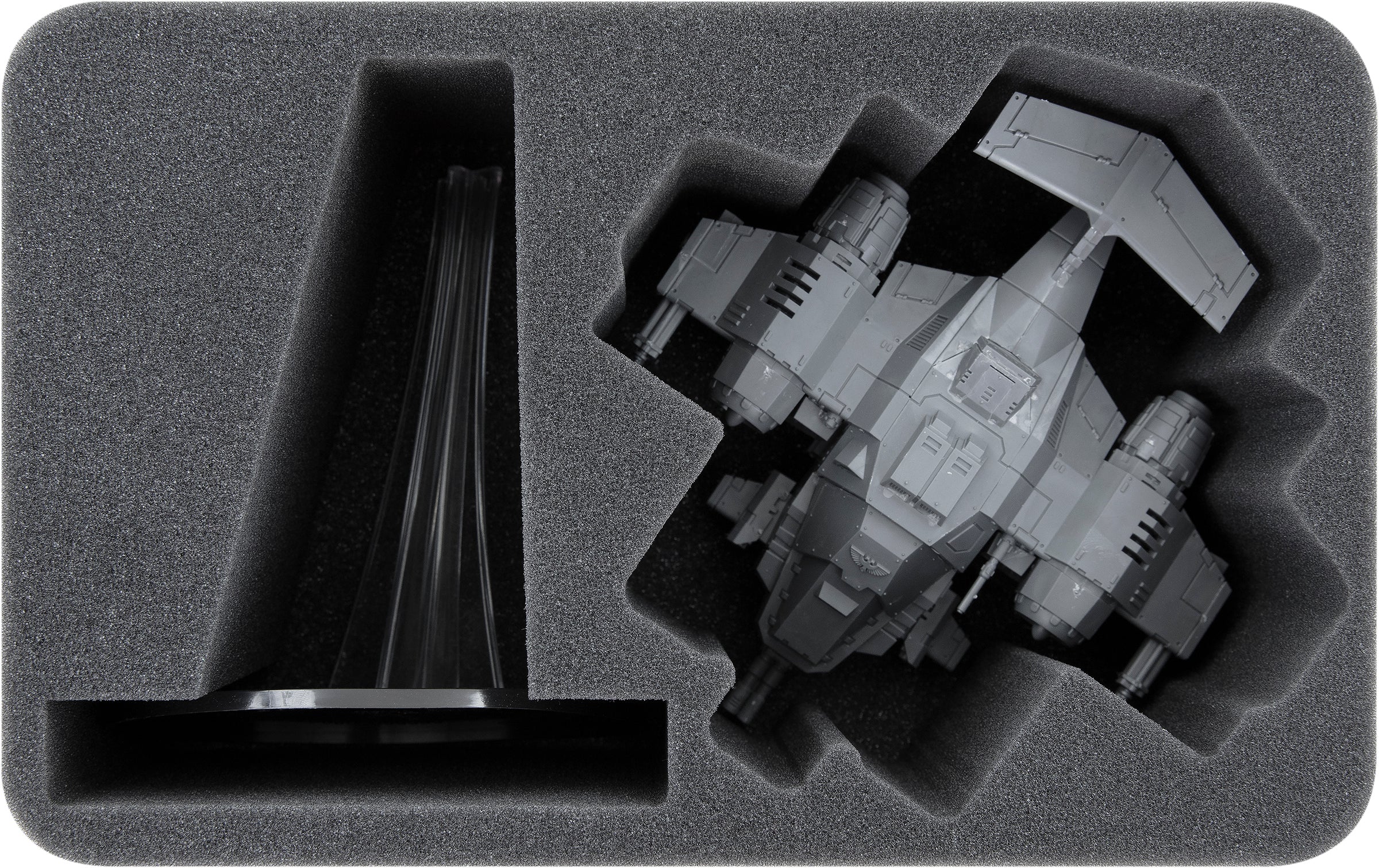 - 1 Half-Size foam tray with 2 compartments for one Stormtalon Gunship or Stormhawk Interceptor and its flying base (HSMESV105BO)